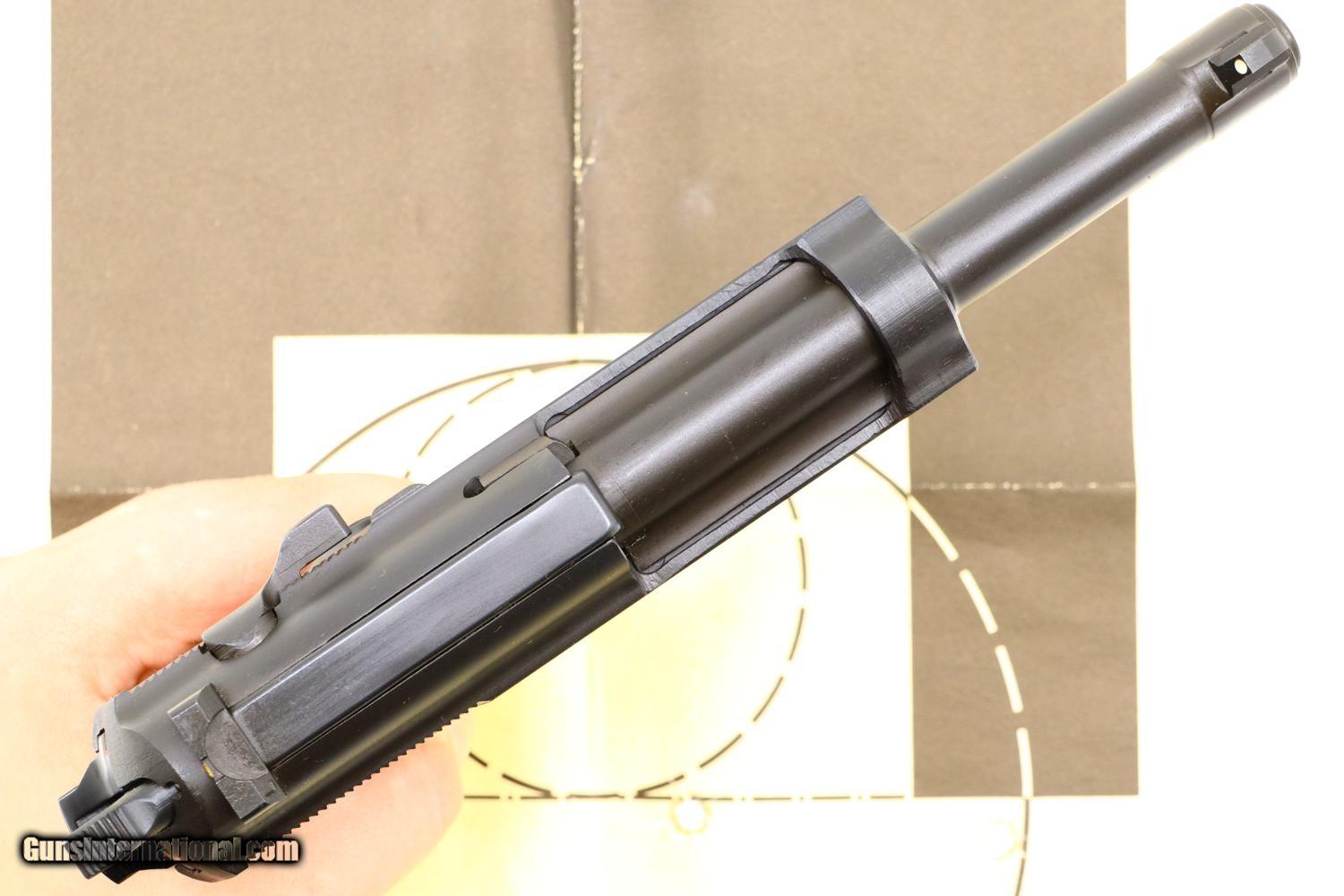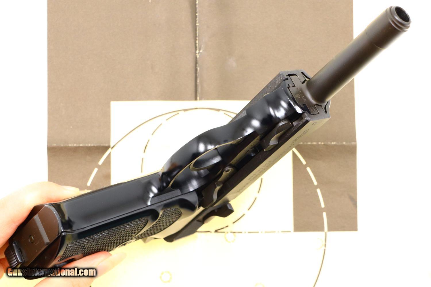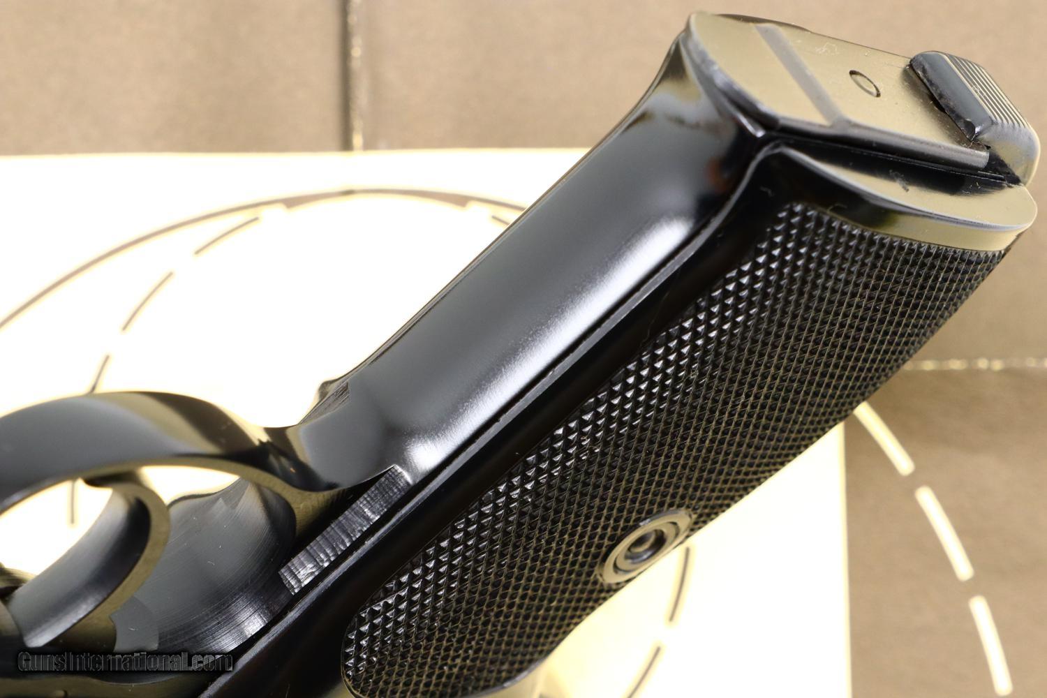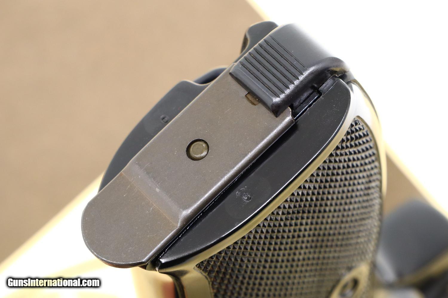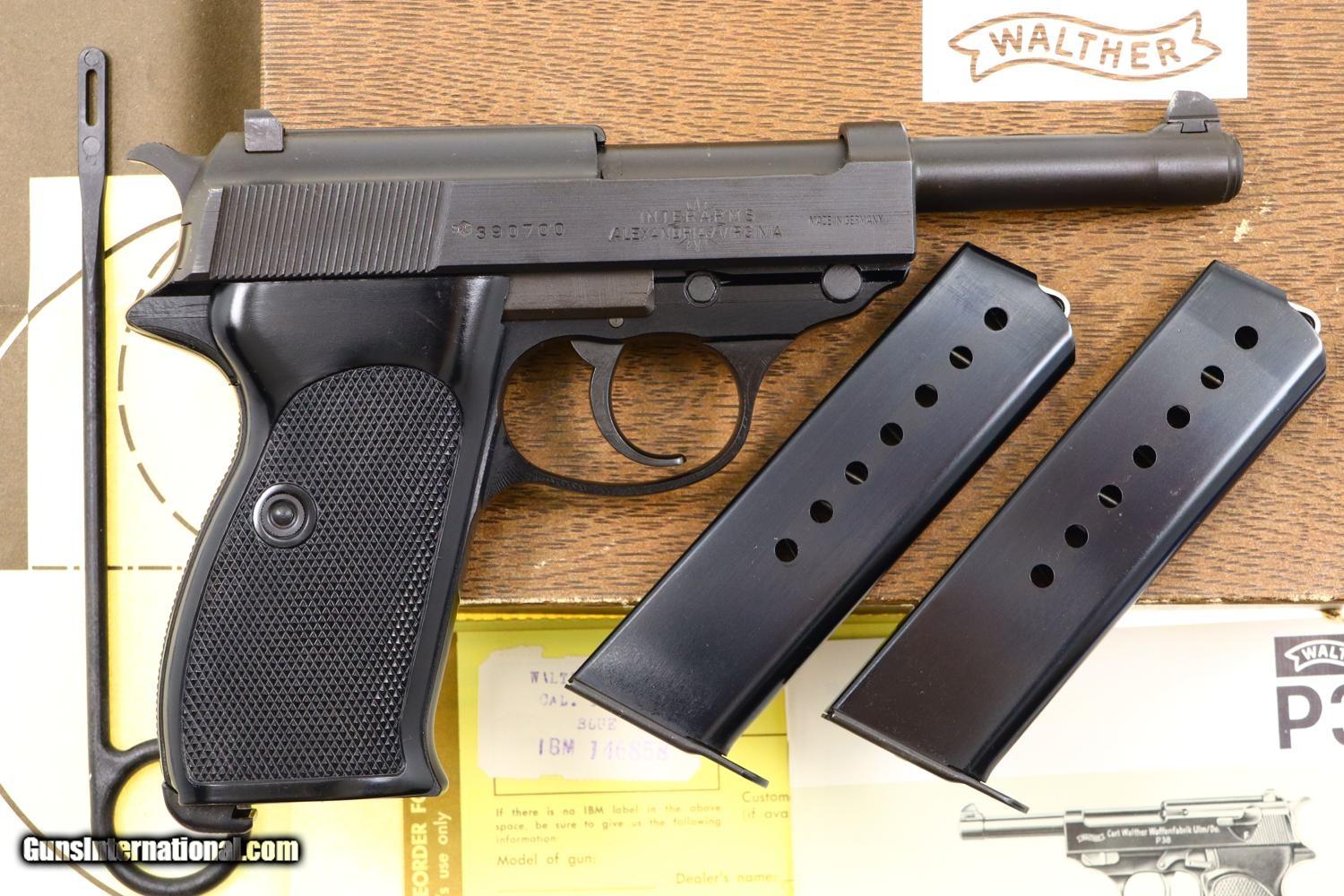 Description: Synopsis: Post War Walther P38, as NIB with accessories, 390700, FB01076 Description: As NIB Walther Post War P38, made 1976, with spare magazine, black plastic cleaning rod, instruction booklet, warranty card, matching test target in matching Walther shipping box. SN: 390700. Cal: 9mmP. Drift adjustable front sight and fixed rear sight, both with white highlights. Left side of slide with Walther banner followed by two line address. Left side of frame with full serial number over 76 year acceptance and Eagle/N. Right side of slide with full serial number, Interarms marking, and “Made in Germany”. Black plastic grips with bordered checkered panels on each side and over backstrap. Lanyard loop present. High polish magazines with left side marked with the Walther banner/P38/9mm. Complete with spare magazine, black plastic rod, instruction booklet, warranty card, matching test target in its original Walther brown cardboard shipping box with matching end label. NOTE: CONSECUTIVE PISTOL, NIB, POSTED AND OFFERED AT SAME PRICE! Condition: As new, a condition that applies to the pistol and all accessories. Box has a few shelf scuffs. ~~Insured shipping fee of $55; most packages shipped using FedEx 2nd Day.~~ SOLD Manufacturer: Walther Serial Number: 390700 Caliber Info: 9mmP |
