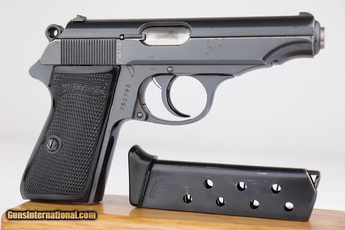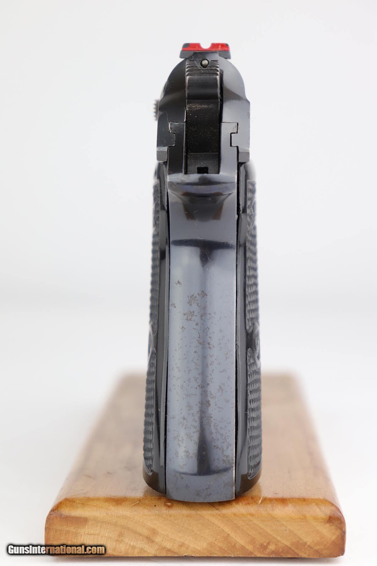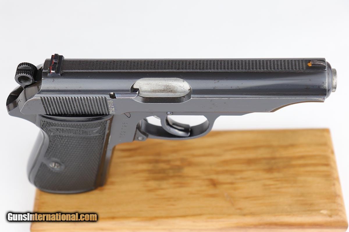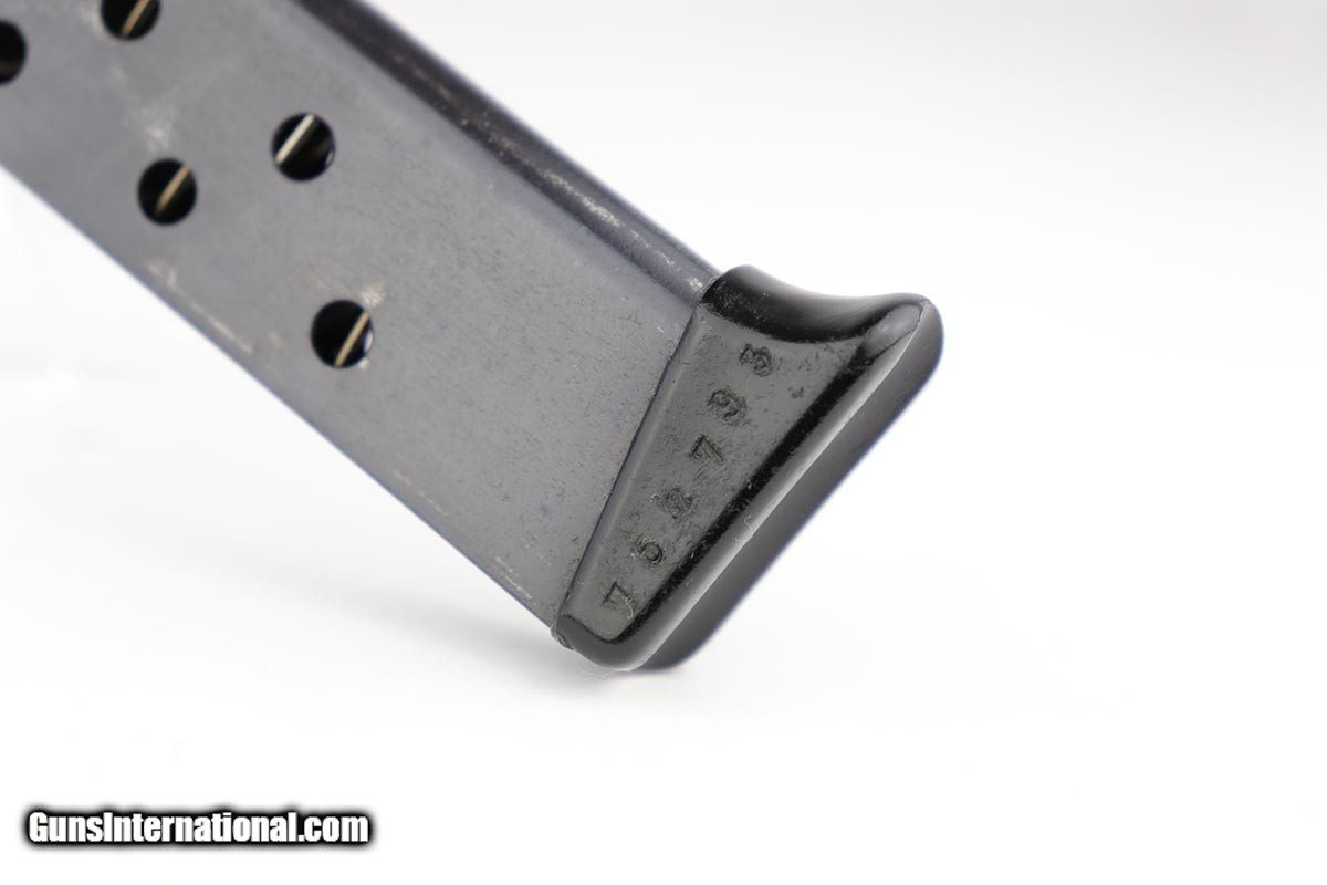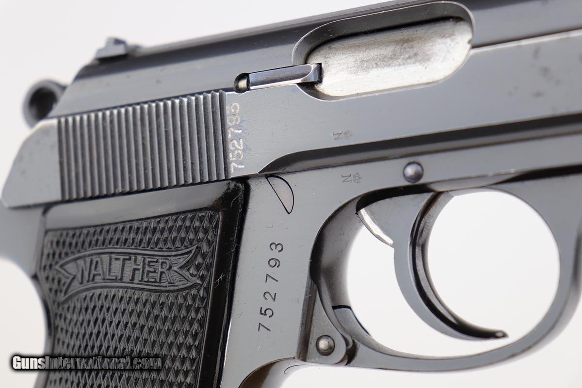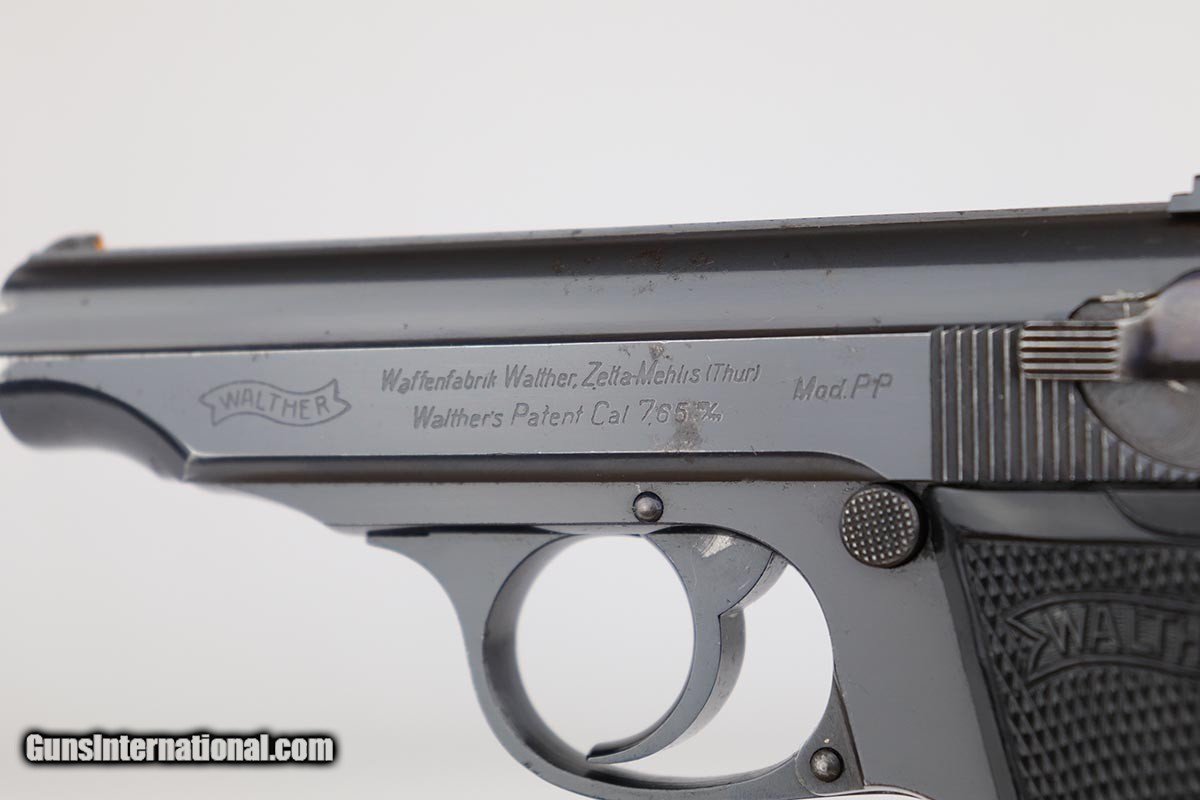 Description: This is a very early Walther PP issued to a bank for security/protection. The gun was most likely made in the first or second year of production (1929-30). It has the typical features of an early gun such as the placement of the crown/N proofs, the extended barrel, the 90 degree safety and the enclosed, two-piece firing pin. It also has early weighted grips and an early slab side magazine. It also has the BANK gun contract features, namely the painted sites, the vertically numbered slide (pantographed numbering) and the numbered magazine which is on the side of the black finger extension. The condition of the gun is all original and matching. There is about 96-97% of the original finish remaining, however there are a few minor spots of corrosion. There is minor pinpricking on the grip straps and bit on the left side of the slide - mostly in the area of the Walther Legend. Overall though, a very nice example of an early Walther PP that was issued to a bank in the pre-Nazi era. SOLD Curio/Relic: Yes Manufacturer: Walther Model: PP Serial Number: 752793 Caliber Info: 7.65mm Bore: 9/10 Condition: 97% Manufacture Date: 1929-1930 |