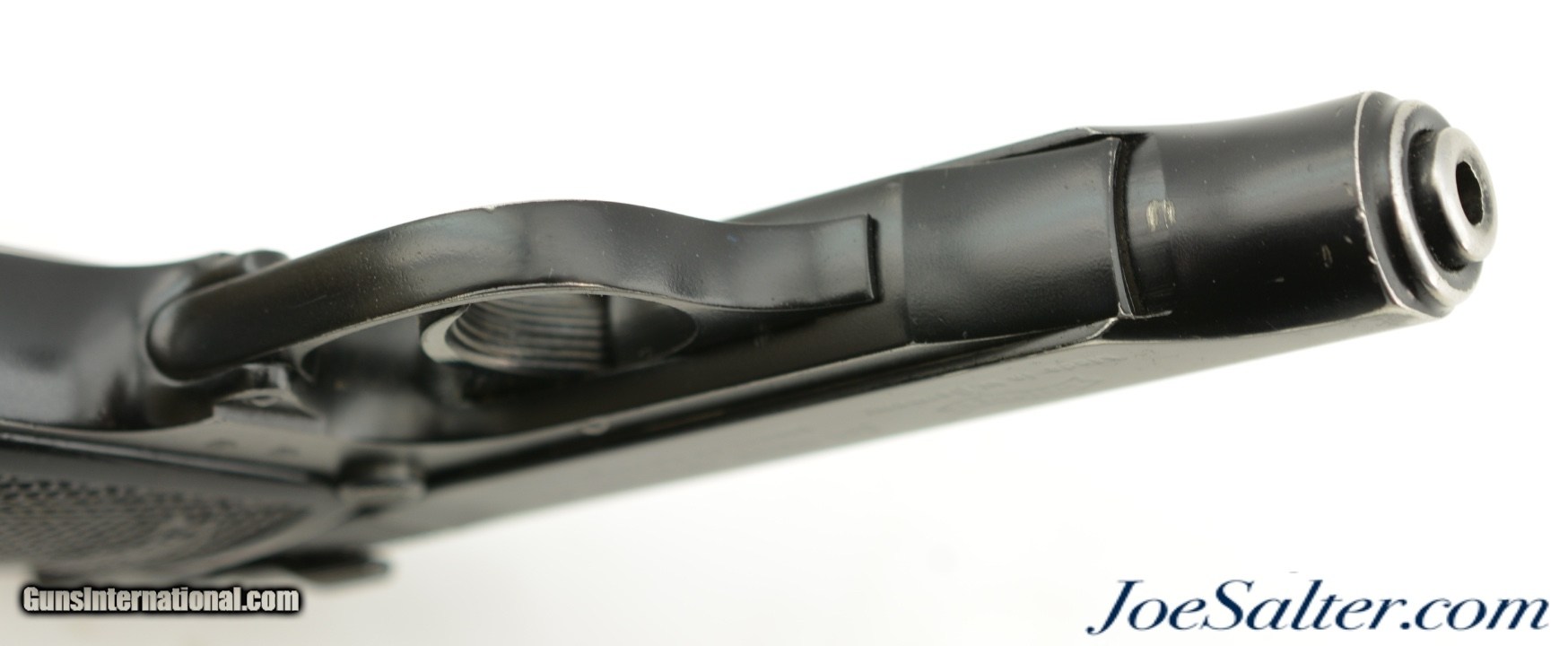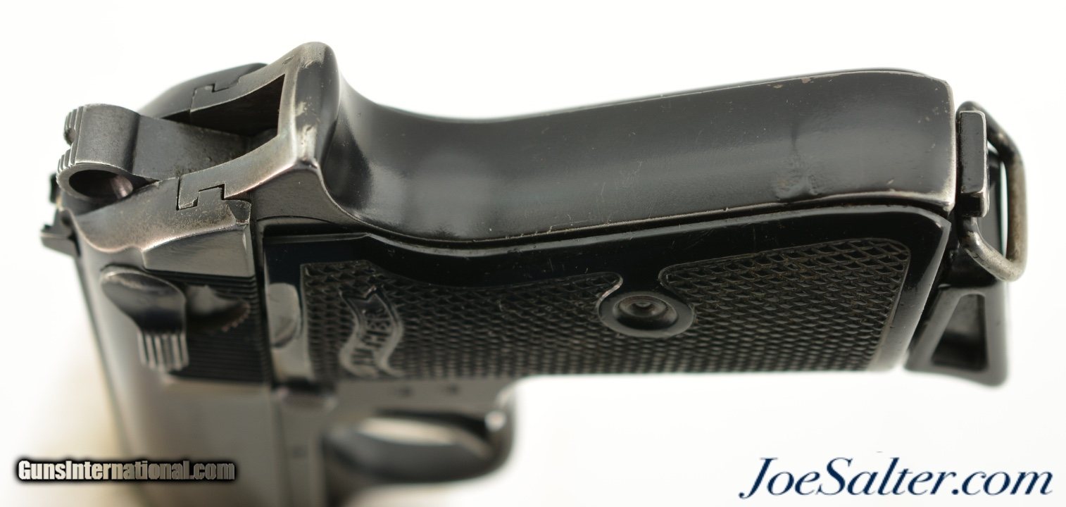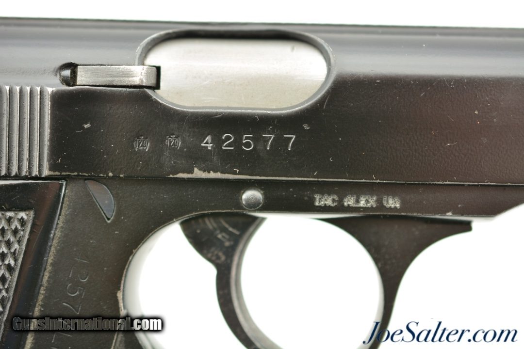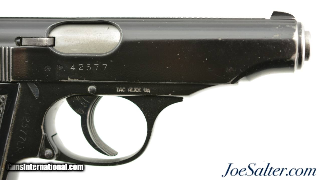 Description: Serial #42577LR, .22 LR, 3 ¾ inch barrel with a bright, excellent bore. This is a very interesting and rare British issued Walther Model PP semi-automatic DA/SA pistol purchased by the British Royal Army Ordnance Cops in 1974 and issued to service member of the Ulster Defense Regiment in Northern Ireland as self-defense weapons and is believed to be the only .22 caliber pistol ever issued by any military as a personal defense weapon. Designated as the British model L66A1 some 3,000 were purchased with approximately 1500 imported into the US by Interarms after they were sold off as Military Surplus in 1989 when replaced with other models such as the Walther P5 and SIG P230 as personal defense weapons. The British coated many of them with Suncorite and refitted with strengthened firing pins. The slide is typically marked if the firing pin was replaced, this particular example is not marked & likely did not receive a reinforced firing pin. It does have the issue lanyard loop and has the "IAC" import mark on the slide along with West German military proof marks. It remains in excellent condition with much of the Suncrolite coating showing some silvering at the muzzle and wear areas. The hard plastic Walther banner grips rate about excellent with light use marks. It comes with one original 10 round finger rest steel magazine. A rarely seen British military personal defense weapon used in Northern Ireland. FFL or C&R Curio/Relic: Yes Price: $1,295.00 Contact Seller |