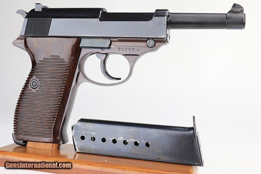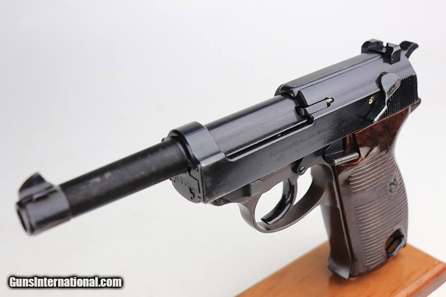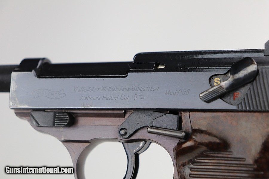 Description: This is an excellent, rare Walther Mod P.38 sold in the commercial market during WW2. This one is all matching and has the proper "Eagle N" proofs. This gun is rare as only 1,800 were produced. It has retained about 95% of its original bluing, with most of the bluing loss on the left side of the muzzle and front edge of slide. There's also two small patches of freckling on the right side of the slide. This one has a gorgeous, vibrant, plum-colored frame. It comes with excellent red grips and a 'jvd' magazine. The bore is mint. SOLD Handgun Caliber: 9x19mm Parabellum (9mm Luger, 9x19mm NATO) Bore: 10/10 Condition: ~95% |
