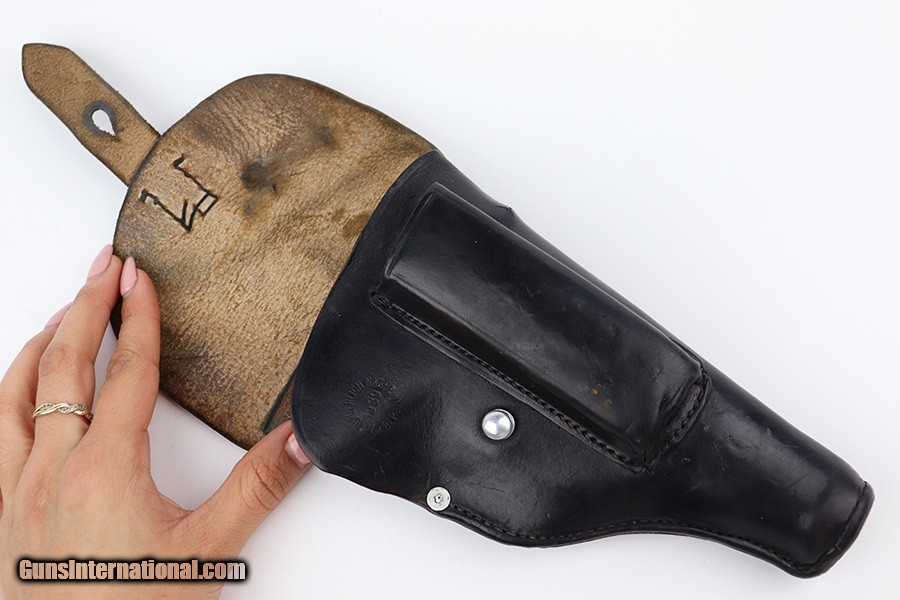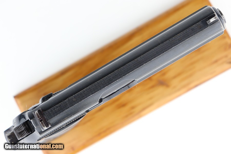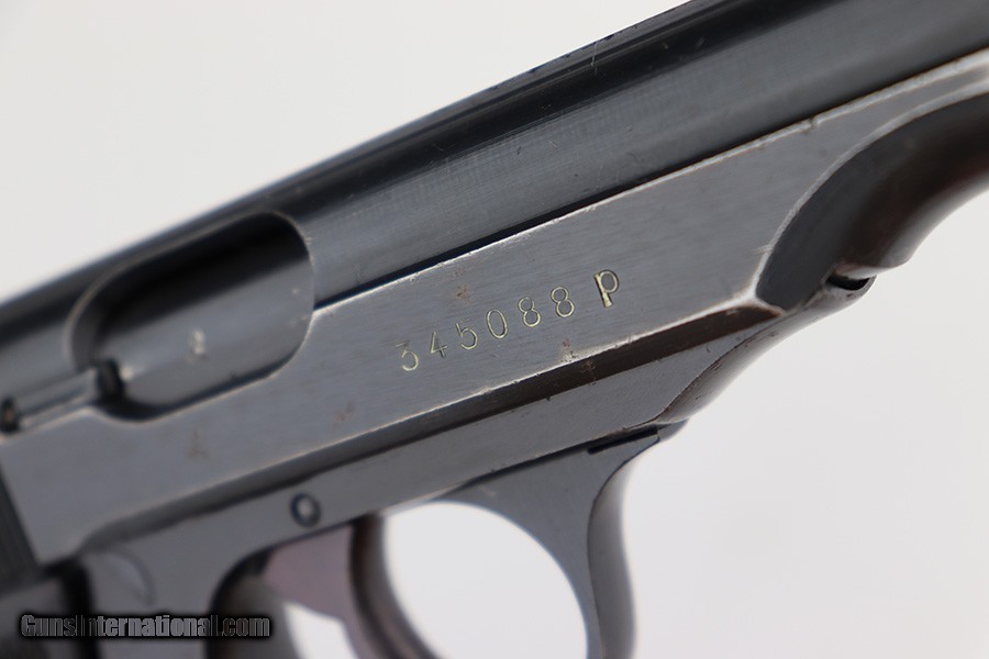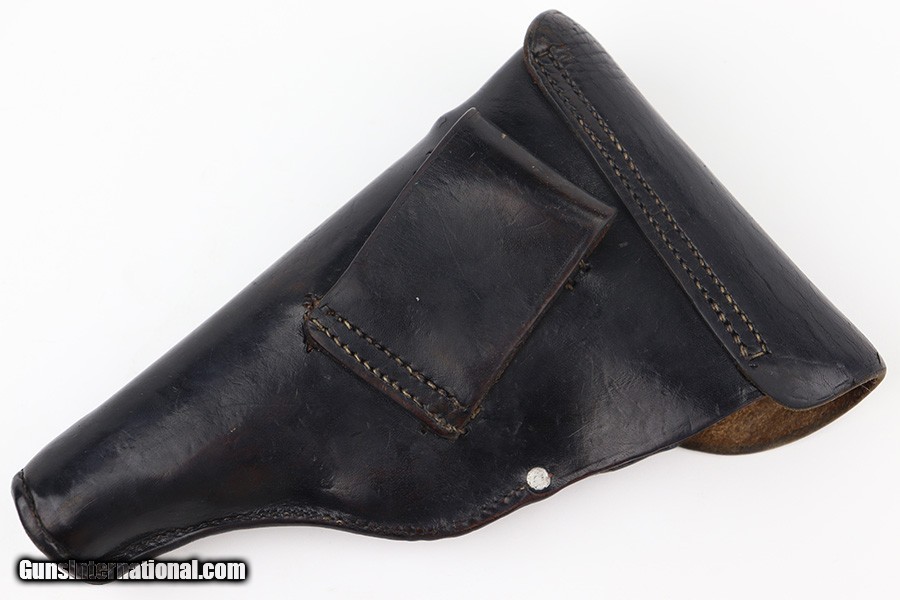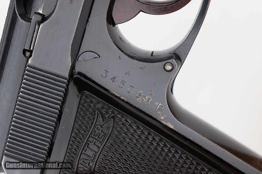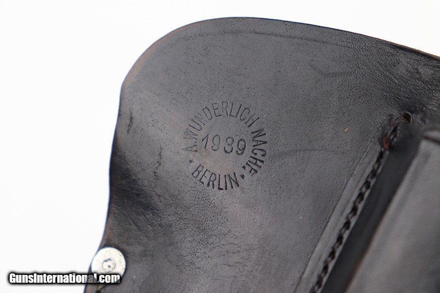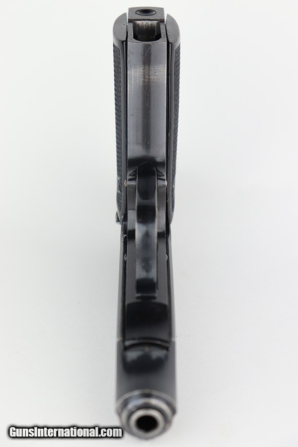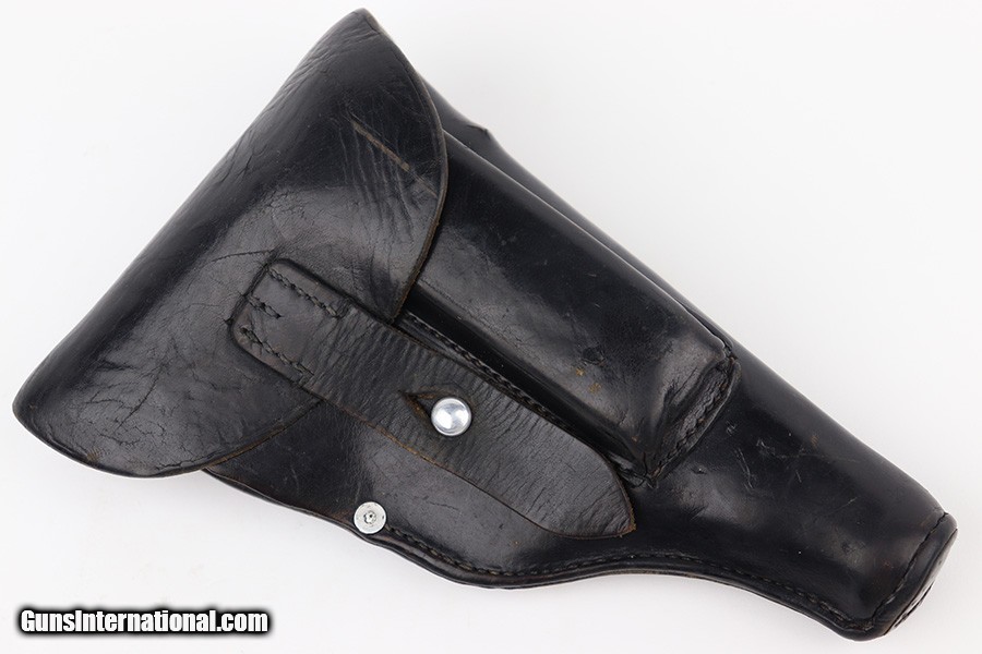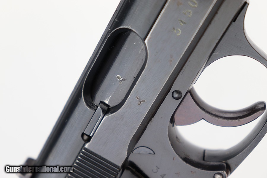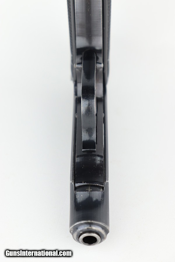 Description: This is an excellent example of a rare Walther PP issued to the Nazi police force in 1944. This one is all matching and has a police "Eagle C" marking on the left side of the frame. Only about 2,000 of this variation were made, as opposed to the more common "Eagle F" variant (about 5,000 made). This one comes as a rig with a 1939-dated police-style black leather holster and two period-correct wartime magazines. The gun itself has retained about 96-97% of its original bluing. There is minor muzzle wear and very light spotty wear along both sides of the slide, concentrated mostly around the high edges. There are a couple of small areas of minor wear at the base of each of the grip straps. A few tiny dots of discoloration on both sides of the frame. Comes with period-correct black bakelite grips. The bore is near-mint. SOLD Curio/Relic: Yes Handgun Caliber: .32 ACP (7.65x17mm Browning SR) |