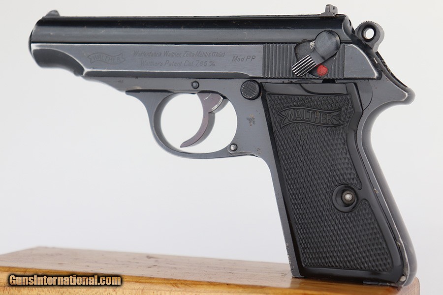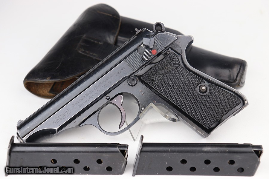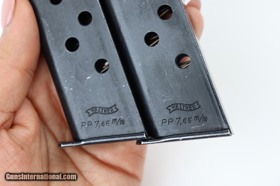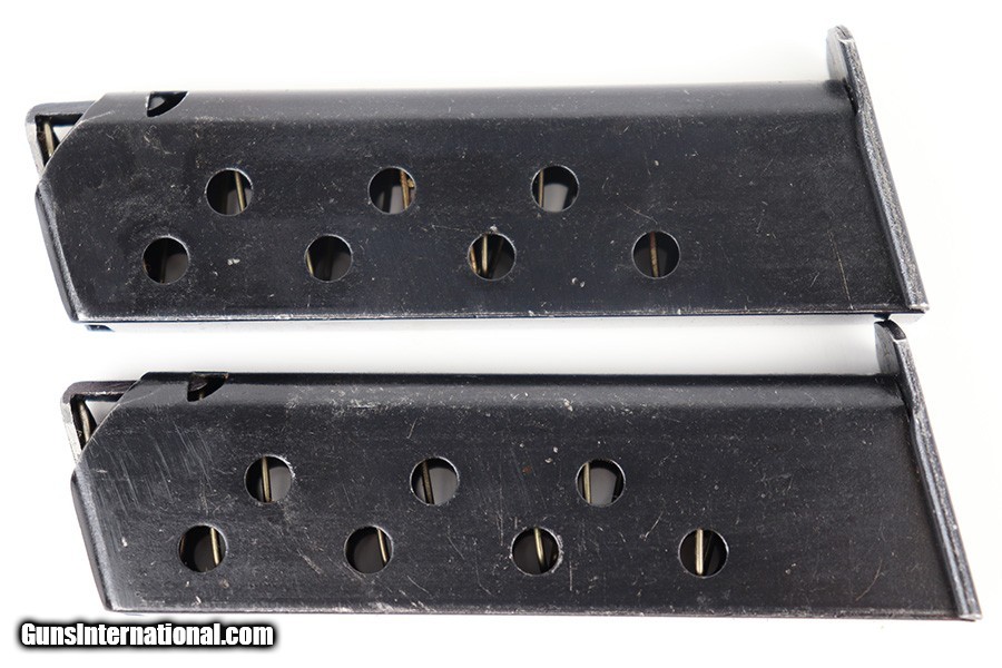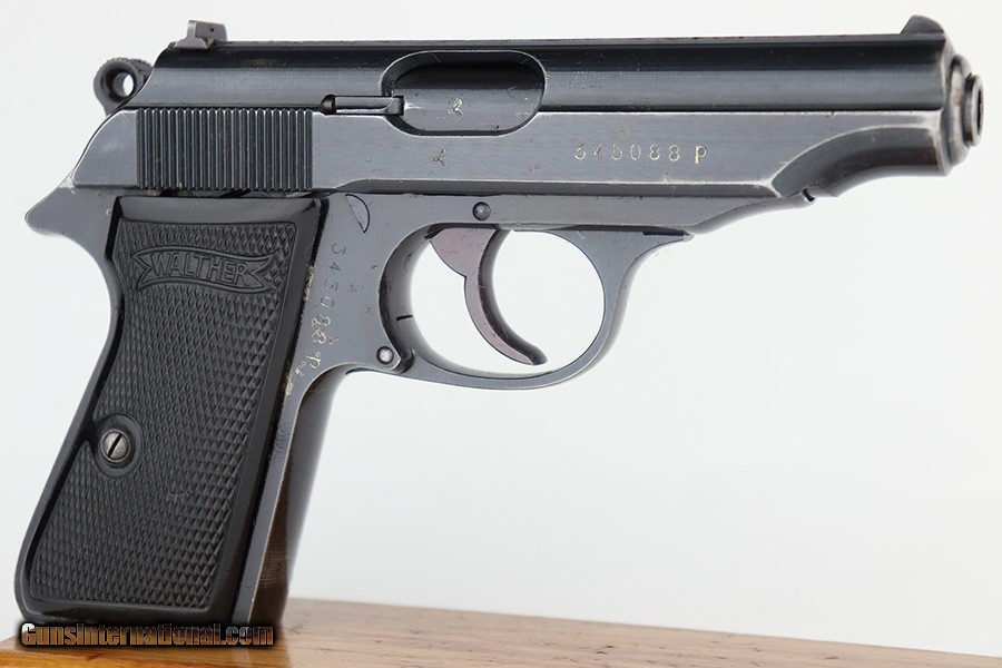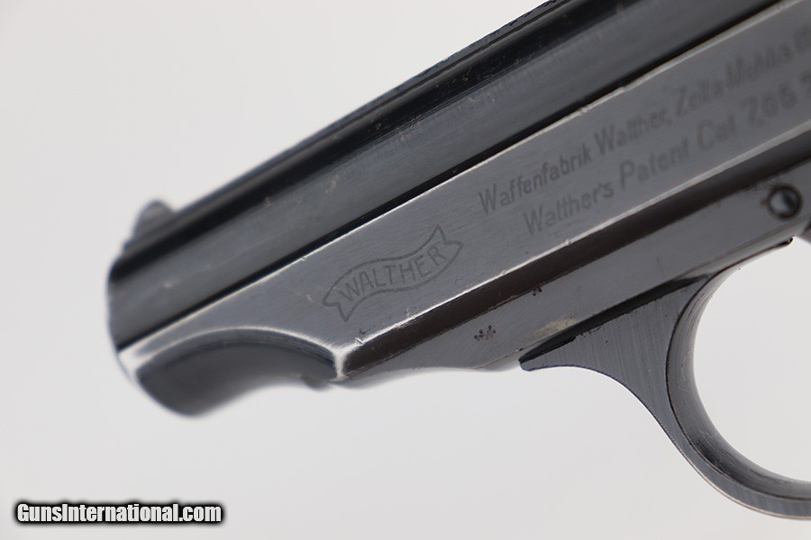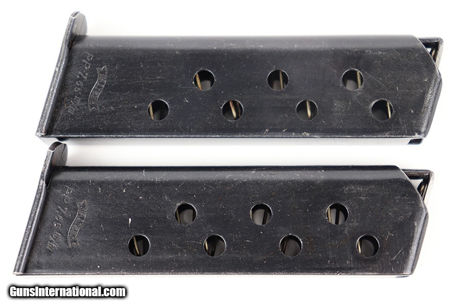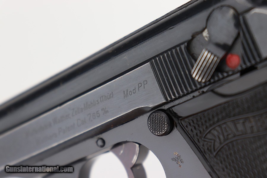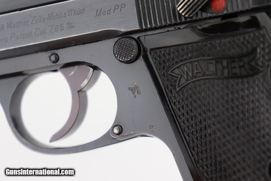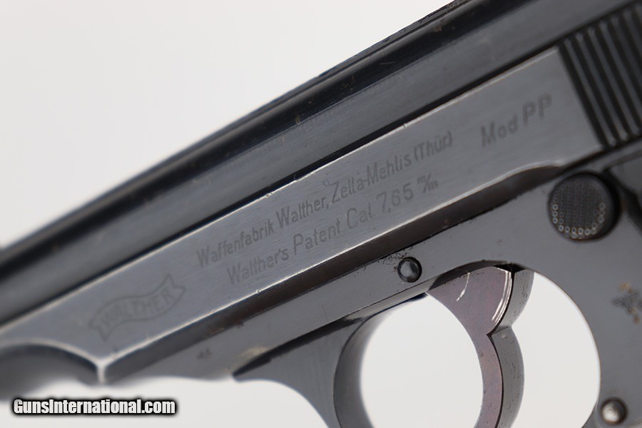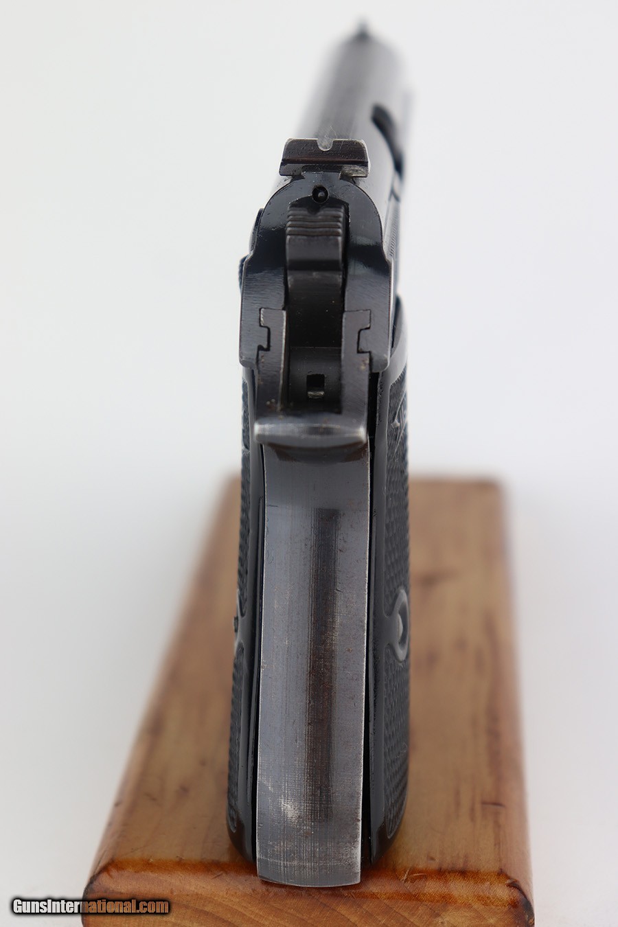 Description: This is an excellent example of a rare Walther PP issued to the Nazi police force in 1944. This one is all matching and has a police "Eagle C" marking on the left side of the frame. Only about 2,000 of this variation were made, as opposed to the more common "Eagle F" variant (about 5,000 made). This one comes as a rig with a 1939-dated police-style black leather holster and two period-correct wartime magazines. The gun itself has retained about 96-97% of its original bluing. There is minor muzzle wear and very light spotty wear along both sides of the slide, concentrated mostly around the high edges. There are a couple of small areas of minor wear at the base of each of the grip straps. A few tiny dots of discoloration on both sides of the frame. Comes with period-correct black bakelite grips. The bore is near-mint. SOLD Curio/Relic: Yes Handgun Caliber: .32 ACP (7.65x17mm Browning SR) |