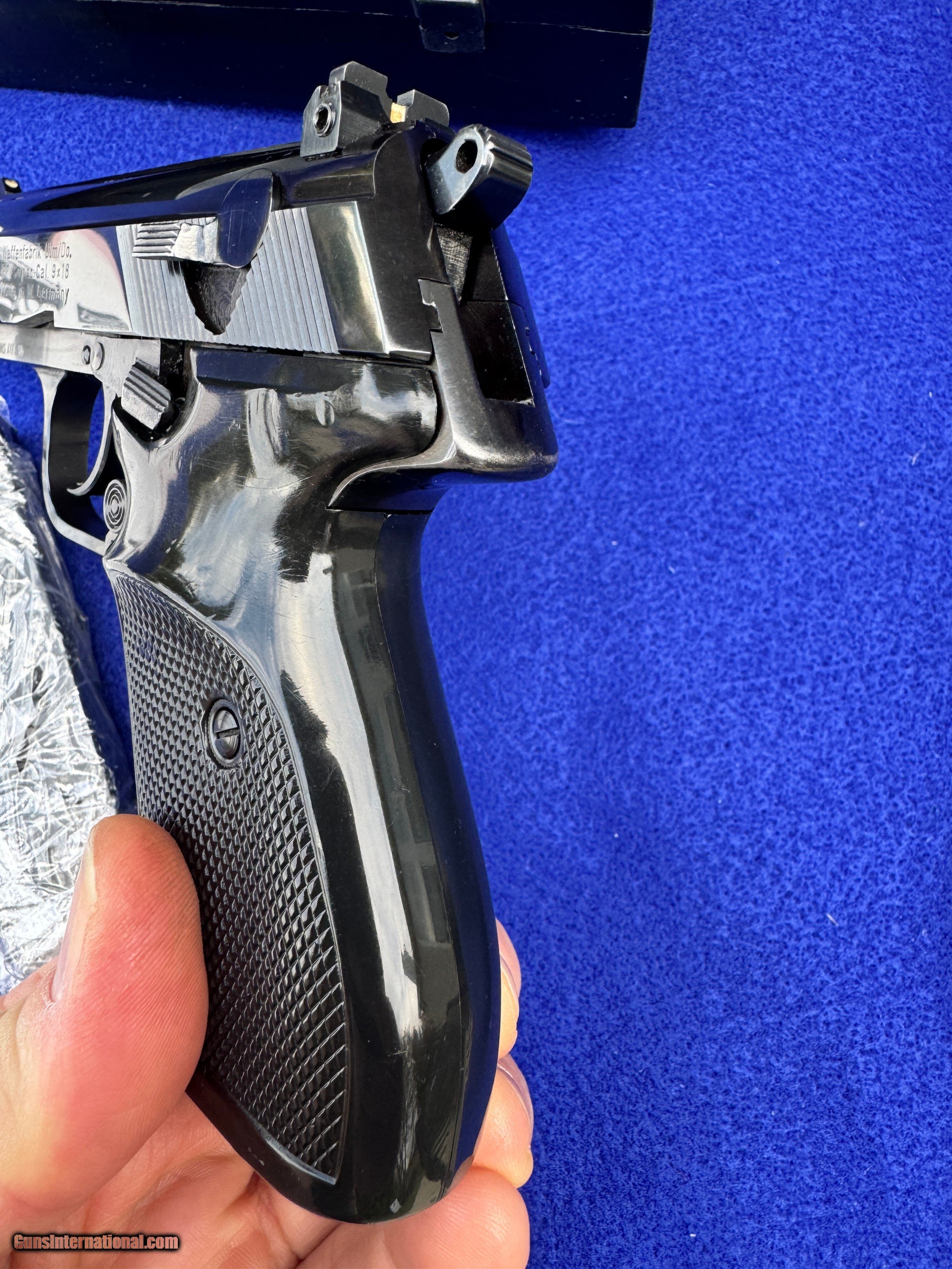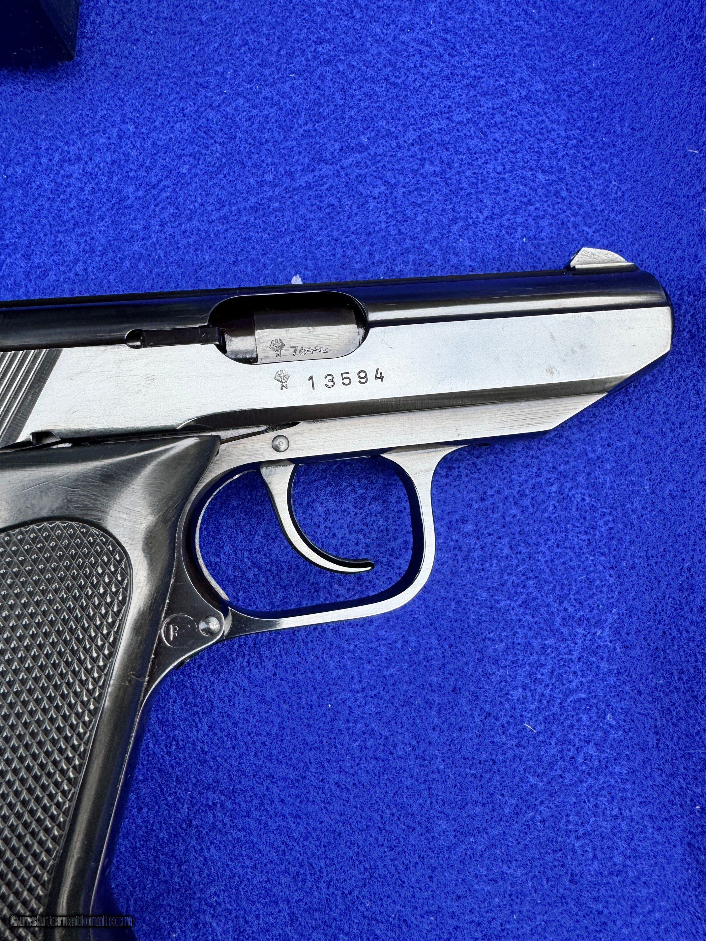 Description: Excellent, non common Walther PP Super chambered in 9x18 Ultra or Police. This is not interchangeable with 9x18 Makorov. This cartridge uses a slightly smaller projectile and has a shorter case length. These pistols were made exclusively for West German Police and only were produced to the total of about 4,000 in the 1970's. This example was made in 1976, is in it's factory matched box with 2xmanuals and 2 magazines. One still in wrap. The pistol features a 3.6" barrel, high polish blue finish and black plastic, checkered grips. It is imported by Interarms and has three locations where the standard Eagle/N Proofs appear. Double action with exposed hammer and a safety/decocker on the slide. Steel slide and lower receiver. Fixed barrel design for accuracy and typical PP field strip. The finish on this gun rates extremely high at about 99% with a mint bore.