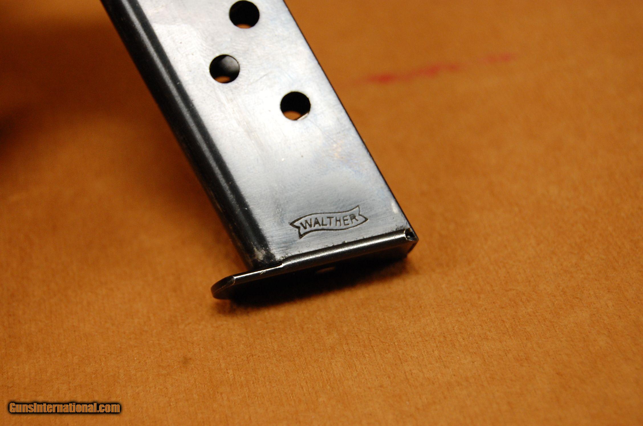 Description: This is a Walther PP in incredible condition with an absolutely mint original holster and two magazines. The frame, barrel, and chamber are correctly marked with Crown N proofs. The front strap is marked "R.J.", which stands for Reich Justice Ministry, or the Justice Department of the Nazi Party. This gun was likely to have been carried by a judge, prosecutor, or other official of the Nazi court system-- individuals most certainly in need of protection. Chambered in .32 ACP, this gun has the early style 90 degree safety. The pistol is correctly matching with the last 3 digits of the serial number scribed inside the ejection port on the slide. There is very minor muzzle wear from the holster. All of the wear is confined to the high edges of the gun, with two small spots of finish loss on the front grip strap. However, this doesn't detract from the overall appeal of the pistol. The original grips are perfect and without cracks or chips. This is a rather scarce and collectible sidearm that was carried by a Nazi government official. All items are also available for sale in our brick & mortar store and are subject to prior sale. Think long, think wrong. We are always buying unique and collectible single firearms and collections. Please give us a call at 859-278-8370 to discuss what you have available. We also offer free appraisals and guarantee TOP DOLLAR PAID for your unique and collectible firearms. Payment On firearms, we typically only accept credit cards or money orders/cashier's checks.