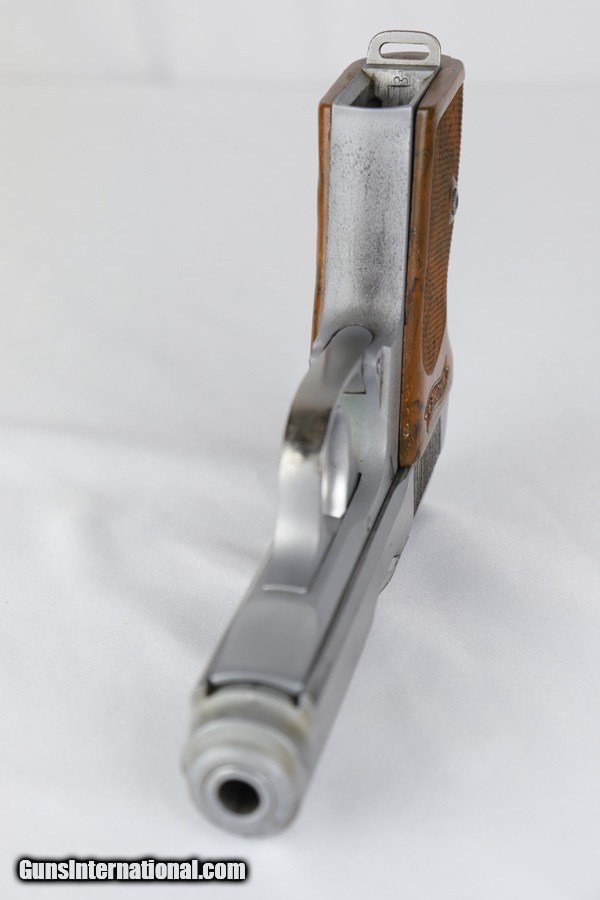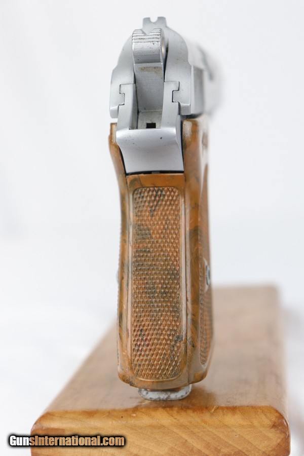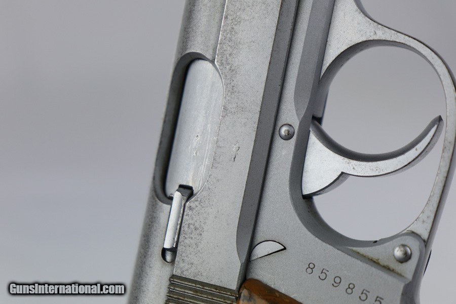 Description: This is a rare Verchromt Walther PPK in very good original condition that retains about 85% of its original finish. Very few PPKs were finished in “verchromt”, which was Walther’s experiment in producing a variation of the plated finish - essentially a type of electrolysis plating that gave the gun a dull gray appearance. Unfortunately, it proved to be less durable than the standard blue finish and very few such guns were made in the early 30s. There is uniform thinning to the finish on the slide and frame. Comes with an excellent Verchromt magazine. Excellent bore. Grip has thin surface crack on right side. SOLD Curio/Relic: Yes Manufacturer: Walther Model: PPK Serial Number: 859855 Caliber Info: 7.65mm Bore: 9/10 Condition: 85% Manufacture Date: 1935 |