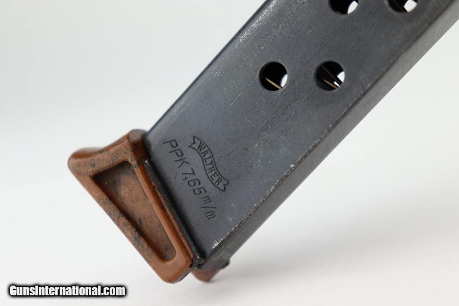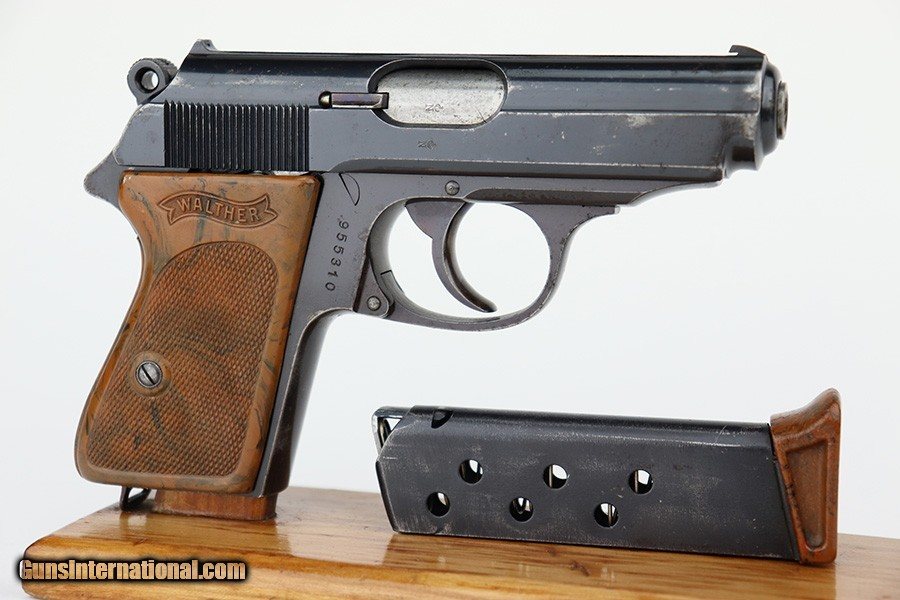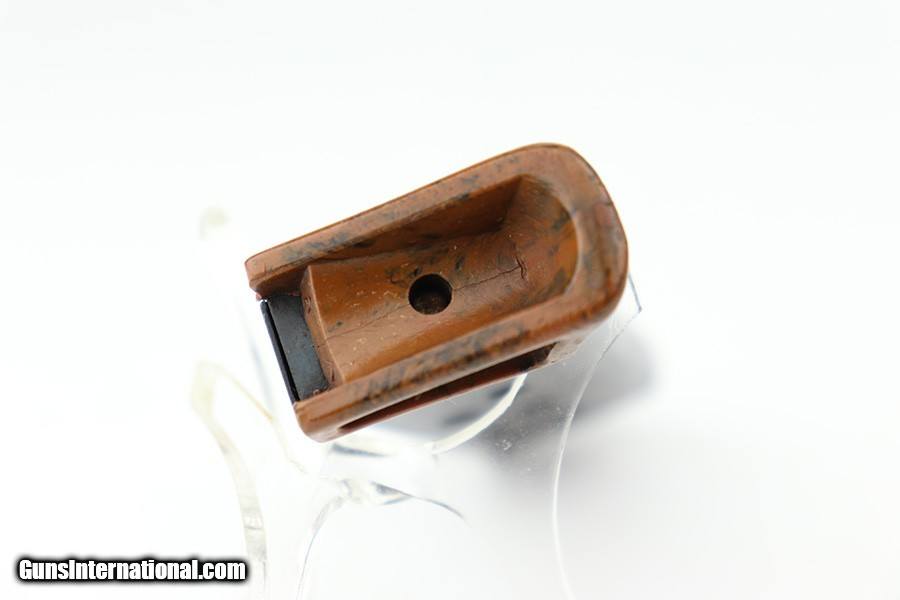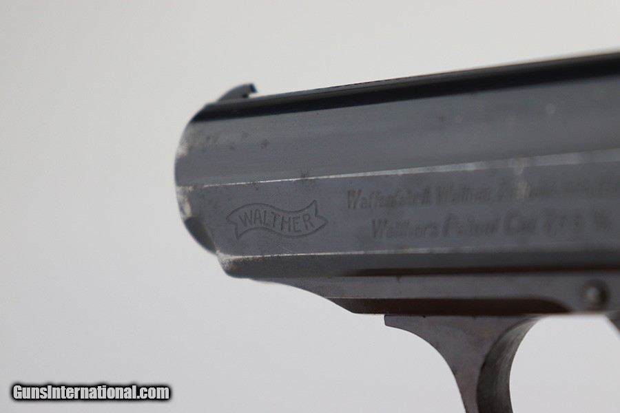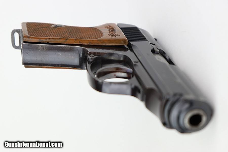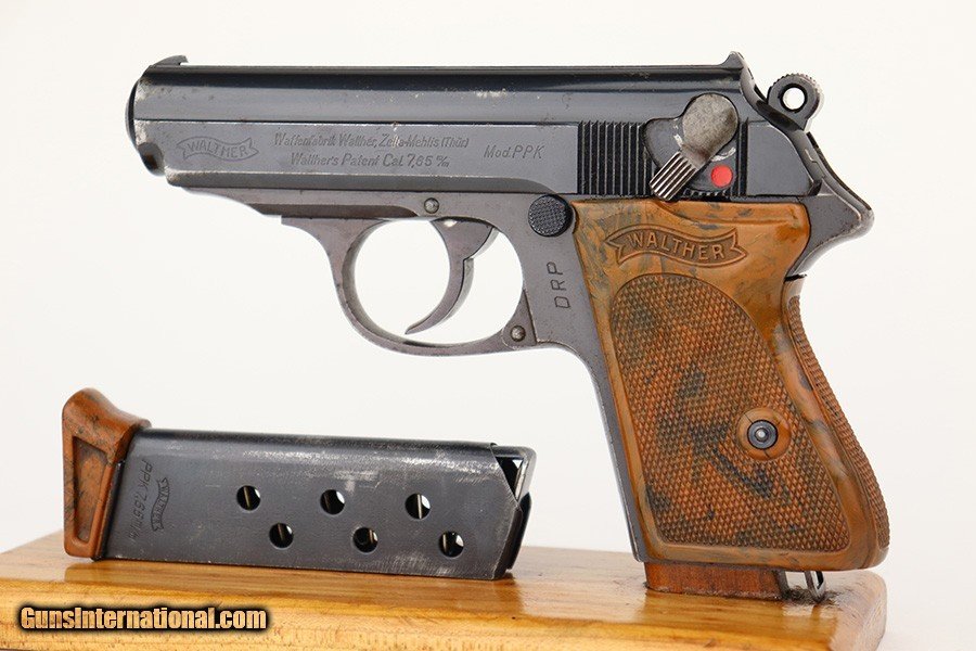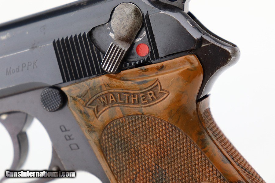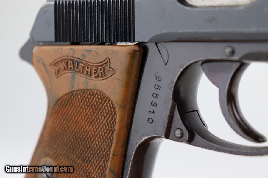 Description: This is a very rare Walther PPK with DRP-marked frame. Made in late 1936 or early 1937, these were issued to the Deutsche Reichspost, which was for the German postal inspectors. one of only ~1,000 ever made, this is a 2nd variation example with no periods in the DRP marking. The bluing is original with muzzle wear on each side of the slide, a little more on the rounded edges and front strap, and the fire blue is worn off the safety. Minty bore. The grip shows minor warping and a small corner crack in the corner of the spine. Comes with an excellent finger extension magazine. SOLD Curio/Relic: Yes Handgun Caliber: .32 ACP (7.65x17mm Browning SR) |