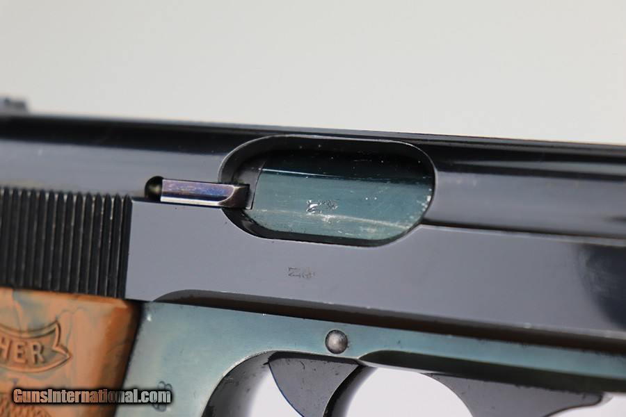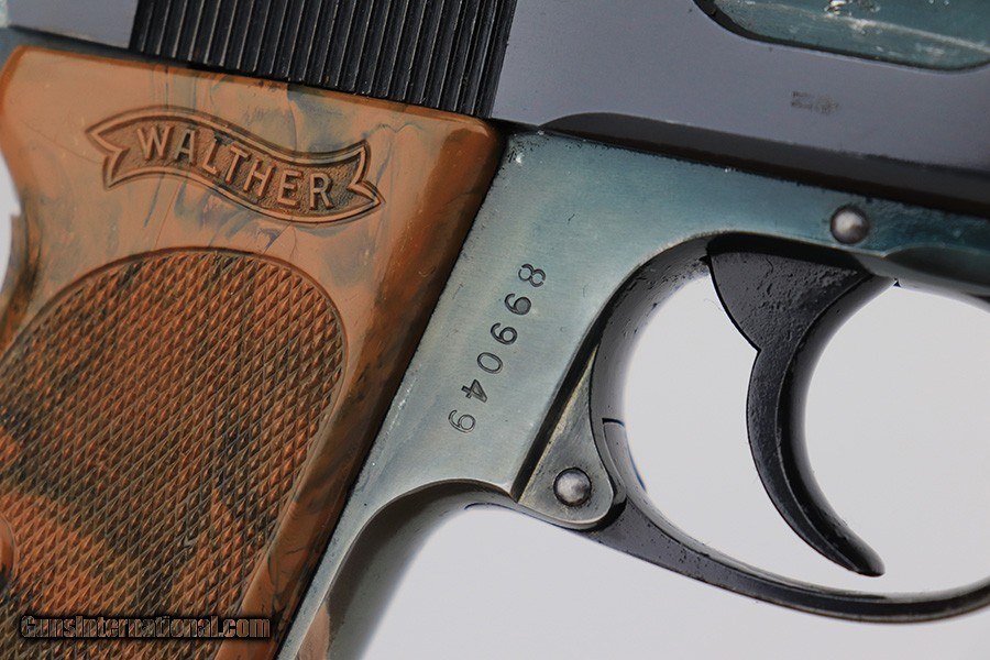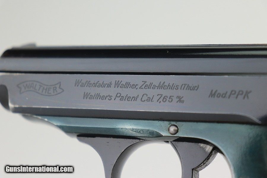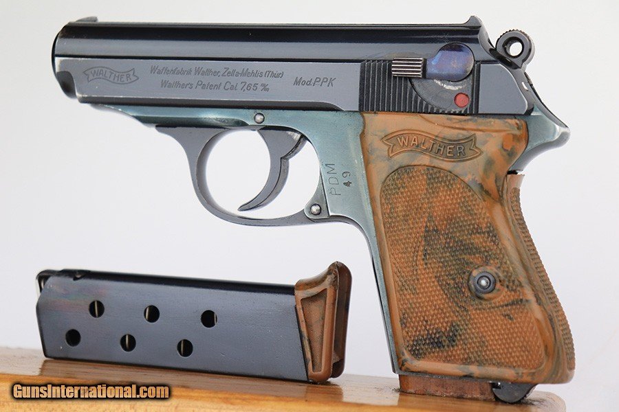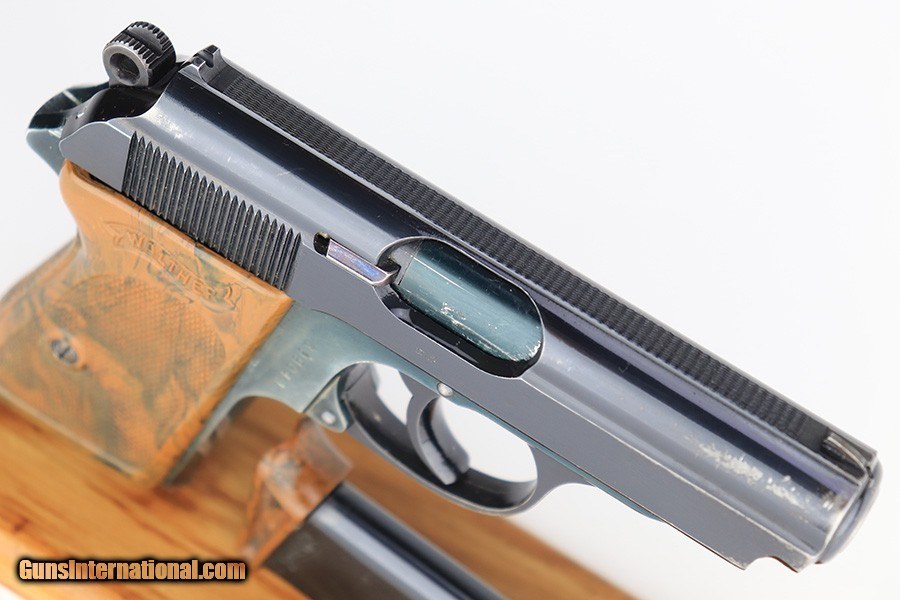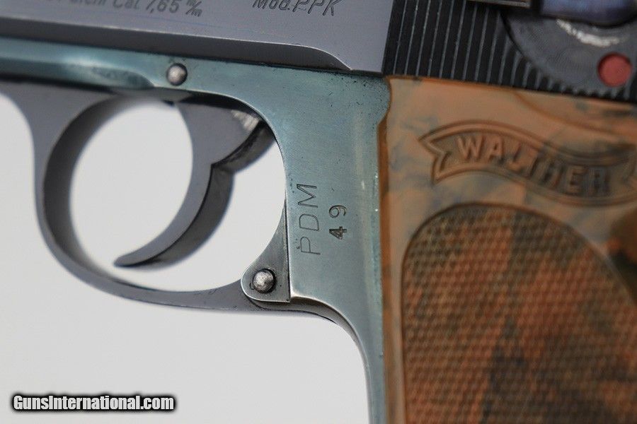 Description: This is a very tough to find PDM marked Walther PPK, as we only get about one or two per year. The PDM's were issued to the Police Dept. of Munich, under the direction of Heinrich Himmler. It has a number of rare features such as the aluminum frame (dural), bottom release magazine and a fluted barrel. The original finish is about 92% with some light spotty wear around the muzzle, general thinning in the anodized finish on the frame, and a couple of streaks of wear on the front strap. Mint bore. Grip has no major cracks and the finger extension is excellent. SOLD Curio/Relic: Yes Handgun Caliber: 7.65x22mm Parabellum (7.65x22mm Luger, .30 Luger) |