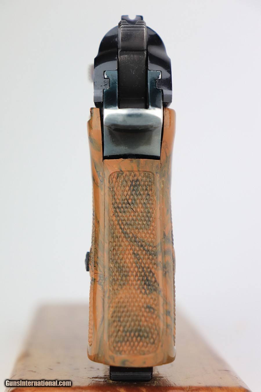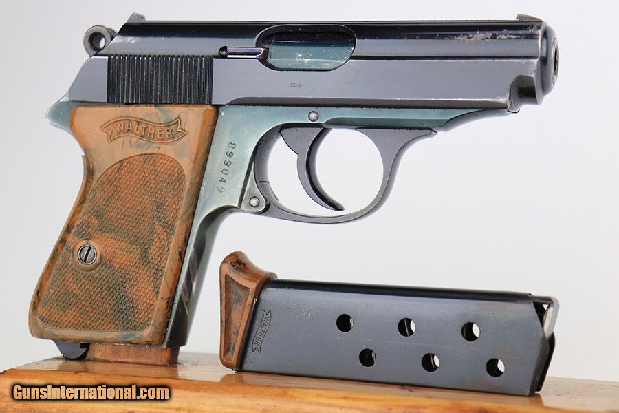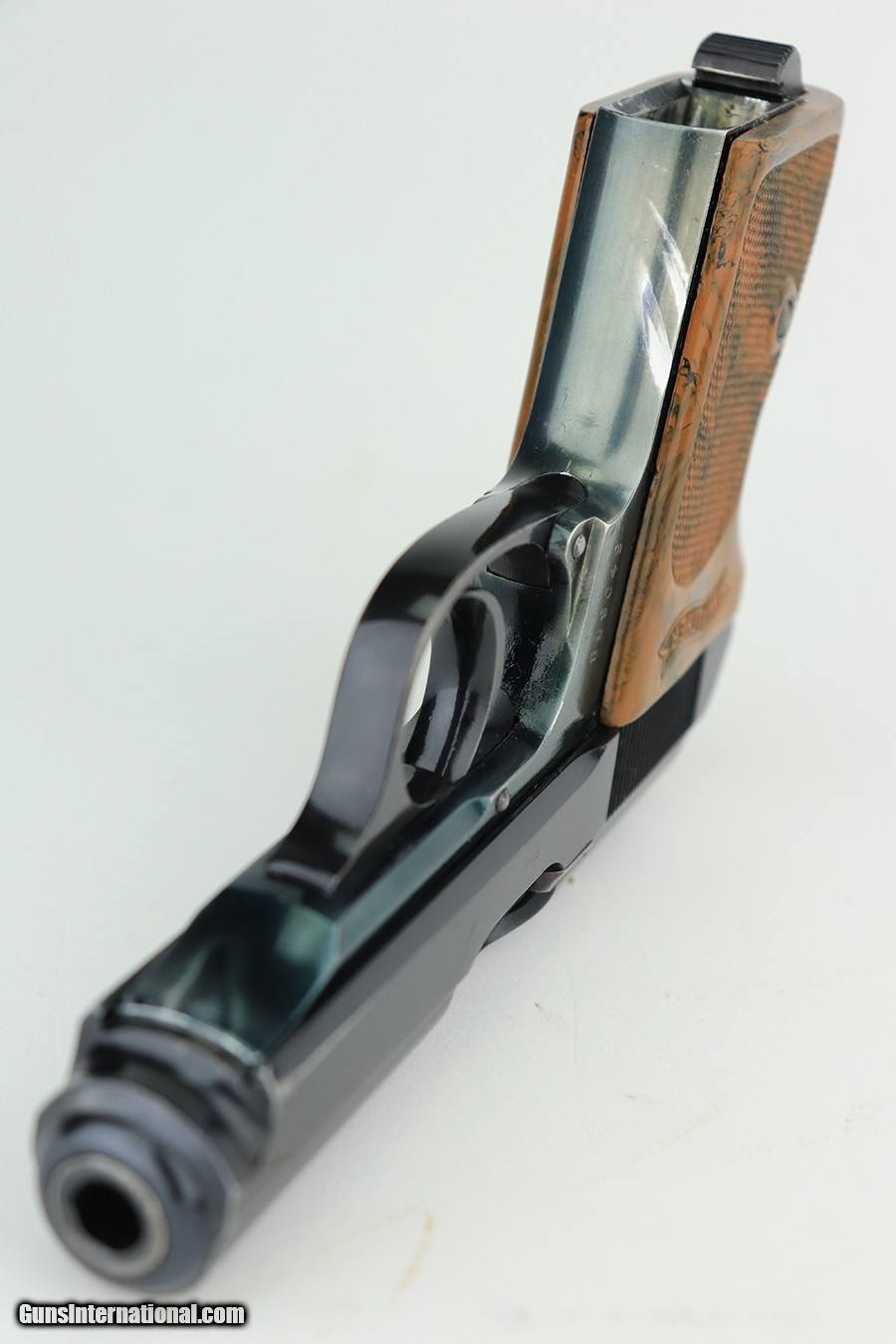 Description: This is a very tough to find PDM marked Walther PPK, as we only get about one or two per year. The PDM's were issued to the Police Dept. of Munich, under the direction of Heinrich Himmler. It has a number of rare features such as the aluminum frame (dural), bottom release magazine and a fluted barrel. The original finish is about 92% with some light spotty wear around the muzzle, general thinning in the anodized finish on the frame, and a couple of streaks of wear on the front strap. Mint bore. Grip has no major cracks and the finger extension is excellent. SOLD Curio/Relic: Yes Handgun Caliber: 7.65x22mm Parabellum (7.65x22mm Luger, .30 Luger) |