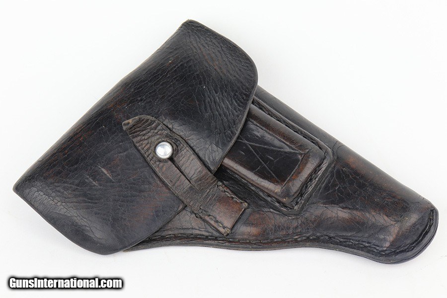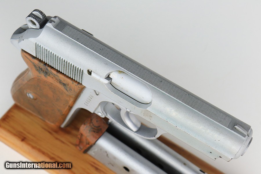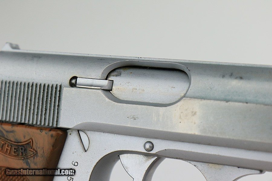 Description: This is a rare Verchromt Walther PPK in very good, original condition that retains about 90-92% of its original finish. Very few PPKs were finished in “verchromt”, which was Walther’s experiment in producing a variation of the plated finish - essentially a type of electrolysis plating that gave the gun a dull gray appearance. Unfortunately, it proved to be less durable than the standard blue finish and very few such guns were made in the early 30s. There is minor flaking of the finish on this pistol in a few areas, and visible oxidation on the front strap. Comes with one Verchromt magazine with beautiful finger extension, one flat bottom Verchromt magazine, and a black leather holster. The verchromt mags are very difficult to find, and both are in good shape. Minty bore. Excellent brown grip with no cracks. SOLD Curio/Relic: Yes Handgun Caliber: 7.65x22mm Parabellum (7.65x22mm Luger, .30 Luger) |