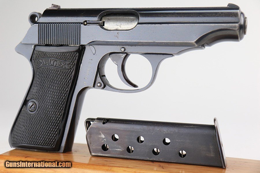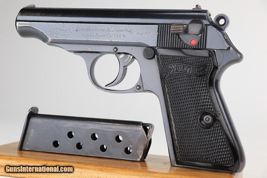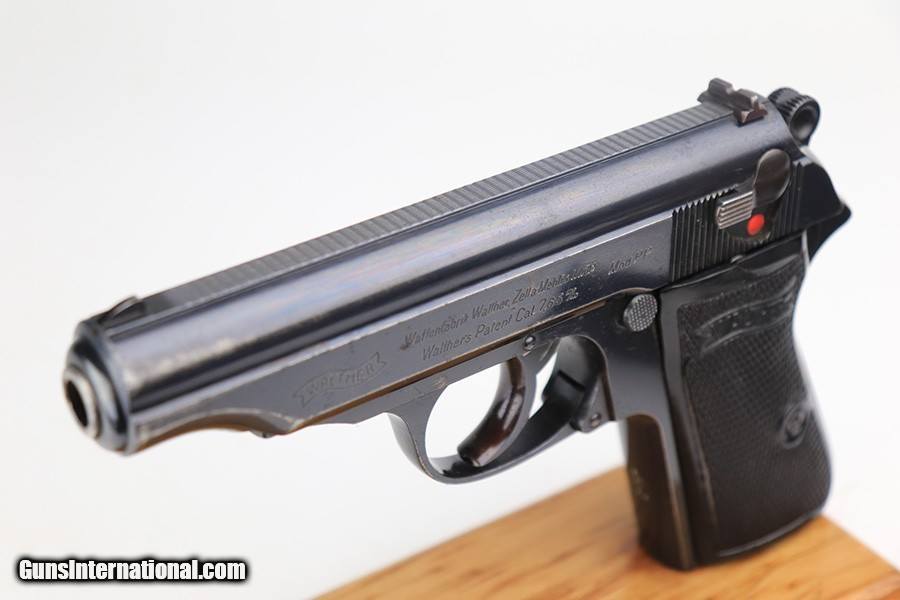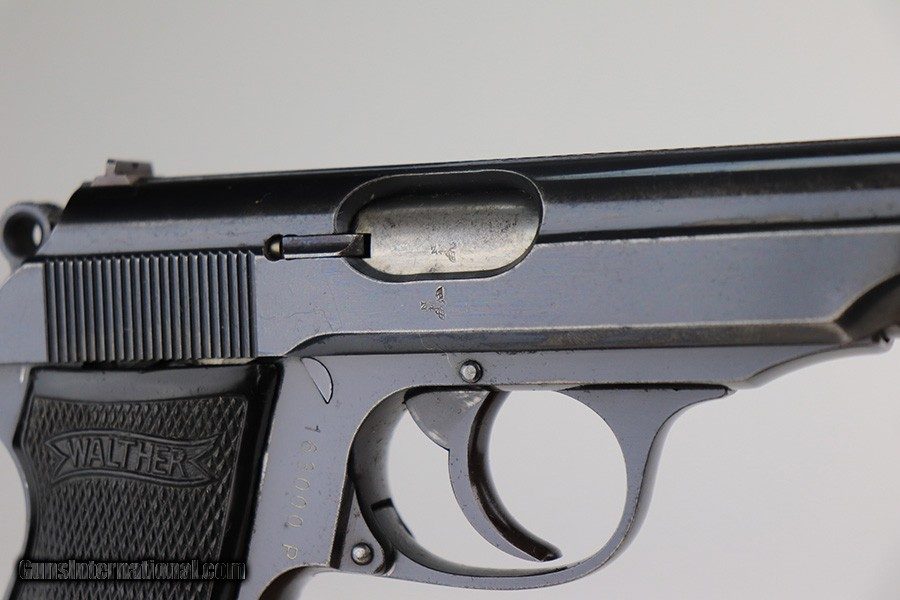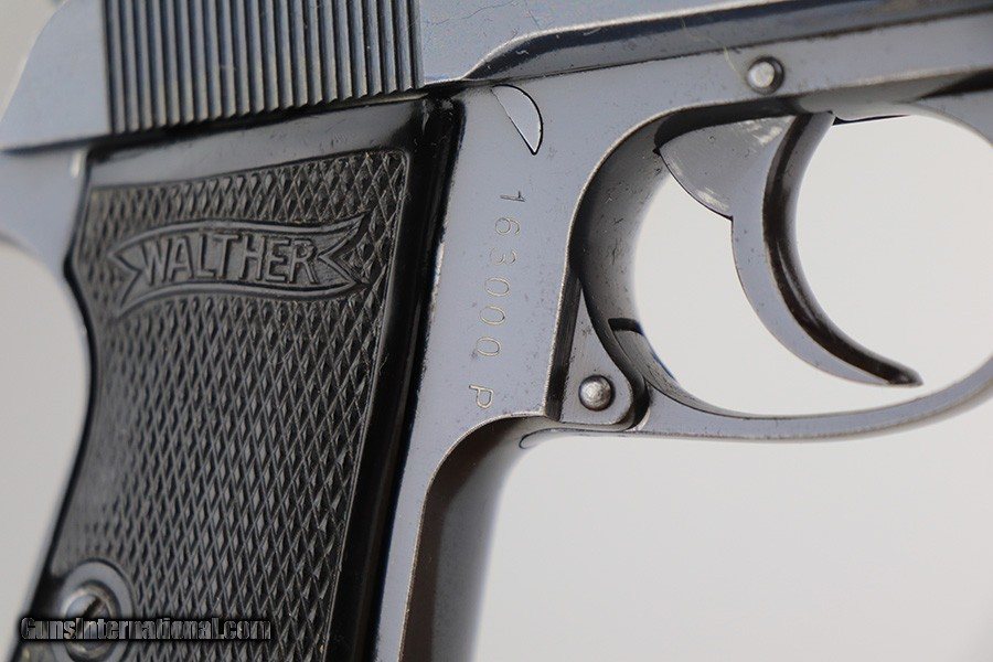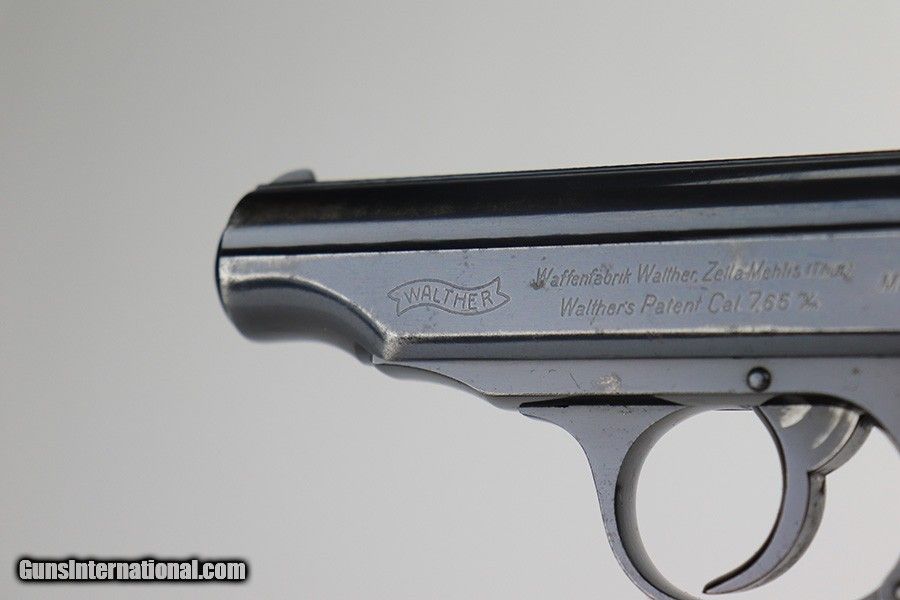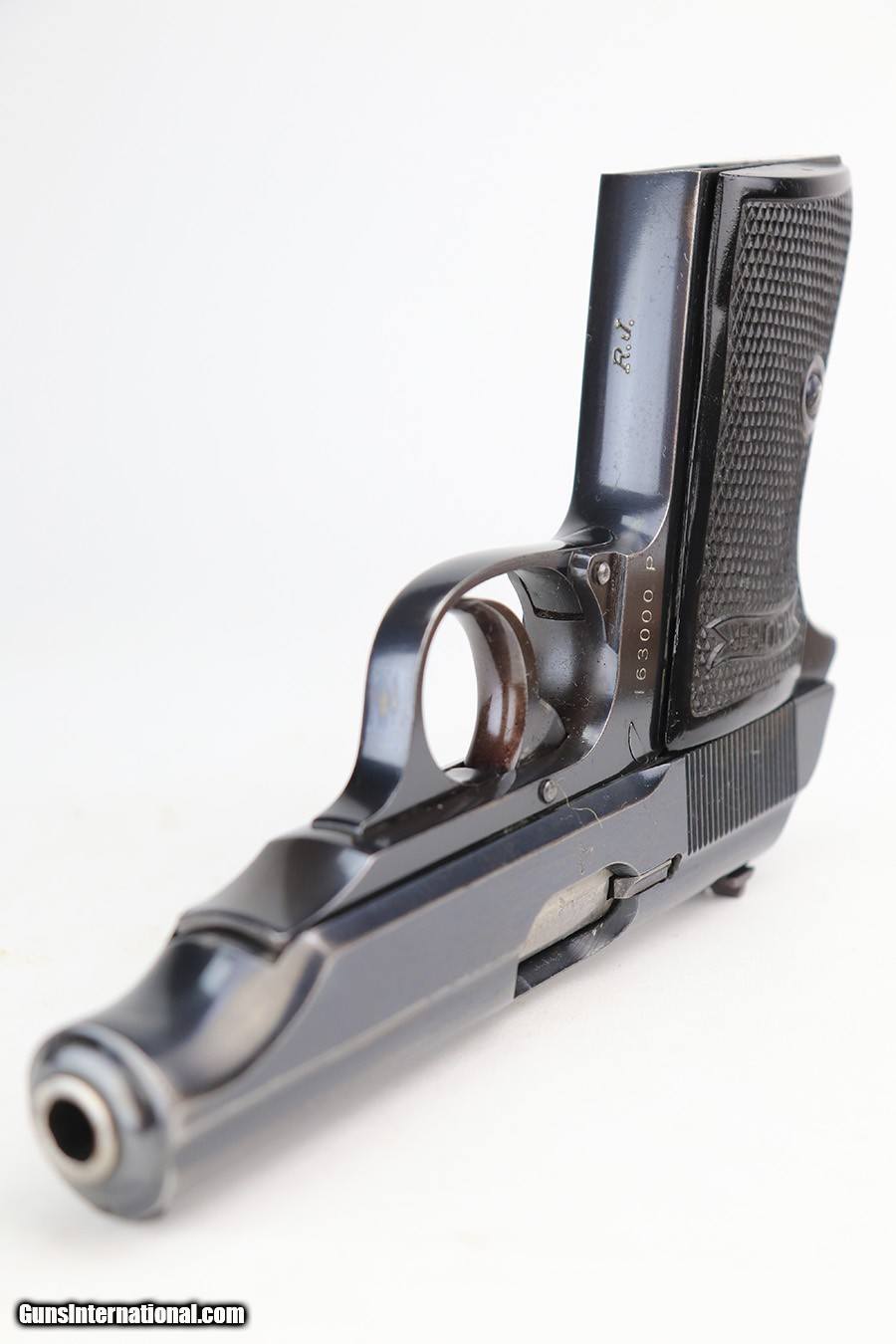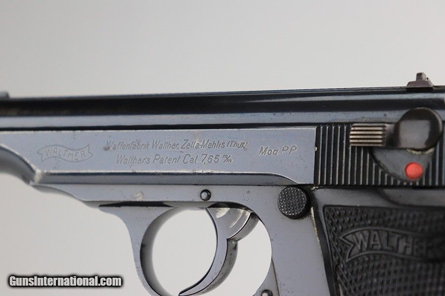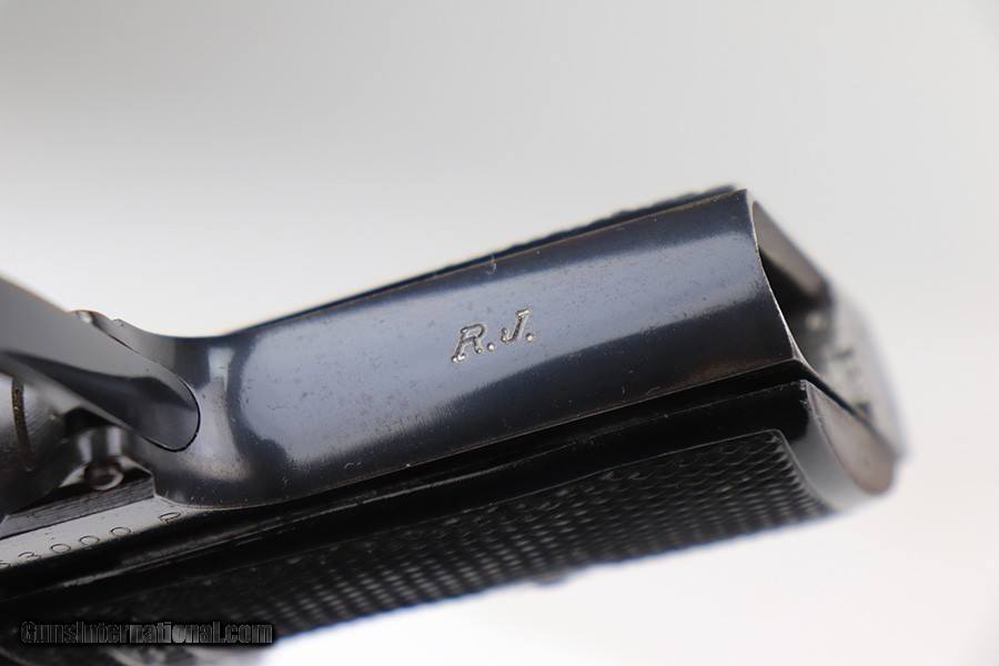 Description: This is a scarce Walther PP with RJ marking on front strap to denote issue to the Reich Justice Ministry. There were fewer than 5,000 of this variation produced, and this one has about 93% of the original, high-polish blue remaining. There is minor wear on the high edges and round edges of both sides of the slide. Very minor pin-pricking on both grip straps. Comes with nice period-correct grips - there is a crack along the edge of the left grip panel from expansion/contraction. Also comes with a Walther banner-only magazine. Minty bore. The slide does not lock back automatically with this magazine unless applying pressure to the mag bottom. SOLD Handgun Caliber: .32 ACP (7.65x17mm Browning SR) Bore: 9.5/10 Condition: ~93% |