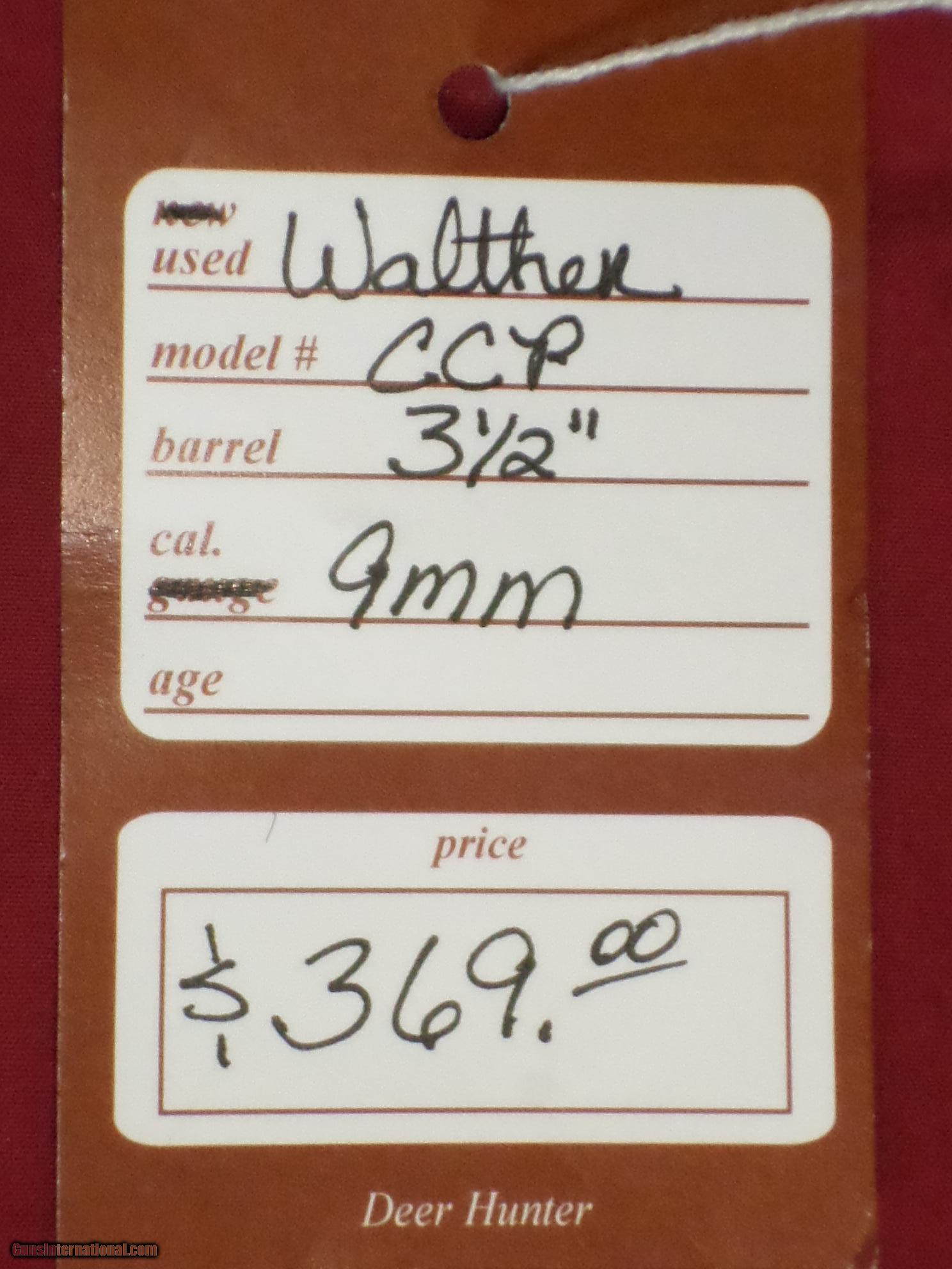 Description: SOLD For sale, Walther CCP, Concealed Carry Pistol, 9mm. Like new in the box. To see more of our inventory, visit deerhunterguns,com We collect 7% sales tax for Florida sales. We accept MC, Visa and Discover, no AmEx. No Sales to California. Like us on Facebook: Deer Hunter Guns SOLD |