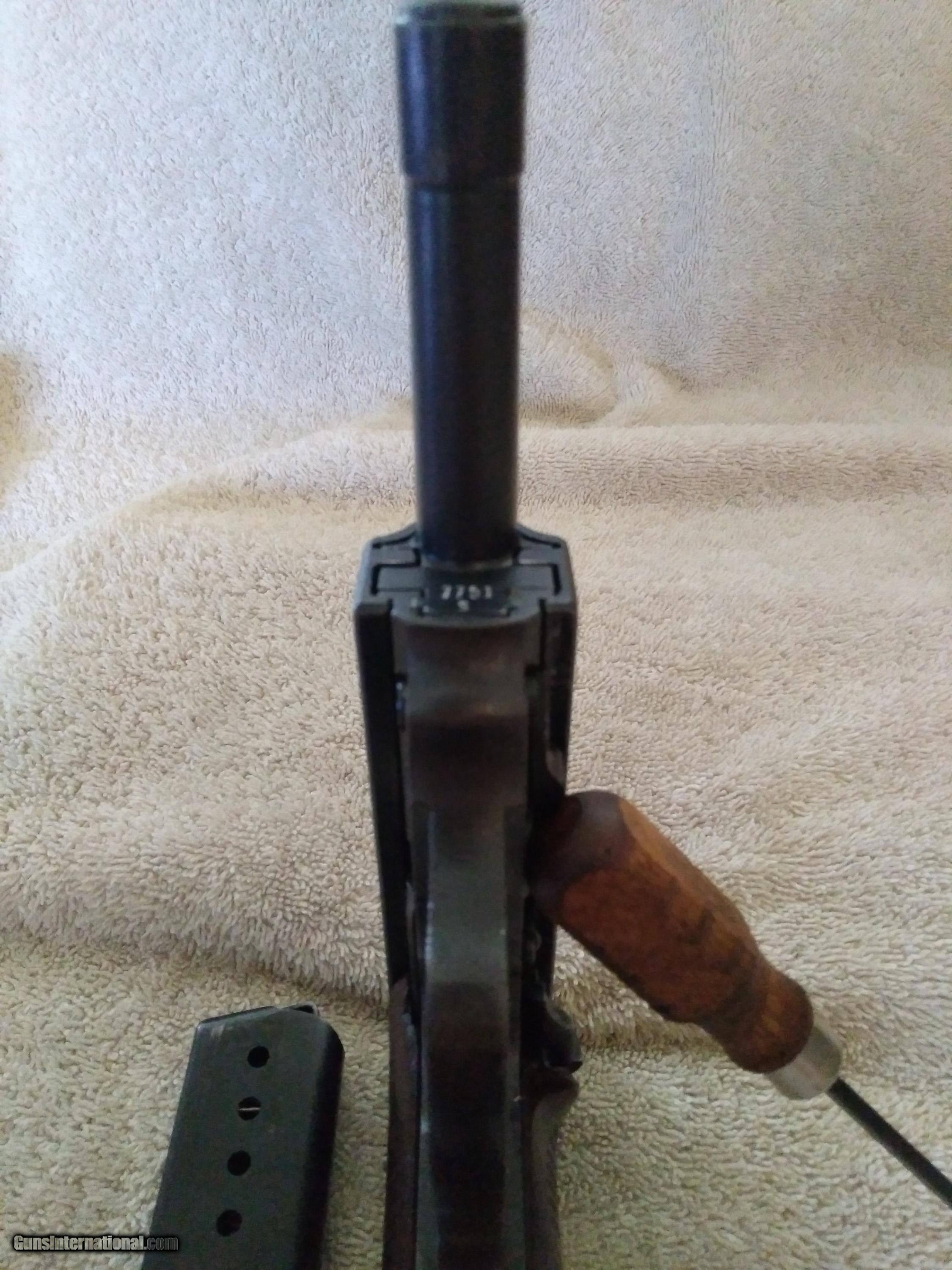 Description: GERMAN SPREEWERK ( cyq ) 9mm S/N 7751 s BLOCK PRODUCTION MID-WAR 1942-1943 ALL MATCHING S/N EXCEPT MAGAZINE ( 6609 ) TYPICAL ROUGH MACHINE WORK DUE TO SPEED UP OF PRODUCTION CORRECT WAFFENAMT MARKINGS ( EAGLE OVER 88 ) BLUING IS 85% WITH EDGE WEAR FRONT OF SLIDE LEFT AND RIGHT BOTTOM EDGE OF RIGHT SIDE OF SLIDE END OF BARREL LEFT AND RIGHT FRECKLING FRONT OF LEFT AND RIGHT SIDE OF SLIDE BORE IS EXCELLENT BRIGHT AND SHINY STRONG RIFLING BAKELITE GRIPS REDISH BROWN EXCELLENT NO CHIPS OR CRACKS SOME ALLERGATING TOP OF RIGHT GRIP NO IMPORT MARK INCLUDES BLACK P38 HOLSTER WITH MAGAZINE HOLDER C.RIESE BERLIN 1959/12 SHIPPING $30.00 C&R FFL OR FFL WHITE POWDER USED TO HIGHLITE MARKINGS WAS REMOVED SOLD Curio/Relic: Yes Handgun Caliber: 9x19mm Parabellum (9mm Luger, 9x19mm NATO) Manufacturer: SPREEWERKS Model: CYQ Serial Number: 7751 s Barrel Length: 5 in Bore: STRONG RIFLING Condition: Excellent Metal Condition: Excellent Bore Condition: Excellent Action: DA/SA Manufacture Date: 1942-1943 |