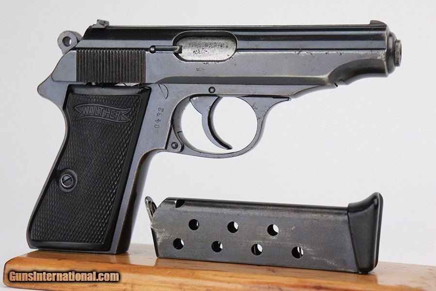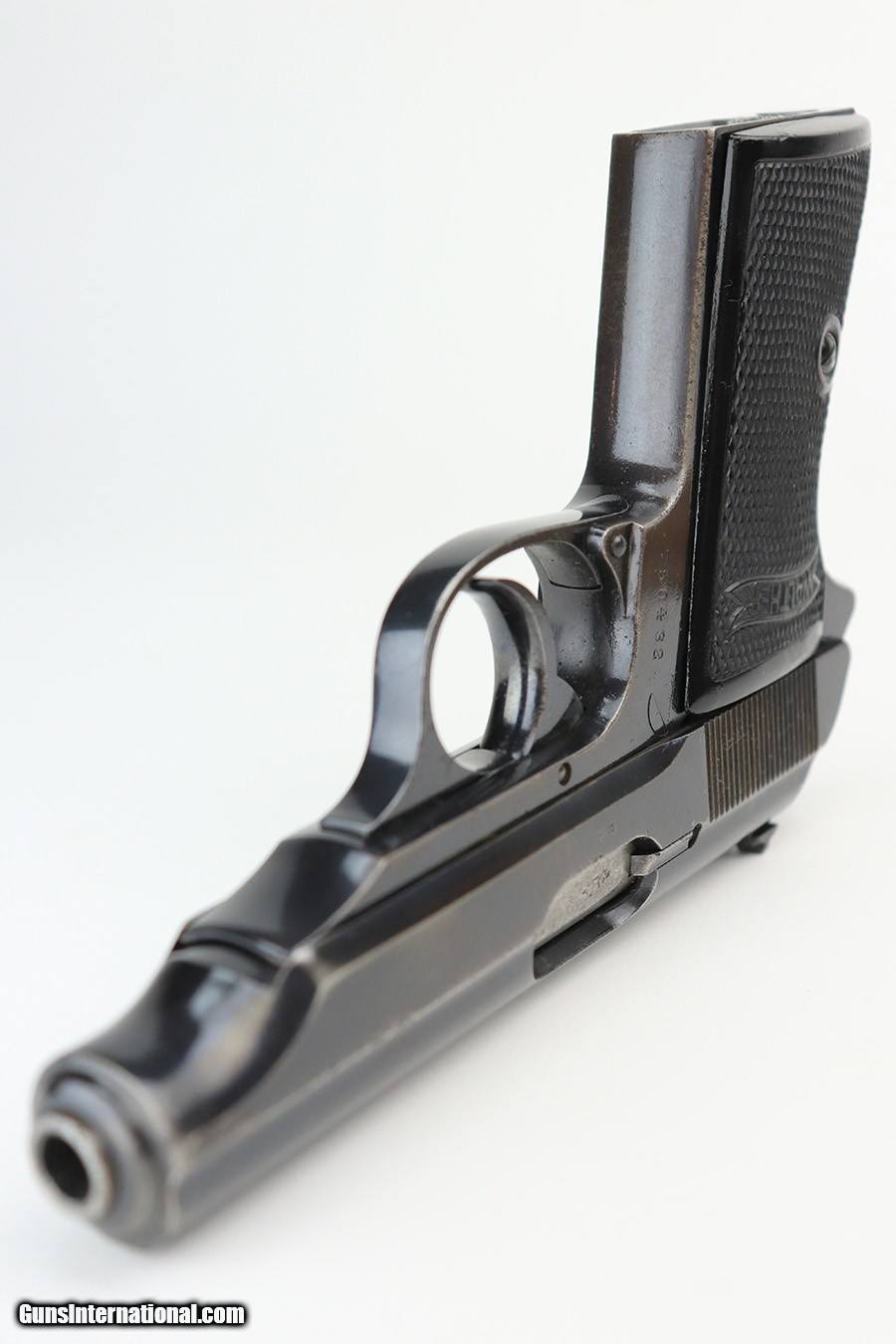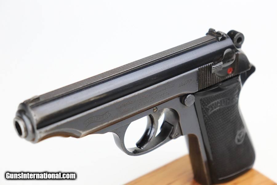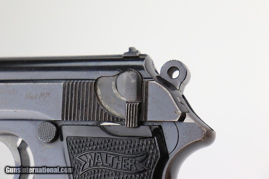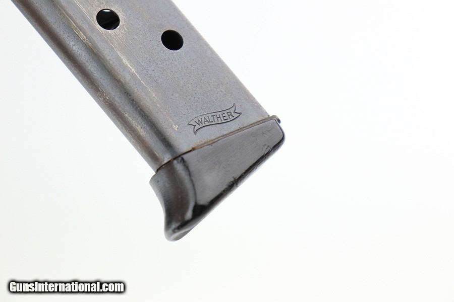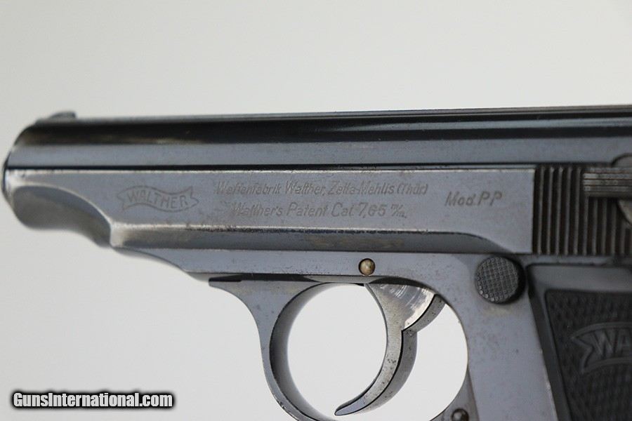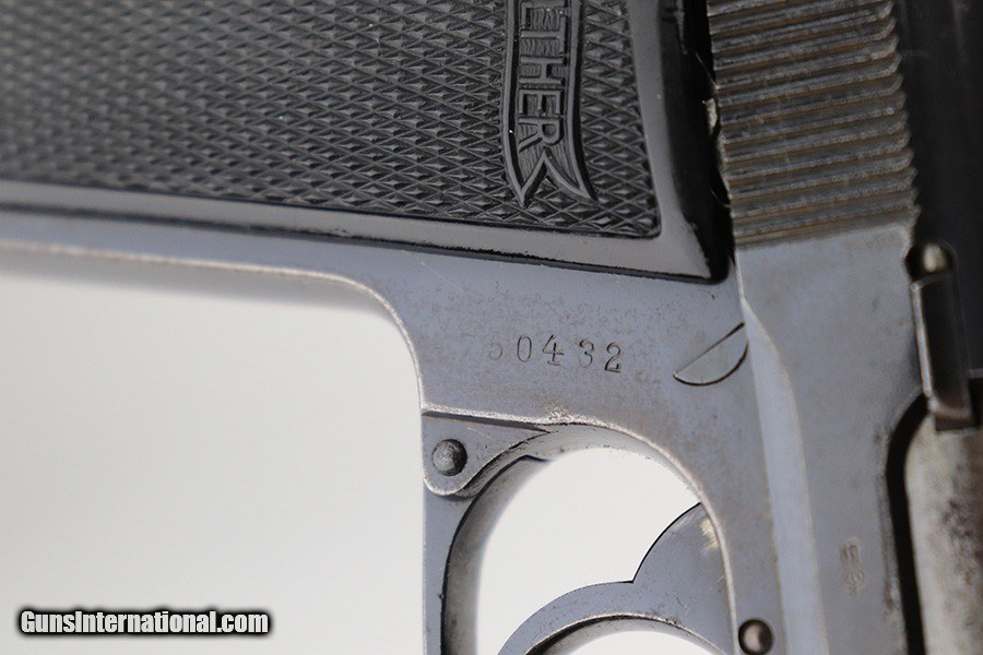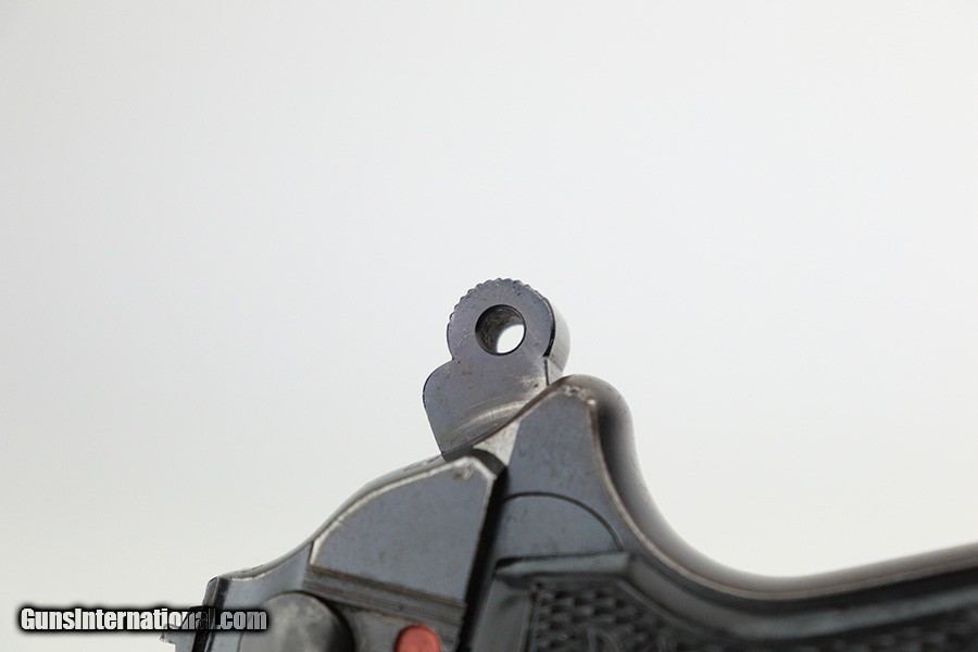 Description: This is a nice example of a very early Walther PP manufactured in the first year of production, 1929 - this one was only the 432nd gun made! It is all matching and has the proper "Crown N" proofs. It has all of the correct early features, such as the heavy hammer, 90 degree safety, extended barrel, and early "X" back grips. It does however have a thin safety lever (not a fat lever), so that must have been replaced. The gun has retained about 93% of its original finish. Most of the wear is around the muzzle and around the high edges of the slide. While there isn't much actual finish loss, there are areas of pin-pricking throughout and some areas of minor pitting. Light brown patina on the grip straps. Comes with a proper early slab-side finger extension magazine. The bore has good rifling, but there is pin-pricking throughout. The "7" in the serial number is faint from a light strike. SOLD Curio/Relic: Yes Handgun Caliber: .32 ACP (7.65x17mm Browning SR) Bore: 7.5/10 Condition: ~93% |