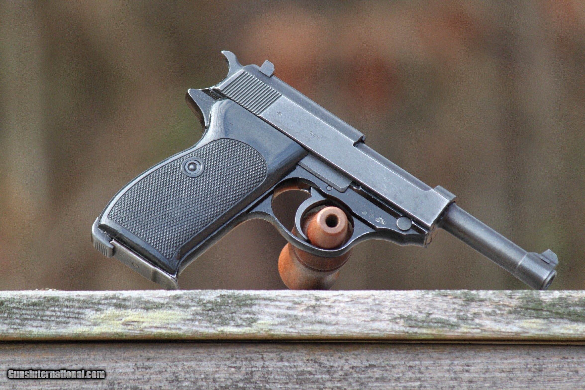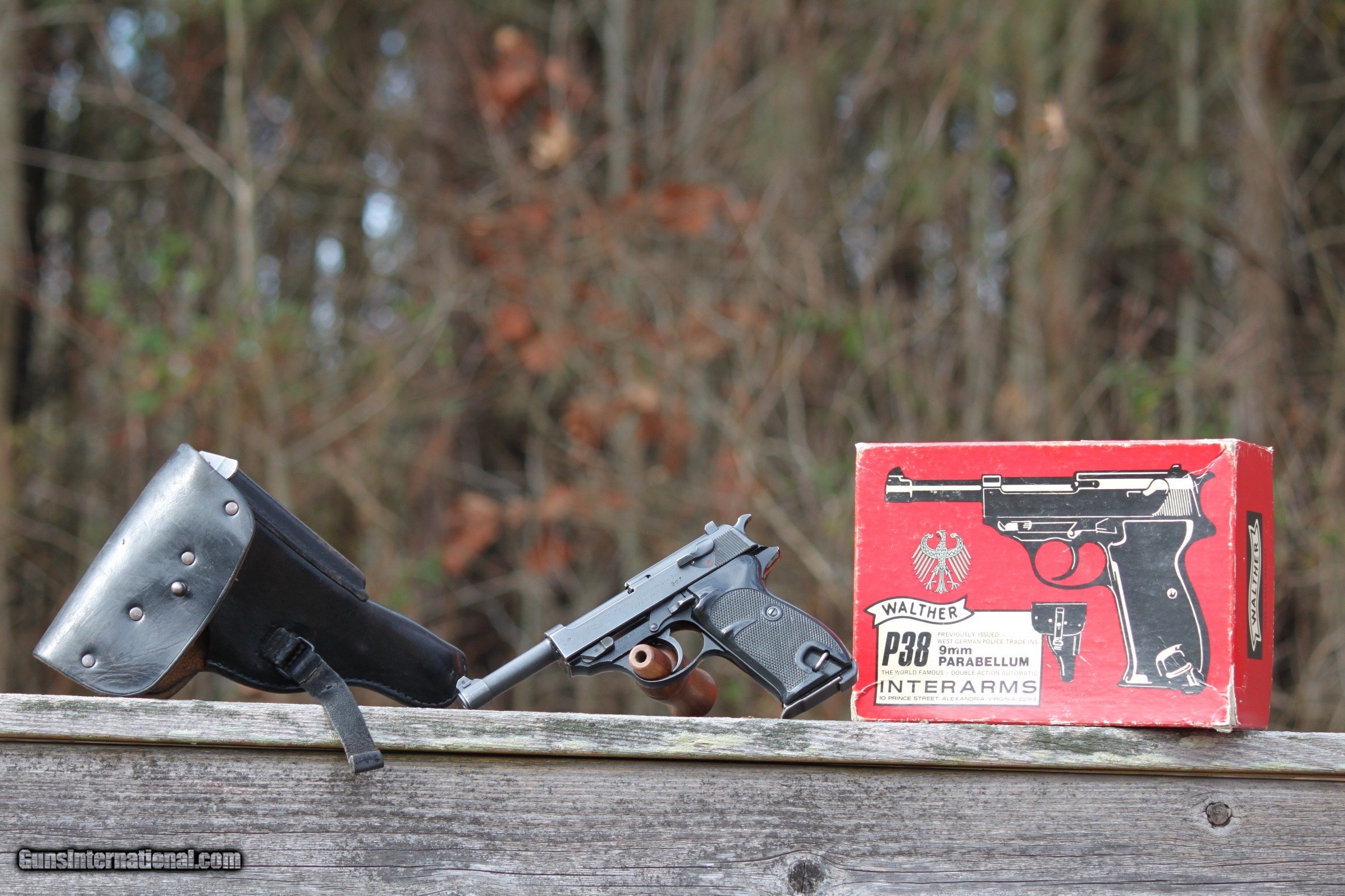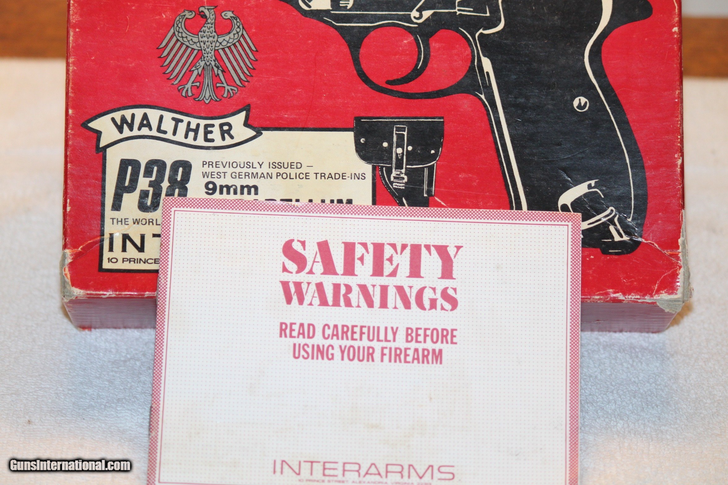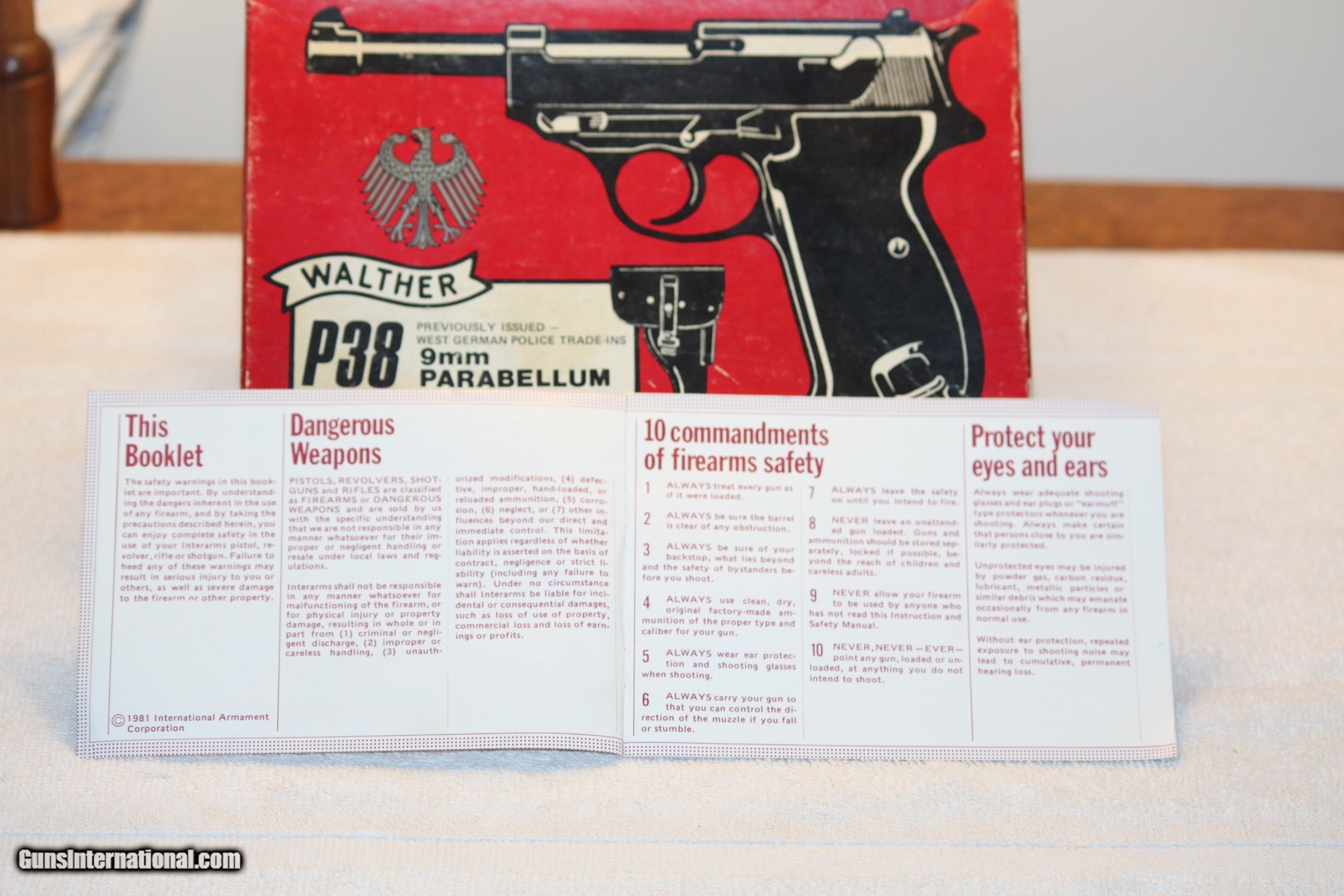 Description: For sale is a very nice and complete packaged Walther Interarms P38 9MM Parabellum, Serial Number 074367. This is an original "O" generation Walther in the original box, with original Safety Warning booklet and Original Holster in exceptionally good condition as the photos show. Catalog number WAP 34590 as marked on the box. The box is in very good condition with colors still vivid as shown. Grips are in excellent condition, no chips or cracks, bluing is in very fine conditon, bore is shiny with grooves clearely showing, action is crisp. Left side of barrel reads "Carl Walther Waffenfabrik Ulm/DO". Right side of barrel is marked 10/59 for production date which qualifies the Walther for C&R FFL buyers. There are German stamps on the front of the trigger guard. The original leather holster is in fine shape, no crack to the leather and closing strap functions as should. The holster also has the pouch for one extra magazine. The name "W Singer" is written on the inside of the holster flap in faded ink. The walther has two 8 round magazines in very good shape as well. All in all , a very fine Walther P38 for the shooting enthusiast or the collector at a very reasonable price for the condition and original box and litterature. The photos speak for the condition. Please email with any questions. Priced given the condition and originality at $650.00. Walther will be shipped and insured to your C&R FFL license or FFL dealer. If you have any questions email: rab41283gmail SOLD Curio/Relic: Yes Handgun Caliber: 9x19mm Parabellum (9mm Luger, 9x19mm NATO) Manufacturer: Walther Model: P38 Serial Number: 074367 Barrel Length: 5 Bore: Grooved Chambers: Excellent Ejectors: Excellent Condition: Very Good Metal Condition: Very Good Wood Condition: N/A Bore Condition: Excellent Barrel Type: Steel Action: Slide Triggers: 1 Stock: N/A Weight: 34oz. Sights: Standard Manufacture Date: 1948-1949 Extras: Original Box and Papers Case: Leather Item Location: Maryland |