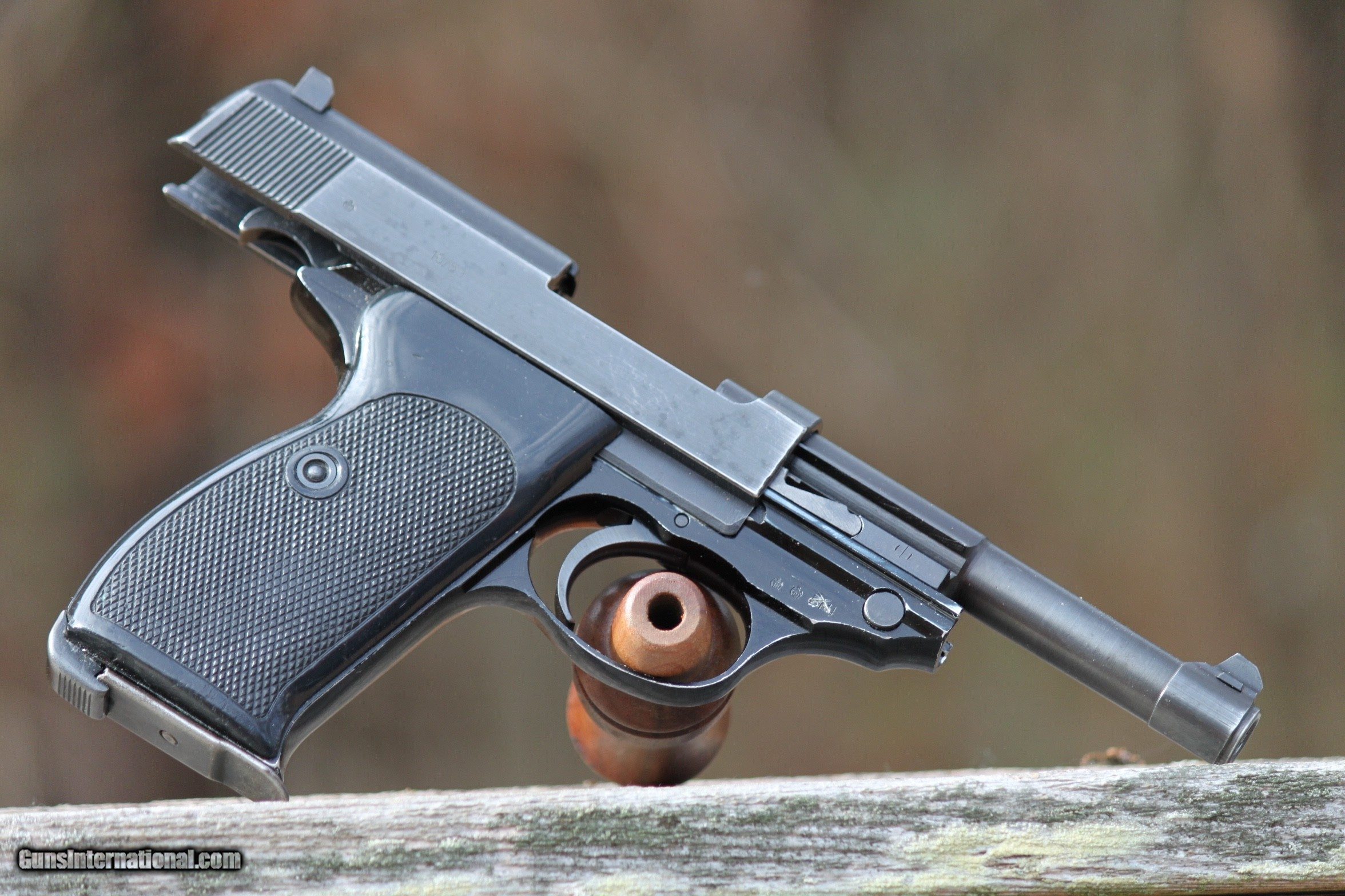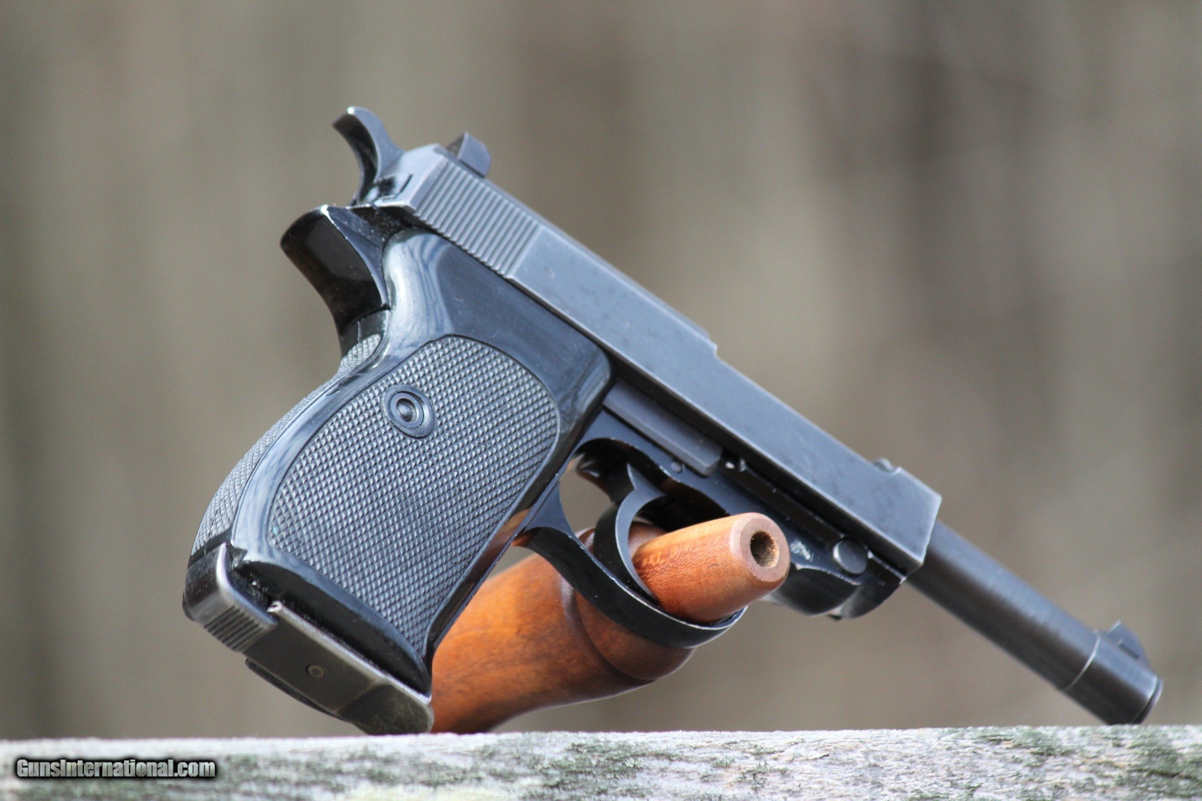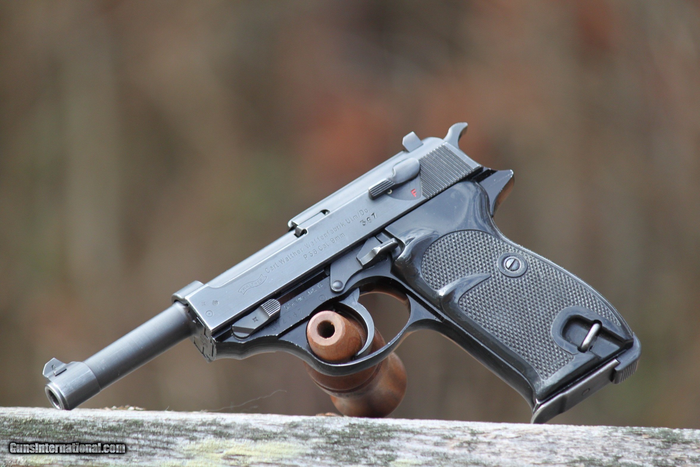 Description: For sale is a very nice and complete packaged Walther Interarms P38 9MM Parabellum, Serial Number 074367. This is an original "O" generation Walther in the original box, with original Safety Warning booklet and Original Holster in exceptionally good condition as the photos show. Catalog number WAP 34590 as marked on the box. The box is in very good condition with colors still vivid as shown. Grips are in excellent condition, no chips or cracks, bluing is in very fine conditon, bore is shiny with grooves clearely showing, action is crisp. Left side of barrel reads "Carl Walther Waffenfabrik Ulm/DO". Right side of barrel is marked 10/59 for production date which qualifies the Walther for C&R FFL buyers. There are German stamps on the front of the trigger guard. The original leather holster is in fine shape, no crack to the leather and closing strap functions as should. The holster also has the pouch for one extra magazine. The name "W Singer" is written on the inside of the holster flap in faded ink. The walther has two 8 round magazines in very good shape as well. All in all , a very fine Walther P38 for the shooting enthusiast or the collector at a very reasonable price for the condition and original box and litterature. The photos speak for the condition. Please email with any questions. Priced given the condition and originality at $650.00. Walther will be shipped and insured to your C&R FFL license or FFL dealer. If you have any questions email: rab41283gmail SOLD Curio/Relic: Yes Handgun Caliber: 9x19mm Parabellum (9mm Luger, 9x19mm NATO) Manufacturer: Walther Model: P38 Serial Number: 074367 Barrel Length: 5 Bore: Grooved Chambers: Excellent Ejectors: Excellent Condition: Very Good Metal Condition: Very Good Wood Condition: N/A Bore Condition: Excellent Barrel Type: Steel Action: Slide Triggers: 1 Stock: N/A Weight: 34oz. Sights: Standard Manufacture Date: 1948-1949 Extras: Original Box and Papers Case: Leather Item Location: Maryland |