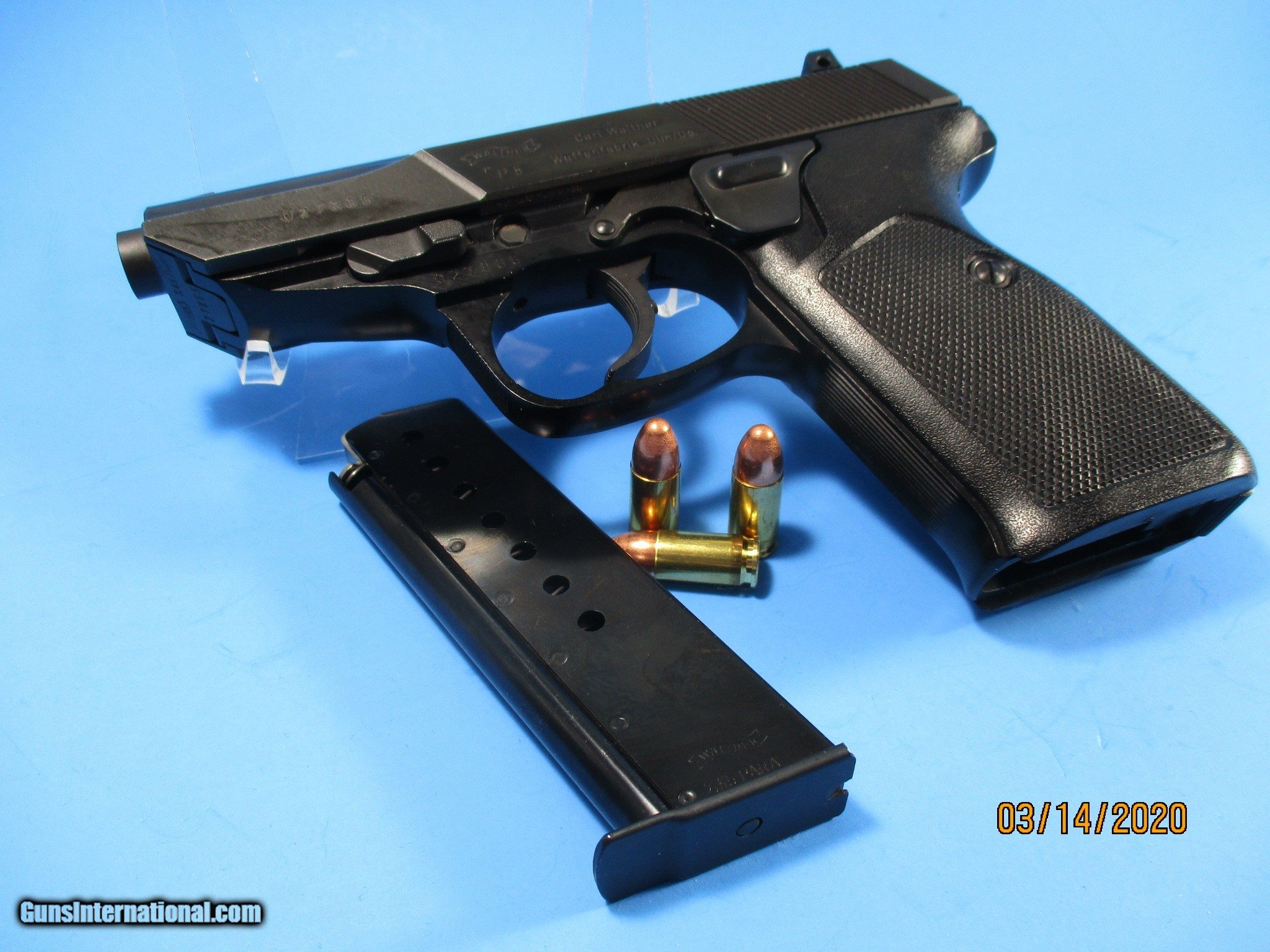 Description: Description: Rarely offered, German-made for Italy, semi-auto WALTHER P5 pistol in cal 7,65mm Para, 3.5" barrel, DA, adjustable rear sight, blue finish. In excellent condition. INCLUDES ONE (1) GERMAN-MADE LEATHER HOLSTER OF YOUR CHOICE! NOTE: This rarely found WALTHER P5 in cal 7,65mm Para was especially produced for Italy and is identified as such by the CAT 1062 marking on the right side of the slide. The P5 is a recoil-operated, locked-breech, 9mm semi-automatic pistol. It utilizes the same design principles as the famous WALTHER P38 pistol of World War II fame. The barrel does not tilt following firing in the way that Browning's system does but rather moves straight back approximately 5 mm (0.20 in). This system results in a vary a curate pistol since the barrel is kept parallel with the frame during/after firing. The trigger is a stand double-action / single-action trigger. The slide lock also doubles as the decocker and is found on the left side of the frame. Pressing it once will release the slide, pressing it a second time will drop the hammer without firing the gun. [WIKEPEDIA] SOLD Manufacturer: WALTHER Model: P5 - Italian Serial Number: 027865 Barrel Length: 3.5 Caliber Info: 7,65 Para Condition: Excellent Metal Condition: Excellent Bore Condition: Excellent |