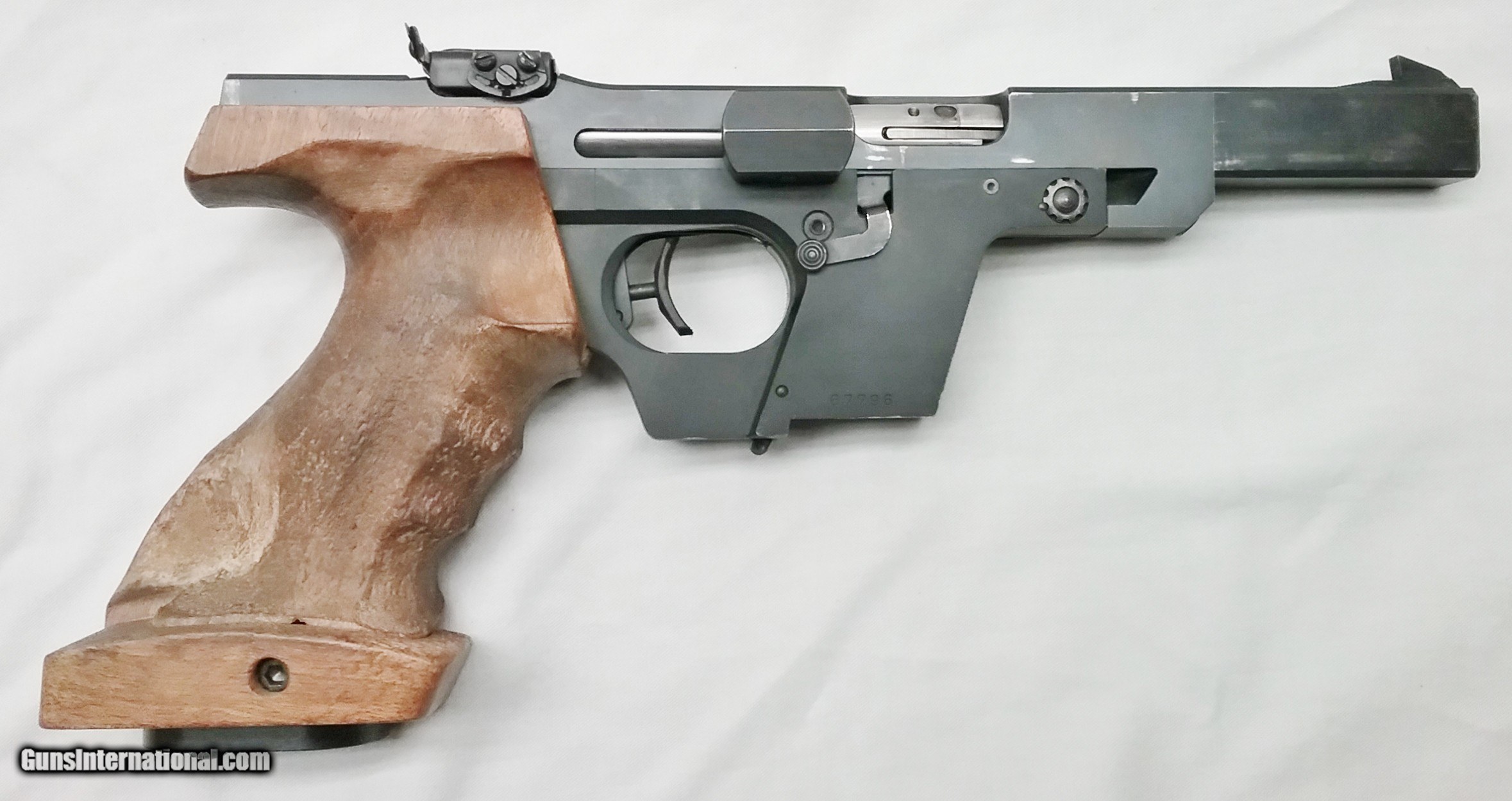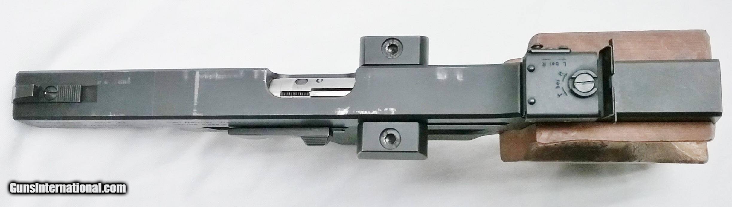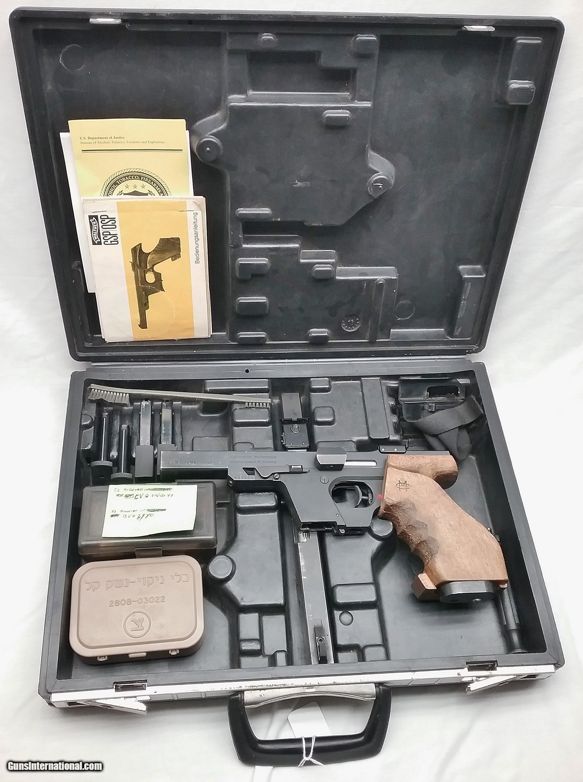 Description: This .32 / .22 Cal Walther GSP has a 4.5” blued barrel and anodized slide mounted with adjustable target sights. The bore is very good. The textured Select Hardwood grips are in good condition with the exception of some handling wear. Both upper assemblies show signs of usage wear. Pistol comes with a .22 Cal upper, two magazines for .32 Wadcutter and two for .22 LR, a second trigger assembly, spare parts, factory papers, cleaning accessories, tools and a carrying case. Overall length is 11.6 ” weight is 2.6 lbs. Our stock number is #C170. Will ship to any FFL in the United States. Buyer pays freight and insurance. SOLD Handgun Caliber: .22 Long Rifle, .32 S&W Long (.32 Colt New Police) Manufacturer: Walther Model: GSP Bore: Rifled Wood Condition: Good Bore Condition: Very Good Action: Semi-Automatic Triggers: One Finish: Blued/Anodized Weight: 2.6 Sights: Adjustable Extras: Read Description Case: Yes Item Location: OR |