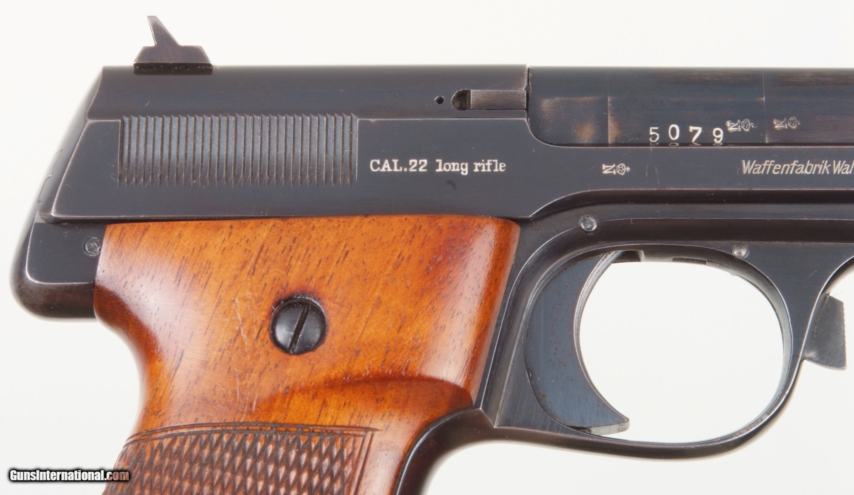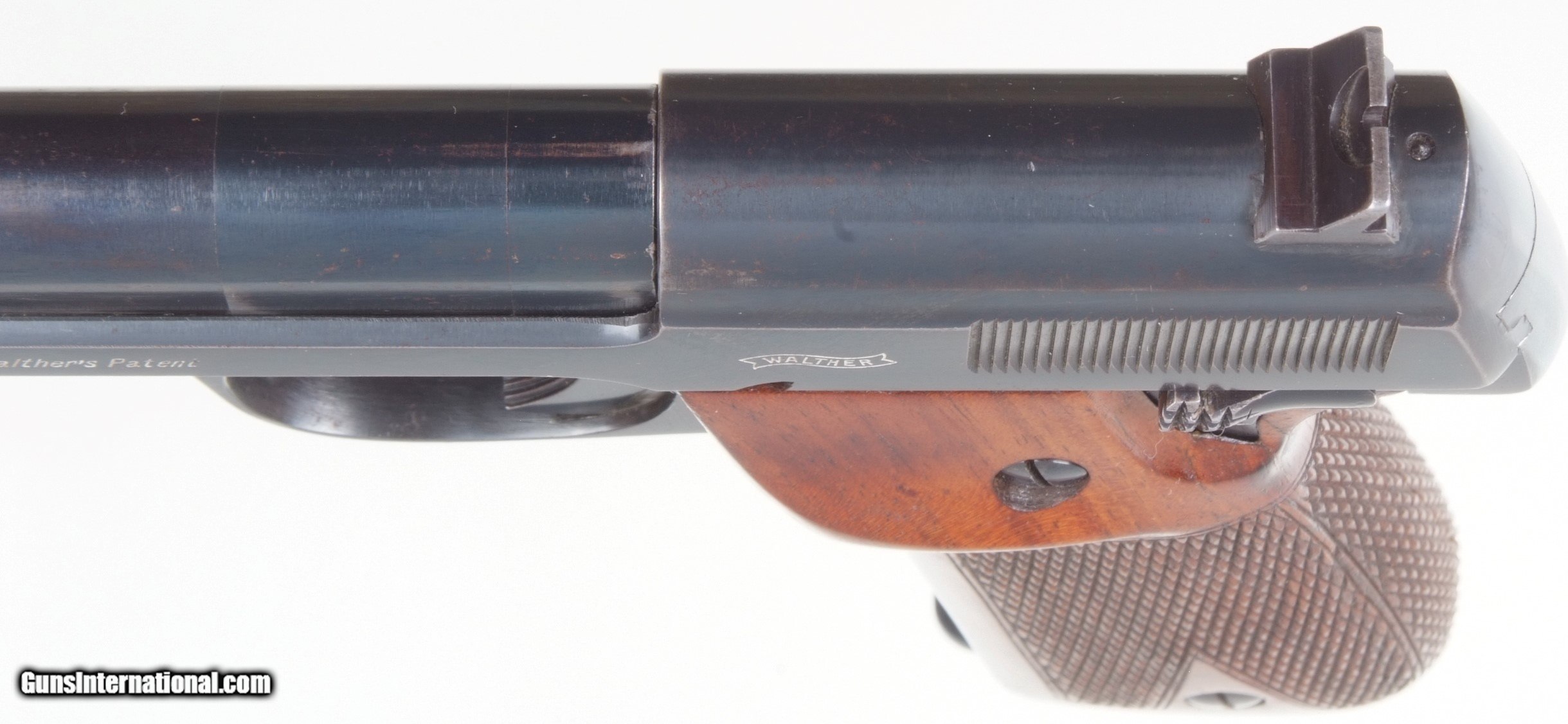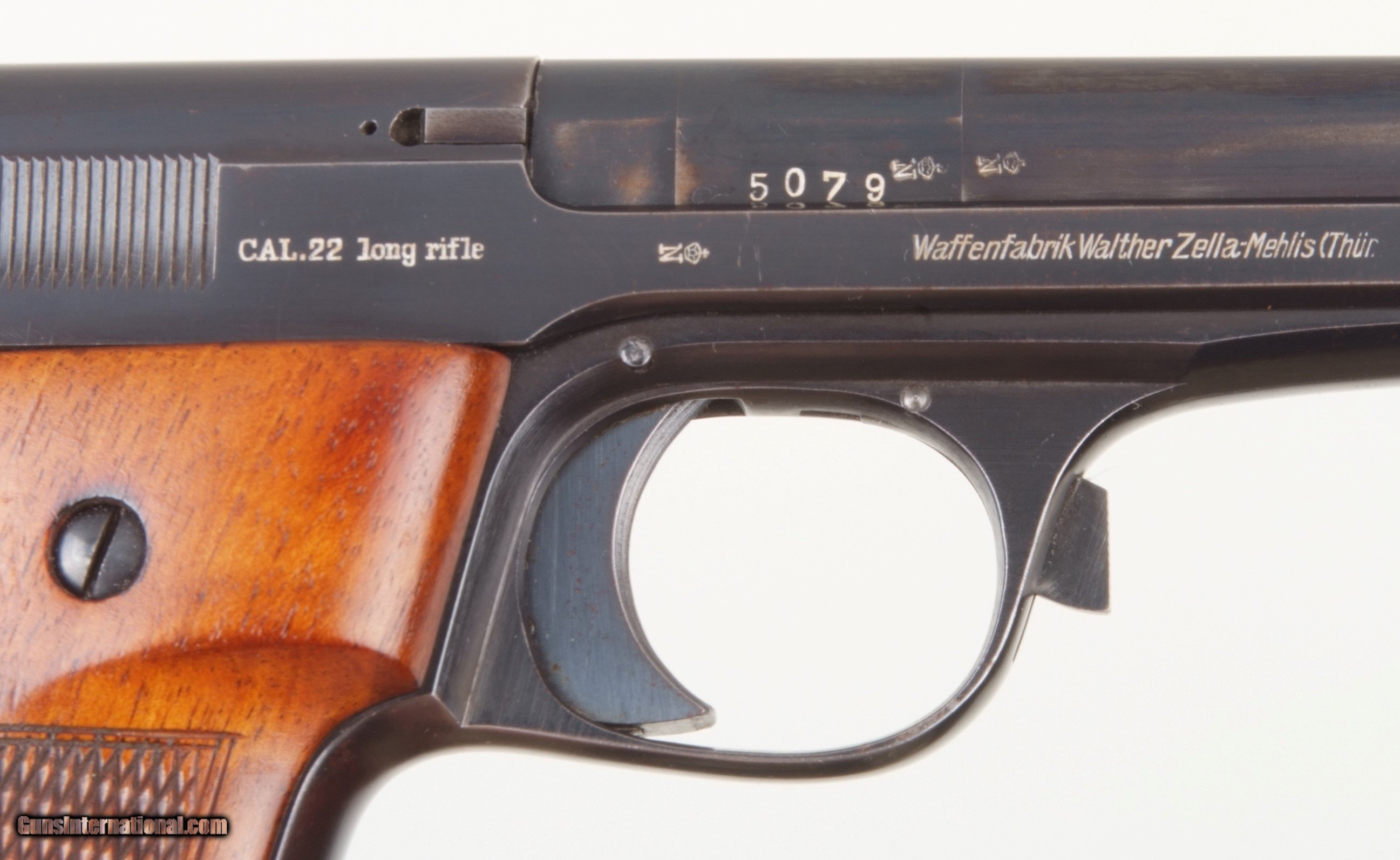 Description: Standard configuration Walther Olympia with adjustable front and drift rear sight having 7.5 barrel. Usual Walther markings on left and right sides of slide. Triple set of Crown/N proofs on right side of slide, barrel and frame. Checkered wood grips. Mag is marked “61”. PROVENANCE: Previously owned and white-highlighted by Warren Buxton who had photographed this pistol for inclusion in his still-unpublished book. Synopsis: Walther Olympia M1925, standard pattern, with original magazine. Condition: Near excellent condition, with sharp edge wear and areas of thinning, particularly in small patch under the trigger guard, consistent with careful use. Comparable condition grip with a hairline crack just below the safety and at the bottom of the backstrap. Mirror bright bore with strong rifling. Perfect manual mechanics. A very nice and classic Walther Olympia pistol, equally at home on the range or in a fine collection. For more information regarding Walther Olympias click here. C&R. A HISTORIC INVESTMENT! ~~Insured shipping fee of $55; most packages shipped using FedEx 2nd Day.~~ SOLD Manufacturer: Walther Serial Number: 5079 Caliber Info: .22LR |