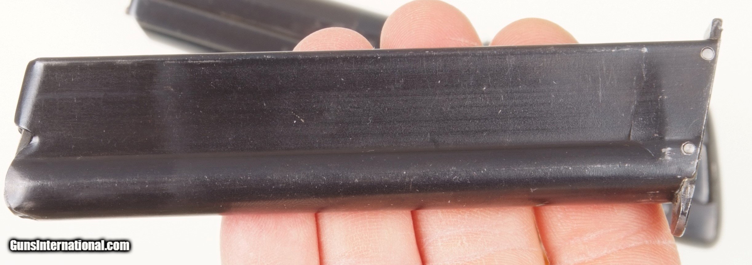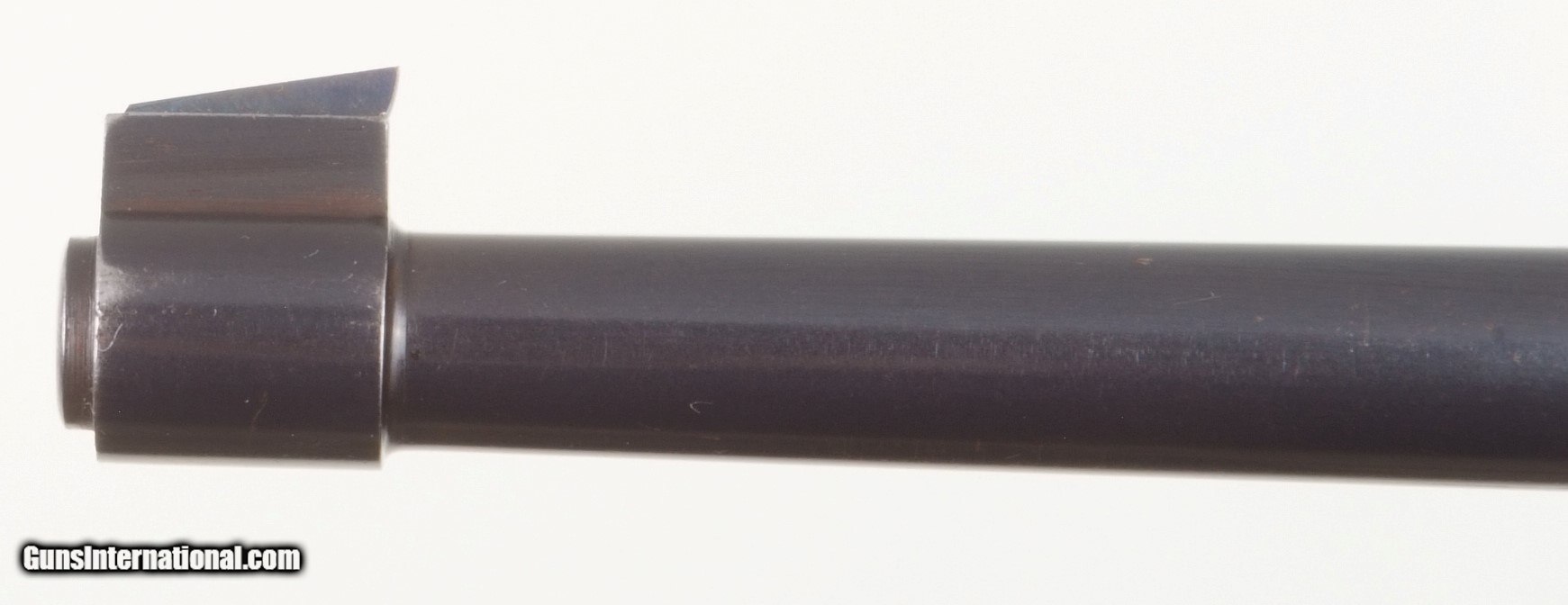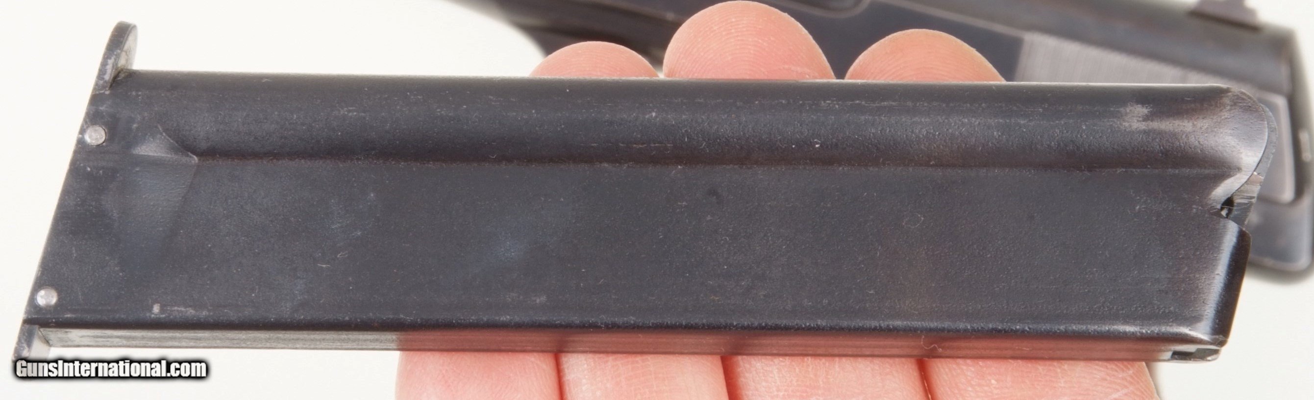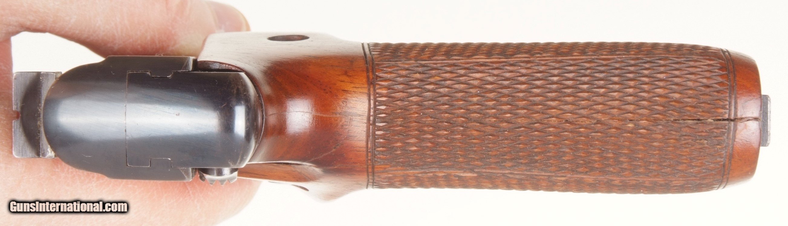 Description: Standard configuration Walther Olympia with adjustable front and drift rear sight having 7.5 barrel. Usual Walther markings on left and right sides of slide. Triple set of Crown/N proofs on right side of slide, barrel and frame. Checkered wood grips. Mag is marked “61”. PROVENANCE: Previously owned and white-highlighted by Warren Buxton who had photographed this pistol for inclusion in his still-unpublished book. Synopsis: Walther Olympia M1925, standard pattern, with original magazine. Condition: Near excellent condition, with sharp edge wear and areas of thinning, particularly in small patch under the trigger guard, consistent with careful use. Comparable condition grip with a hairline crack just below the safety and at the bottom of the backstrap. Mirror bright bore with strong rifling. Perfect manual mechanics. A very nice and classic Walther Olympia pistol, equally at home on the range or in a fine collection. For more information regarding Walther Olympias click here. C&R. A HISTORIC INVESTMENT! ~~Insured shipping fee of $55; most packages shipped using FedEx 2nd Day.~~ SOLD Manufacturer: Walther Serial Number: 5079 Caliber Info: .22LR |