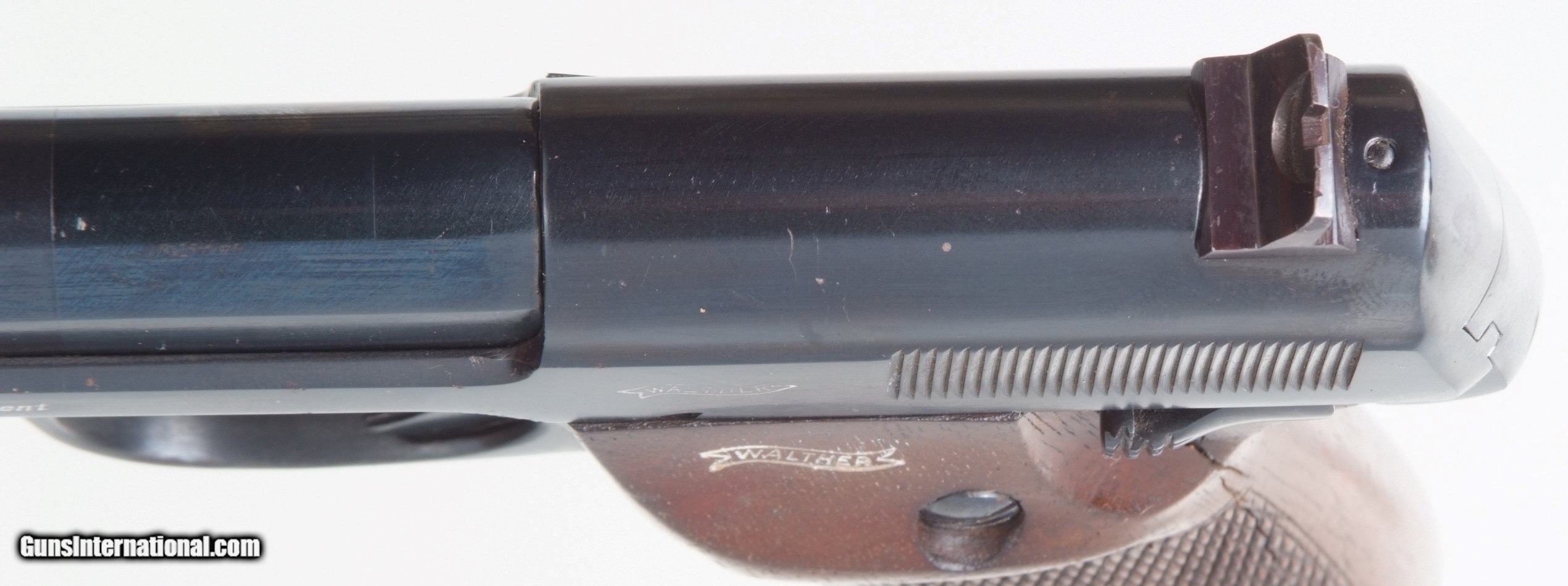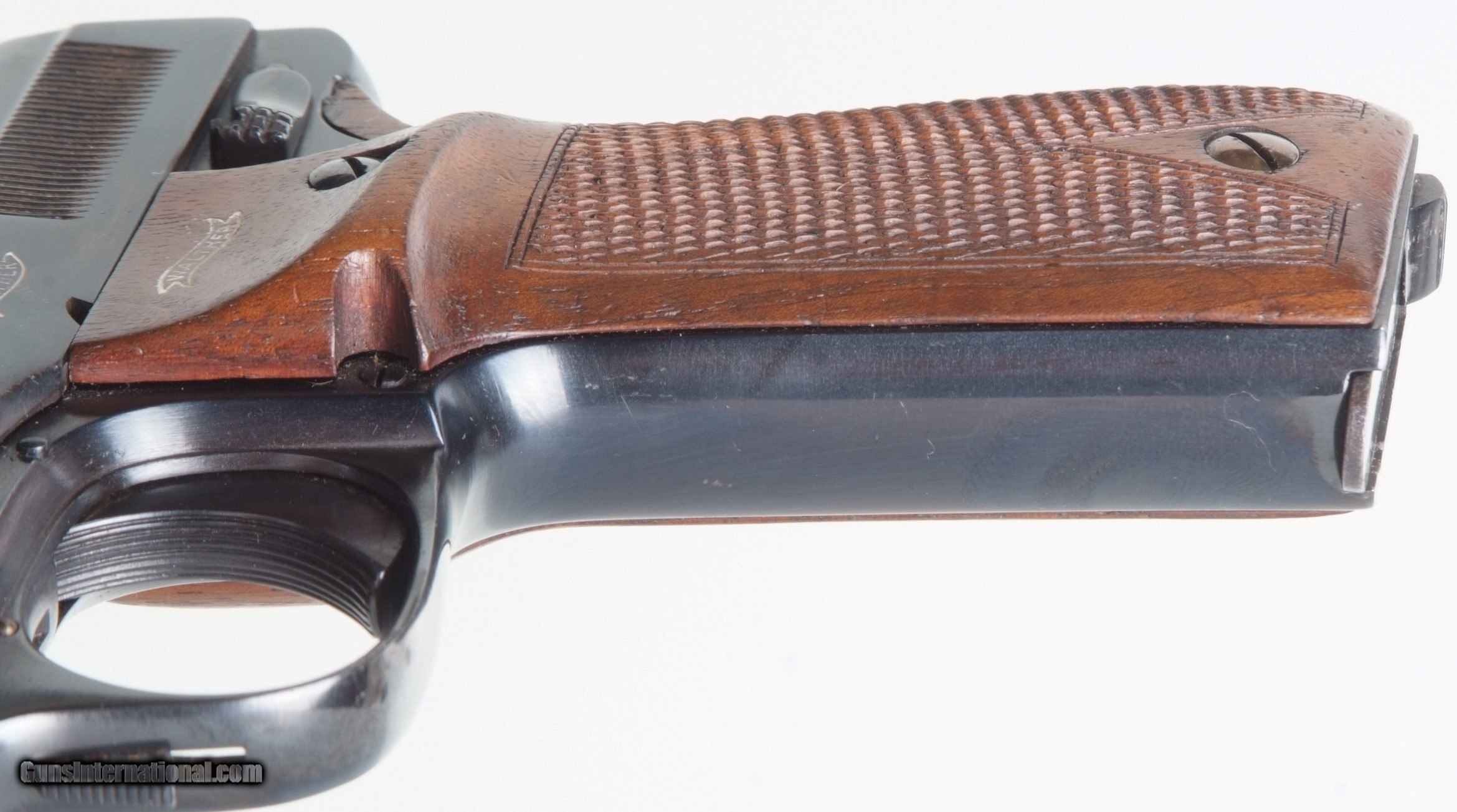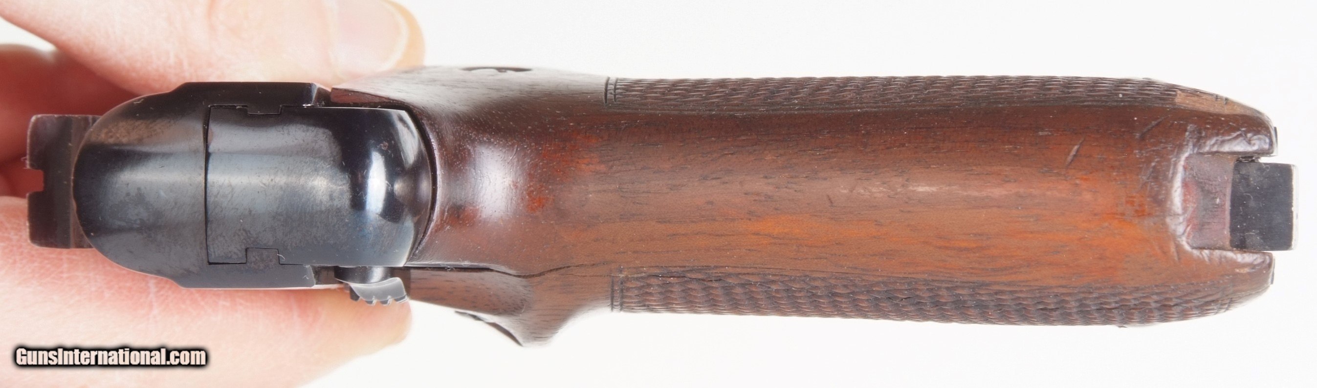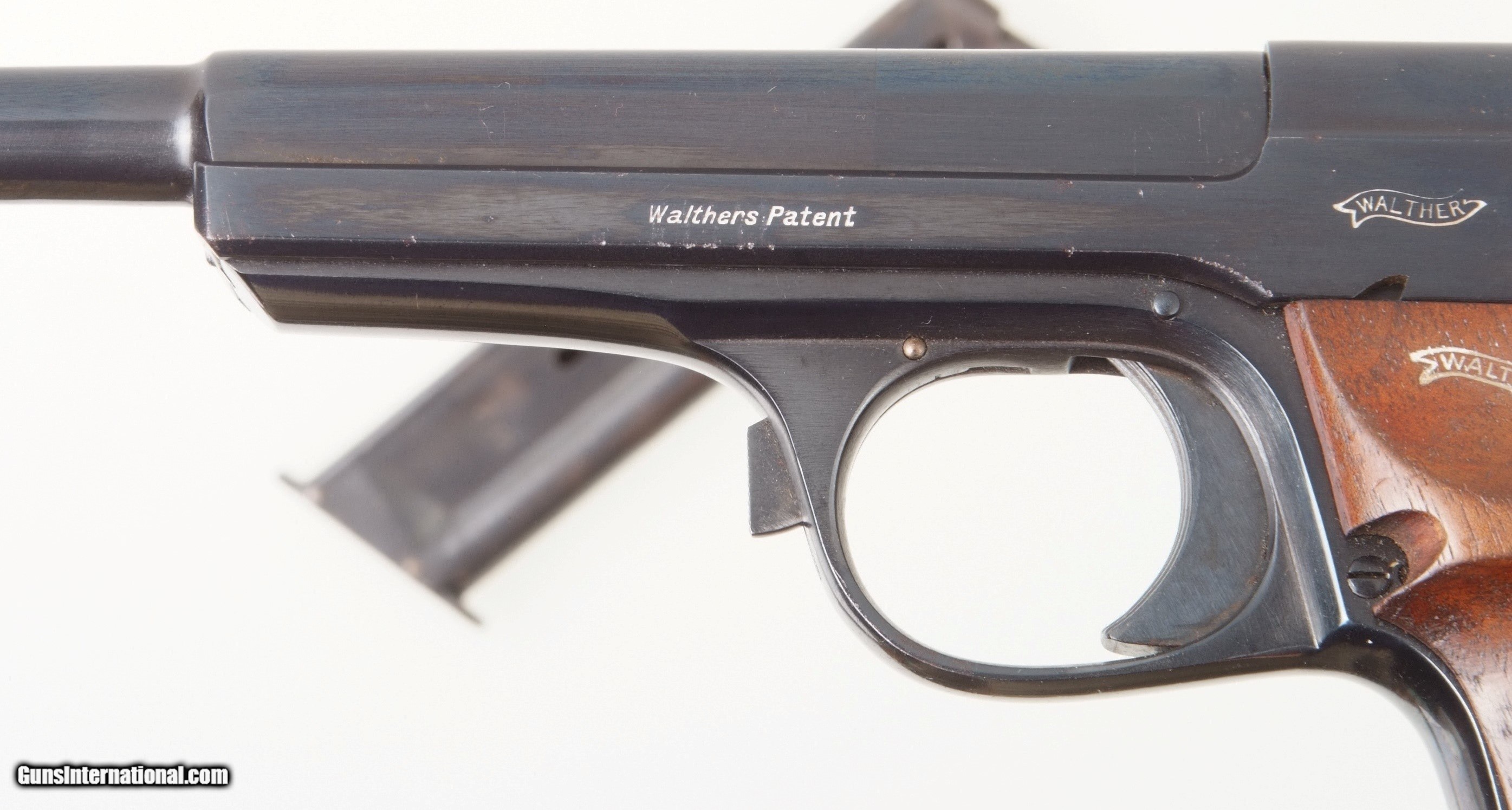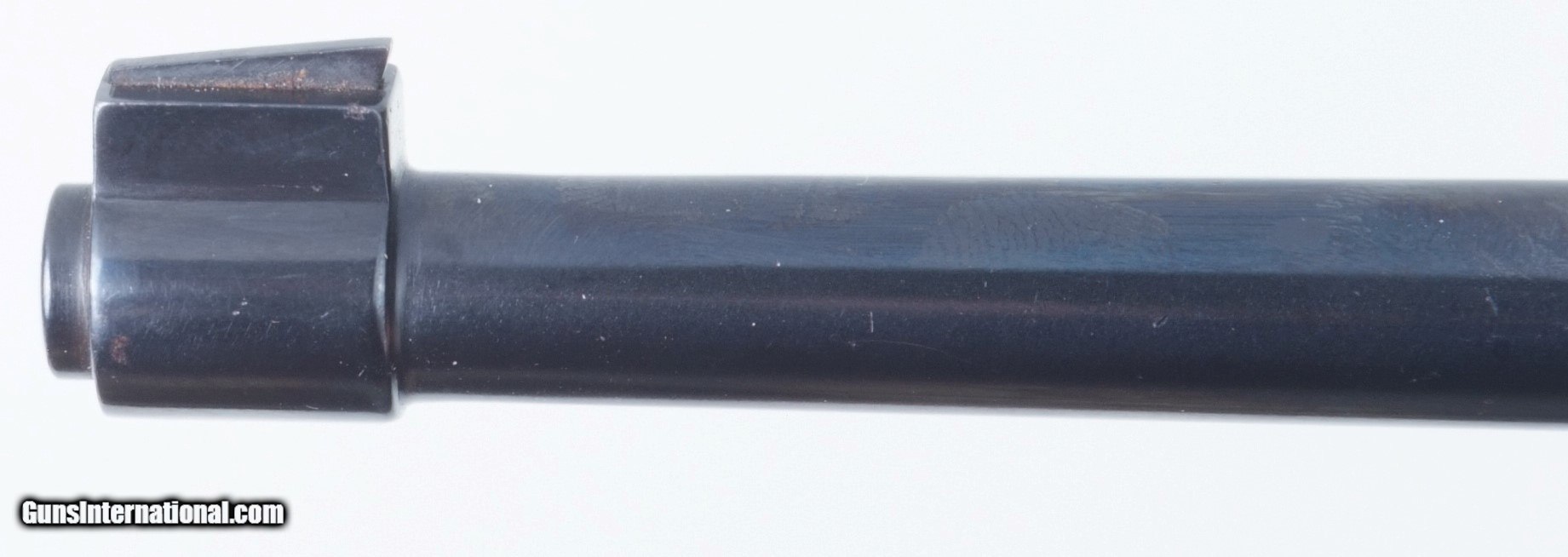 Description: Standard configuration Walther Olympia with adjustable front and drift rear sight having 7.5 barrel. Usual Walther markings on left and right sides of slide. Triple set of Crown/N proofs on right side of slide, barrel and frame. No import markings. Checkered wood grips. Each panel marked with the thin Walther banner as usually applied to salesman sample items. Magazine is numbered “363” with pinned unmarked base. THIS EXACT PISTOL, OWNED BY WARREN BUXTON AND WHITE HIGHLIGHTED FOR HIS UPCOMING BOOK, WAS PREVIOUSLY PICTURED ON PAGE 91 OF WALTHER VOLUME II BY JAMES L. RANKIN AND DESCRIBED ON PAGE 89 AS A “SPECIAL STOEGER MODEL”. Synopsis: Well documented Walther Olympia M1925, standard pattern with original magazine, beautifully restored, with salesman sample markings, pictured in the RANKIN BOOK OF WALTHER PISTOLS. Condition: Crisp, excellent condition as professionally restored with negligible sharp edge wear/handling marks. Front sight and extractor are salt blued. VG grips, cracked in usual location by safety, with deeply cut checkering. Near excellent, original condition magazine. Mirror bright bore with strong rifling. Slide is sluggish to return when magazine is inserted, needing a gentle push for full closure. Manual mechanics otherwise perfect. A very well documented Walther Olympia, especially nice with the Walther markings on each grip. C&R. A HISTORIC INVESTMENT! ~~Insured shipping fee of $65; most packages shipped using FedEx 2nd Day.~~ SOLD Manufacturer: Walther Serial Number: 3750 Caliber Info: .22LR |