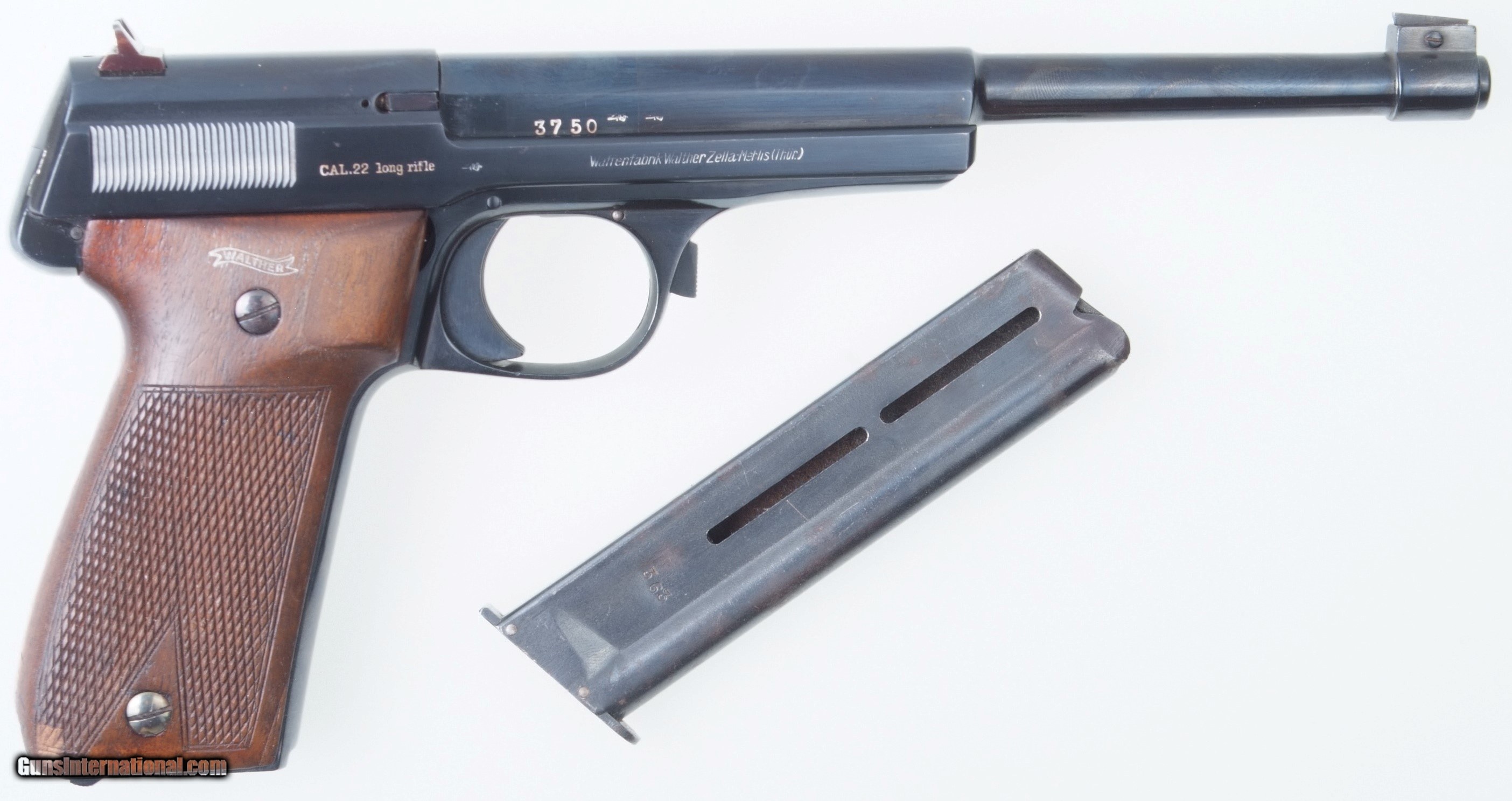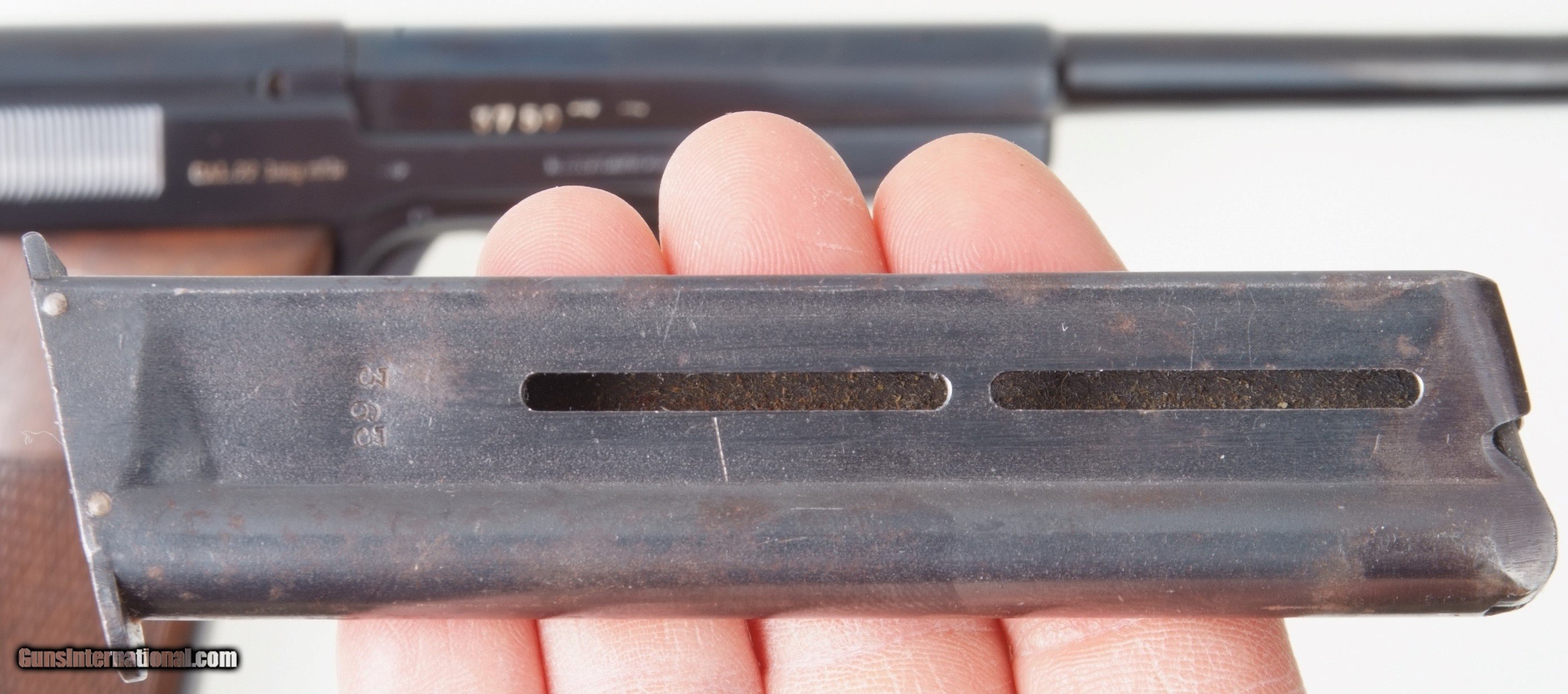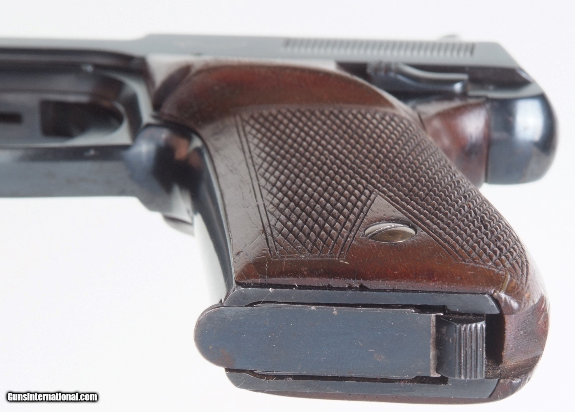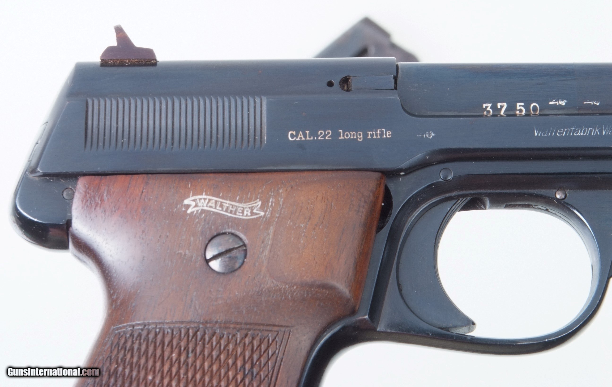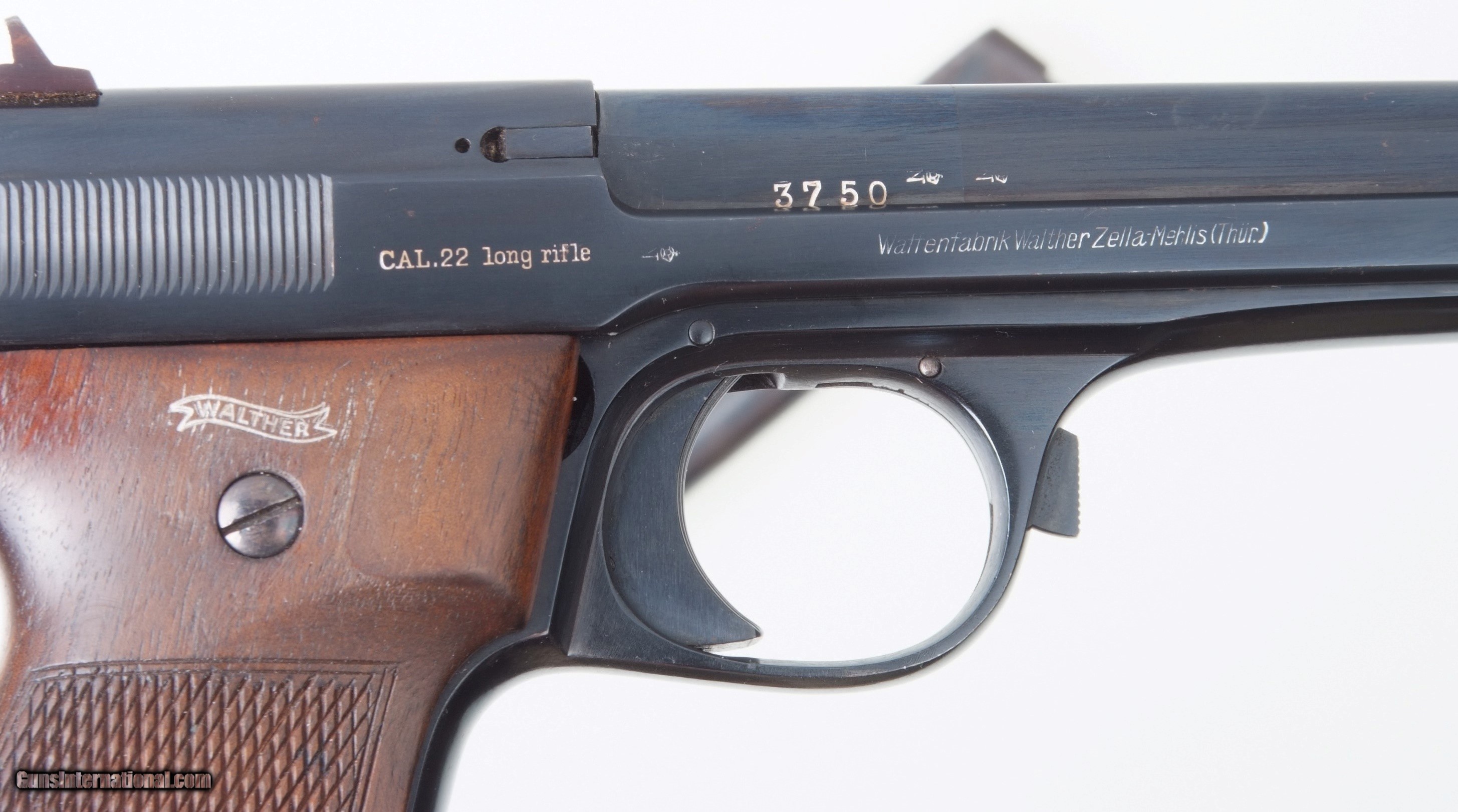 Description: Standard configuration Walther Olympia with adjustable front and drift rear sight having 7.5 barrel. Usual Walther markings on left and right sides of slide. Triple set of Crown/N proofs on right side of slide, barrel and frame. No import markings. Checkered wood grips. Each panel marked with the thin Walther banner as usually applied to salesman sample items. Magazine is numbered “363” with pinned unmarked base. THIS EXACT PISTOL, OWNED BY WARREN BUXTON AND WHITE HIGHLIGHTED FOR HIS UPCOMING BOOK, WAS PREVIOUSLY PICTURED ON PAGE 91 OF WALTHER VOLUME II BY JAMES L. RANKIN AND DESCRIBED ON PAGE 89 AS A “SPECIAL STOEGER MODEL”. Synopsis: Well documented Walther Olympia M1925, standard pattern with original magazine, beautifully restored, with salesman sample markings, pictured in the RANKIN BOOK OF WALTHER PISTOLS. Condition: Crisp, excellent condition as professionally restored with negligible sharp edge wear/handling marks. Front sight and extractor are salt blued. VG grips, cracked in usual location by safety, with deeply cut checkering. Near excellent, original condition magazine. Mirror bright bore with strong rifling. Slide is sluggish to return when magazine is inserted, needing a gentle push for full closure. Manual mechanics otherwise perfect. A very well documented Walther Olympia, especially nice with the Walther markings on each grip. C&R. A HISTORIC INVESTMENT! ~~Insured shipping fee of $65; most packages shipped using FedEx 2nd Day.~~ SOLD Manufacturer: Walther Serial Number: 3750 Caliber Info: .22LR |