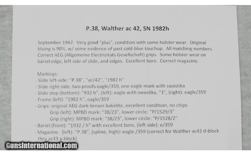 Description: Walther/AC42 P.38 chambered in 9MM Luger. Walther manufactured 617,585 in Zella-Mehlis, Germany. These were the standard service pistol of the German Army. This pistol has Bakelite grips, bright bore with strong rifling, and matching numbers. Reference photo of data sheet for specific information on this collectable pistol. 9mm Luger SOLD Metal Condition: Very good Bore Condition: Excellent bore Barrels: 5 Inches Triggers: Factory Sights: Fixed Item Location: La Vista, NE |