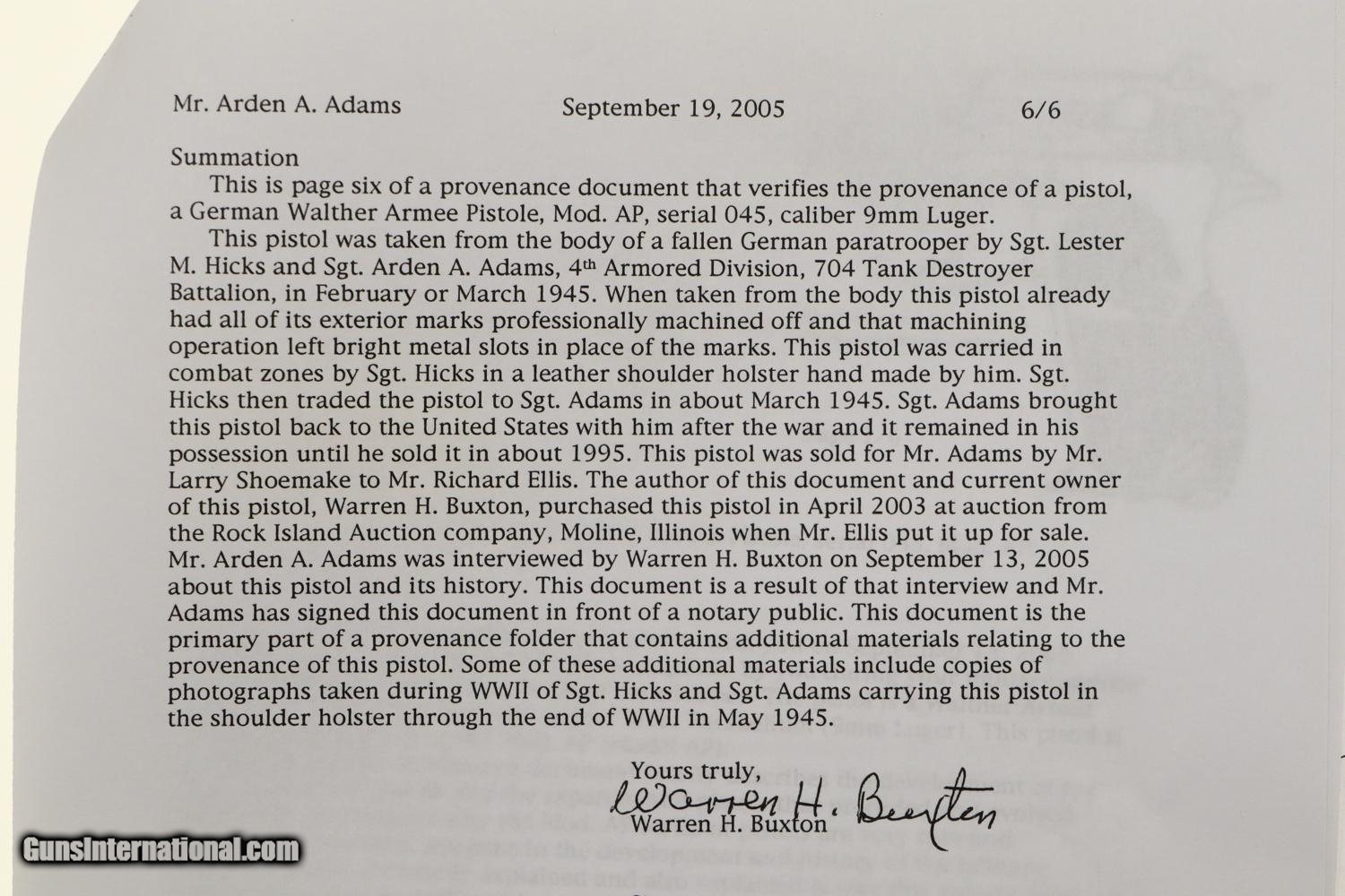 Description: This rare artifact is a second developmental stage Walther Model AP (Armee-Pistole) prototype pistol, designated by the serial number "045" and believed to have been manufactured between 1932 and 1934. What sets this particular pistol apart is its unique provenance, linking it to an American soldier, Sergeant Lester M. Hicks, who acquired it during World War II. Sgt. Hicks, later promoted to Sergeant Major, captured the pistol off a German paratrooper in the European Theater and later traded it to his comrade Sergeant Arden A. Adams, also a Sergeant Major, within the 704th Tank Destroyer Battalion, 4th Armored Division. This pistol, with its concealed hammer and intentionally machined-off marks, became a distinctive weapon carried by Sgt. Hicks during combat as seen in his photograph. Accompanying the pistol are World War II photographs and extensive correspondence between noted author Warren Buxton and Arden A. Adams, shedding light on its history. This specific Model AP pistol is exceptional for being the only surviving specimen with such a unique history, having been carried in combat by both a German and American soldier, adding to its historical value. Sergeant Hicks traded the pistol to Sgt. Adams in exchange for a camera, and the pistol remained in Adams' possession until he sold it in 1995. Fewer than 20 of these early Walther prototypes are estimated to exist today, making this a highly sought-after collector's item. The Walther Model AP prototype series was part of Walther's efforts to develop a suitable semi-automatic pistol for military sales to the German Army. This variant is distinguished by its "concealed hammer" design and lacks provisions for a shoulder stock. These early engineering models showcased innovative features, many of which were later incorporated into standard Walther HP and P.38 production pistols. This specific example displays the standard swinging locking block, twin recoil springs, a 5-inch barrel, and distinctive machined cuts where original markings and matching serial numbers would have been, perhaps removed by the Walther factory to disassociate from potential safety concerns. The matching serial number "45" is found in various parts of the pistol, and it comes with two modern professionally made magazines marked "045-89" and "045-90". Incorporating details from Warren Buxton's book "The P.38 Pistol, Volume One" and James L. Rankin's book "Walther, Volume III, 1908-1980," this Walther Model AP prototype pistol is not just a war trophy but a crucial piece in the evolution of the Walther P.38 design. Its provenance is traced through the collections of Sergeant Major Lester M. Hicks, Sergeant Major Arden A. Adams, Richard Ellis, Warren Buxton, and comes with a rife of supporting documentation. Synopsis: Extraordinary Walther AP (Armee-Pistole), German prototype military test pistol, #45, extensively documented. Condition: Exceptional, with nearly 95% of its original high polish salt blue, seamlessly blending into a gray patina where the original markings were professionally removed. Grips with sharp checkering, white oil discoloration, and handling marks as one would expect from a pistol that has seen light service. Mirror bore. Perfect manual mechanics. An unparalleled opportunity to acquire an early Walther prototype, the direct predecessor of the ubiquitous P38, this exact pistol having been acquired in the field by an American GI, and accompanied by extensive historical documentation. Easily a centerpiece for any advanced Walther collection and a remarkable historical piece by any metric. ~~Insured shipping fee of $155; most packages shipped using FedEx 2nd Day.~~ SOLD Curio/Relic: Yes Manufacturer: Walther Serial Number: 45 Caliber Info: 9mmP |