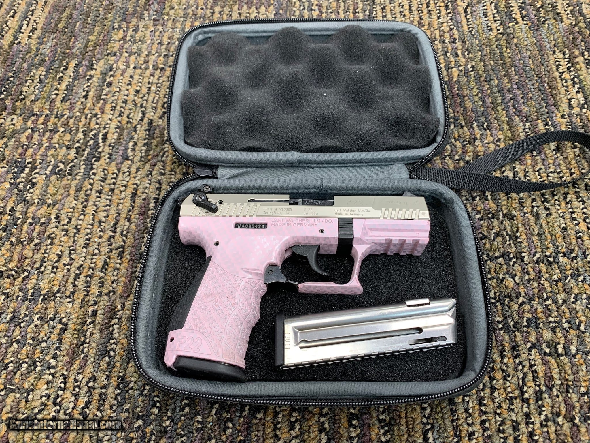 Description: Guns Listing ID: 553747 Walter P22 with a pink checkered lower end and stainless slide! Comes with 2-10 round mags and a carrying case! SOLD Manufacturer: WALTHER ARMS Model: p22 Caliber Info: .22 LR Condition: Used - Non-Certified Barrels: 3.5 BARREL Finish: STAINLESS |