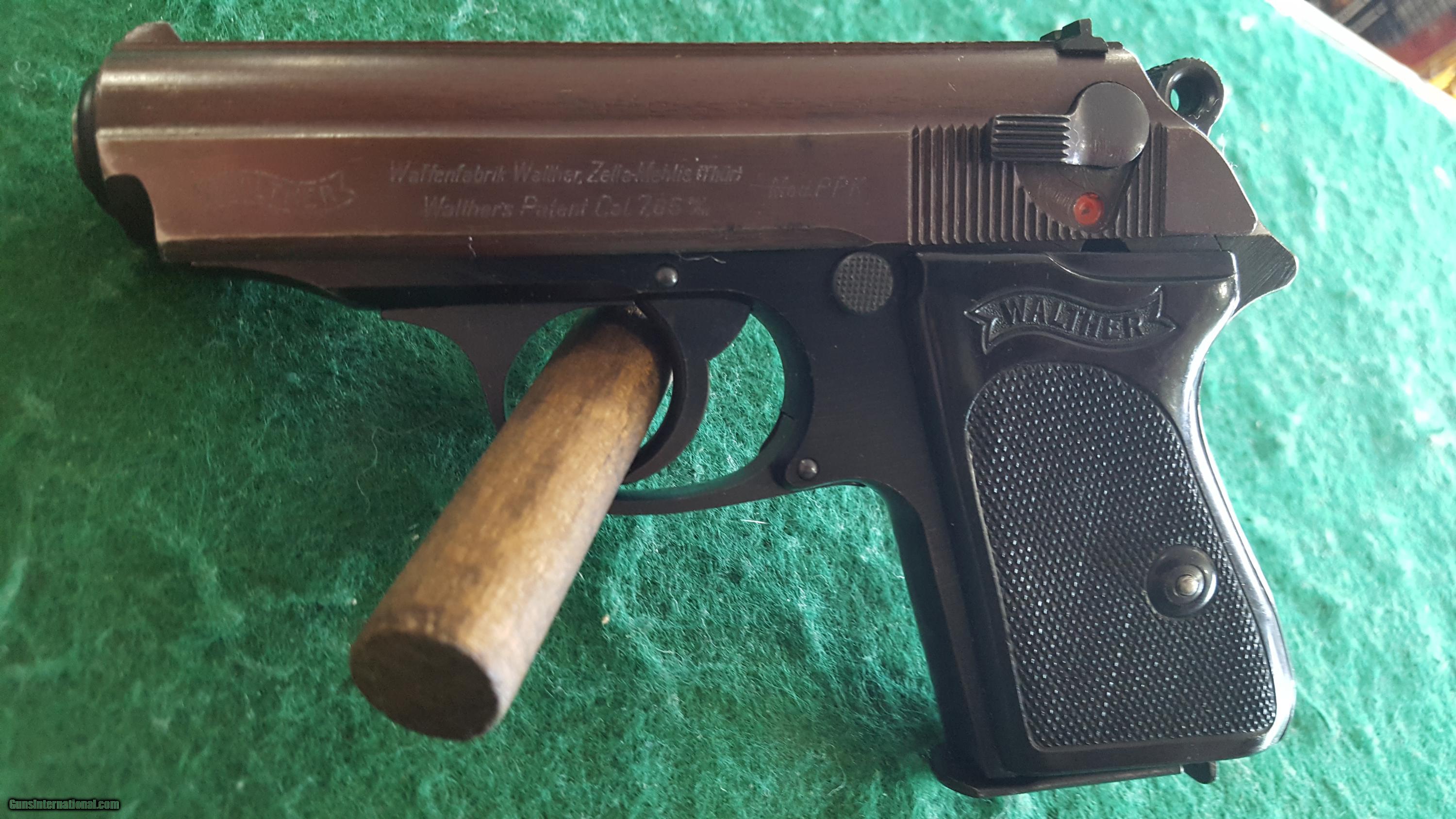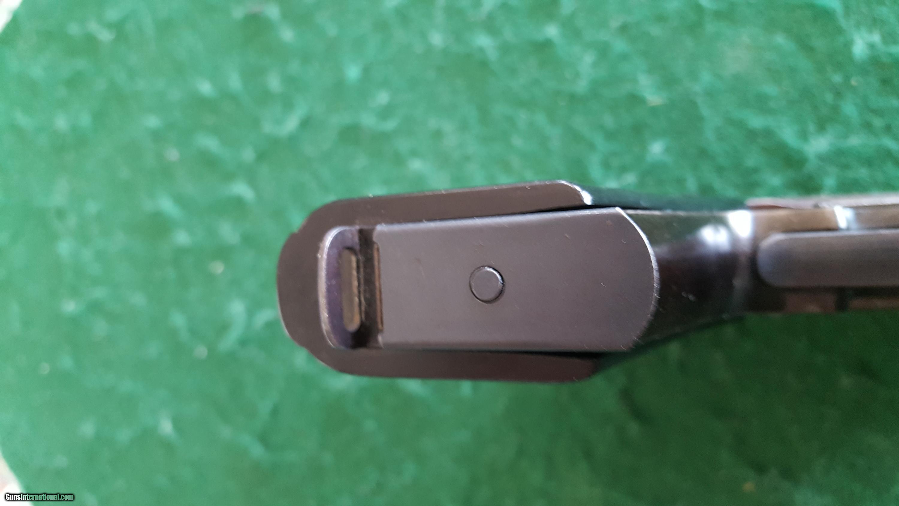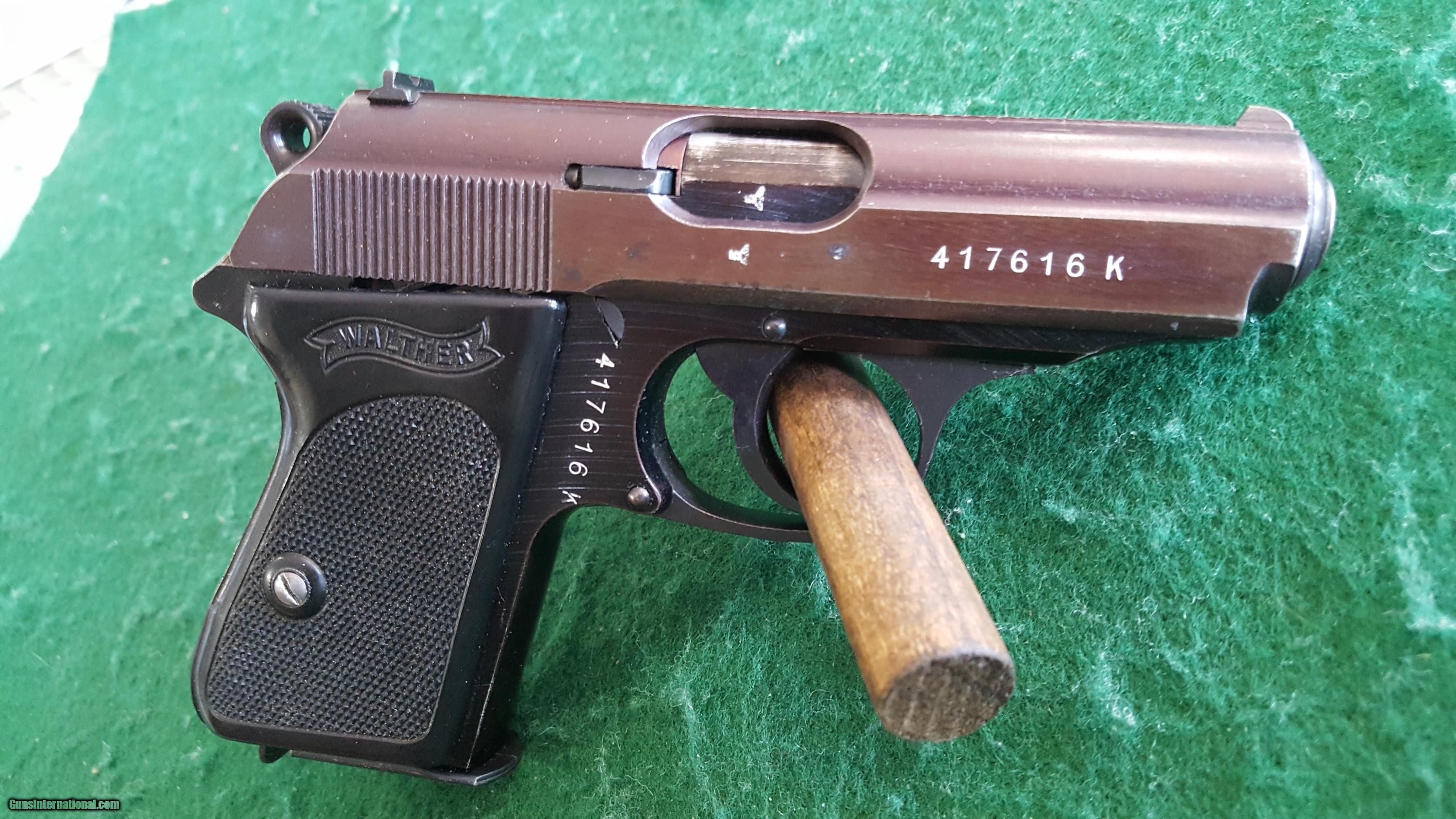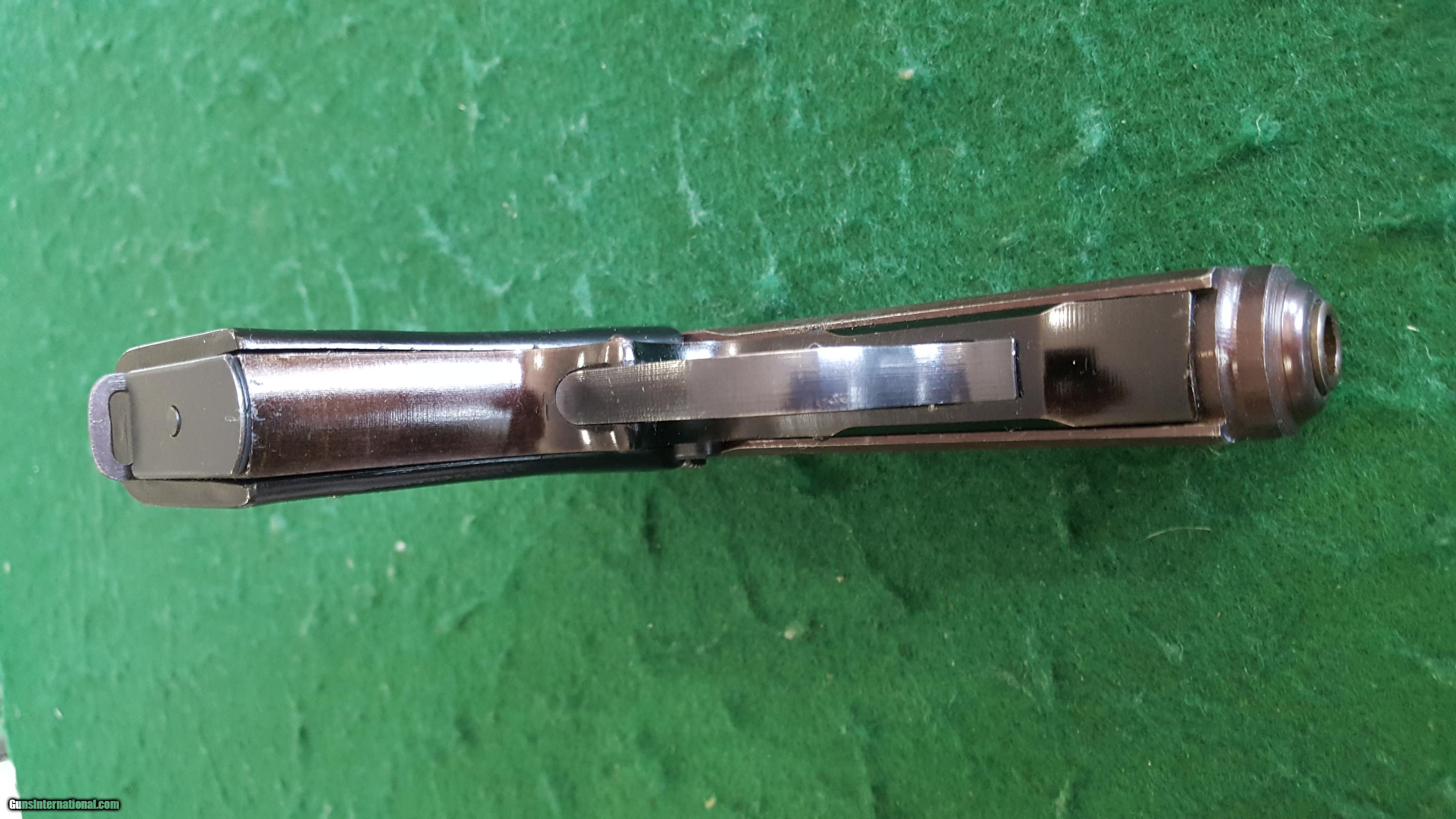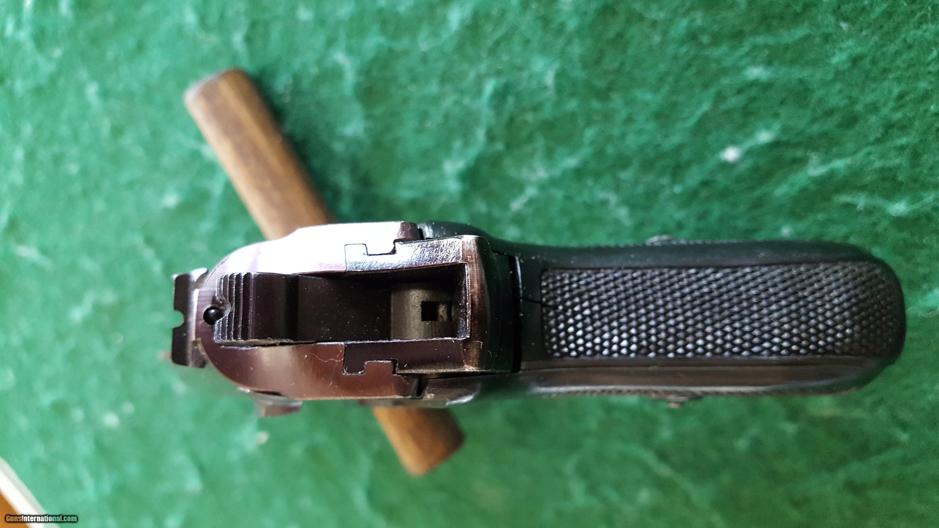 Description: Walther. Model PPK Dural frame pistol. Cal. 7.65mm. 3 1/4" barrel with a bright bore. (Scarce) Left slide with Walther banner, Waffenfabrik Walther, Zella-Mehlis (Thur)/ Walthers patent Cal 7,65/m", Mod PPK. Right side of frame and bbl marked with eagle N proof. Matching serial # on frame and slide. Dural frame. Black plastic grips. Condition is fine with most of the finish remaining. Light areas of pits on lower edge of slide mostly on right side, Light finish wear on high points. All markings clear. Grips have crack at rear on top. Excellent working order. Serial # 417616K. SOLD Curio/Relic: Yes |