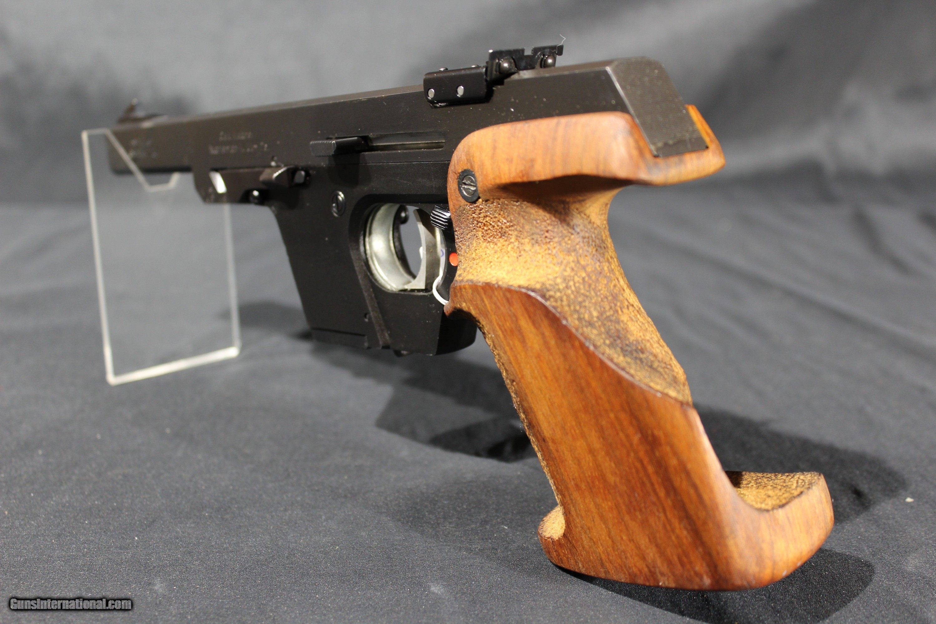 Description: Walther GSP in Very Good condition. Bore is in excellent condition as is finish. Grips are non adjustable. All around an excellent target pistol from 1974 a early model GSP. The Walther GSP, Gebrauchs Sportpistole (Sport Pistol for Standard Use), is a semi automatic, precision targetshooting pistol with an unlocked breech action made in Germany by Walther Sportwaffen. It has the same technical base as the Walther OSP and thus is almost identical in outward appearance, albeit slightly longer and heavier than the OSP. The GSP was introduced on the world market in 1968 and was chambered for .22 Long Rifle. At the end of 1971, Walther began offering the pistol in .32 S&W. Regardless of its original caliber, conversion units for the other caliber are available and easily interchangeable.[citation needed] The anatomical, adjustable walnut grips were also available, on order from Walther, for left-handed shooters. In 1988, Walther introduced a fully adjustable (for pull, stop, and angle) two-stage trigger that athletes could retrofit their pistols with. SOLD Handgun Caliber: .22 Long Rifle Manufacturer: Walther Model: GSP Condition: very good Metal Condition: Very Good Wood Condition: Very Good Bore Condition: Excellent |
