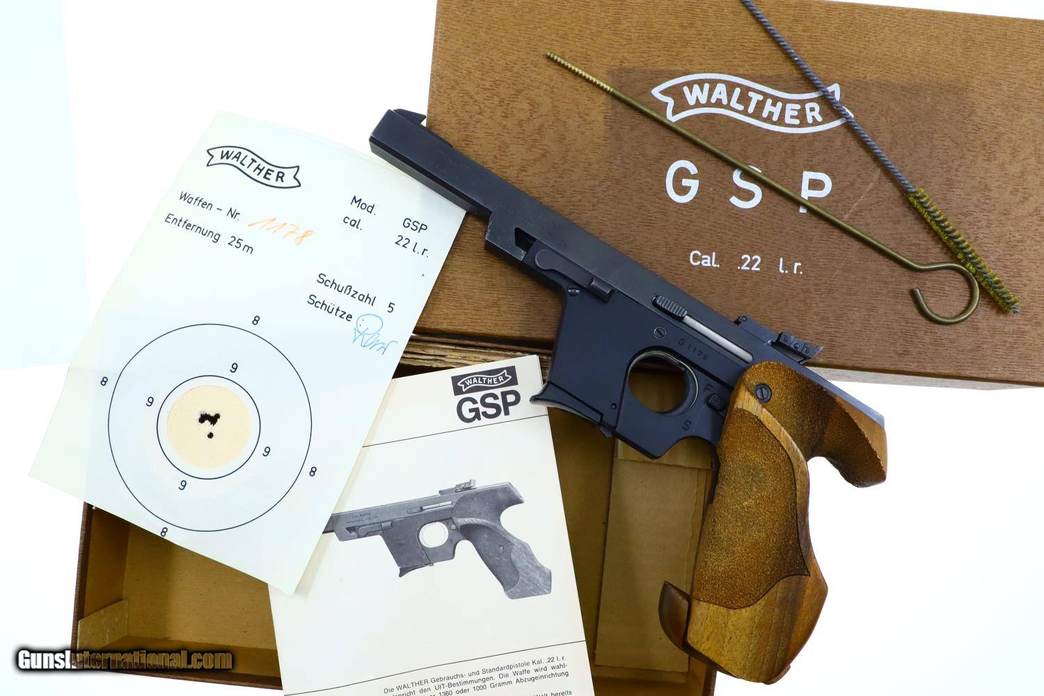 Description: Standard late configuration Walther GSP with removable patridge front sight having serrated ramp and fully adjustable rear sight. 4.5" squared barrel. Single action. Left side of barrel marked with model, caliber, manufacturer, serial number, and proof date of "69". Import marked on base of frame. Fully adjustable orthopedic wooden grips with textured surfaces and adjustable heel rest. Fitted with Walther magazine having an extended floorplate marked on the left side with the caliber. Complete with instruction booklet, original test target, cleaning implements, in crisp, original, wood grained Walther shipping box with end label reflecting serial number. Synopsis: Walther, GSP, German Target Pistol, Boxed with Test Target, in .22 LR. Condition: Excellent original finish, with grips showing staining and a few extremely minor handling marks. Mirror bore. Perfect manual mechanics. A great Walther GSP, particularly with its literature, test target, and matching shipping box. ~~Insured shipping fee of $55; most packages shipped using FedEx 2nd Day.~~ SOLD Manufacturer: Walther Serial Number: G1178 Caliber Info: .22 LR |