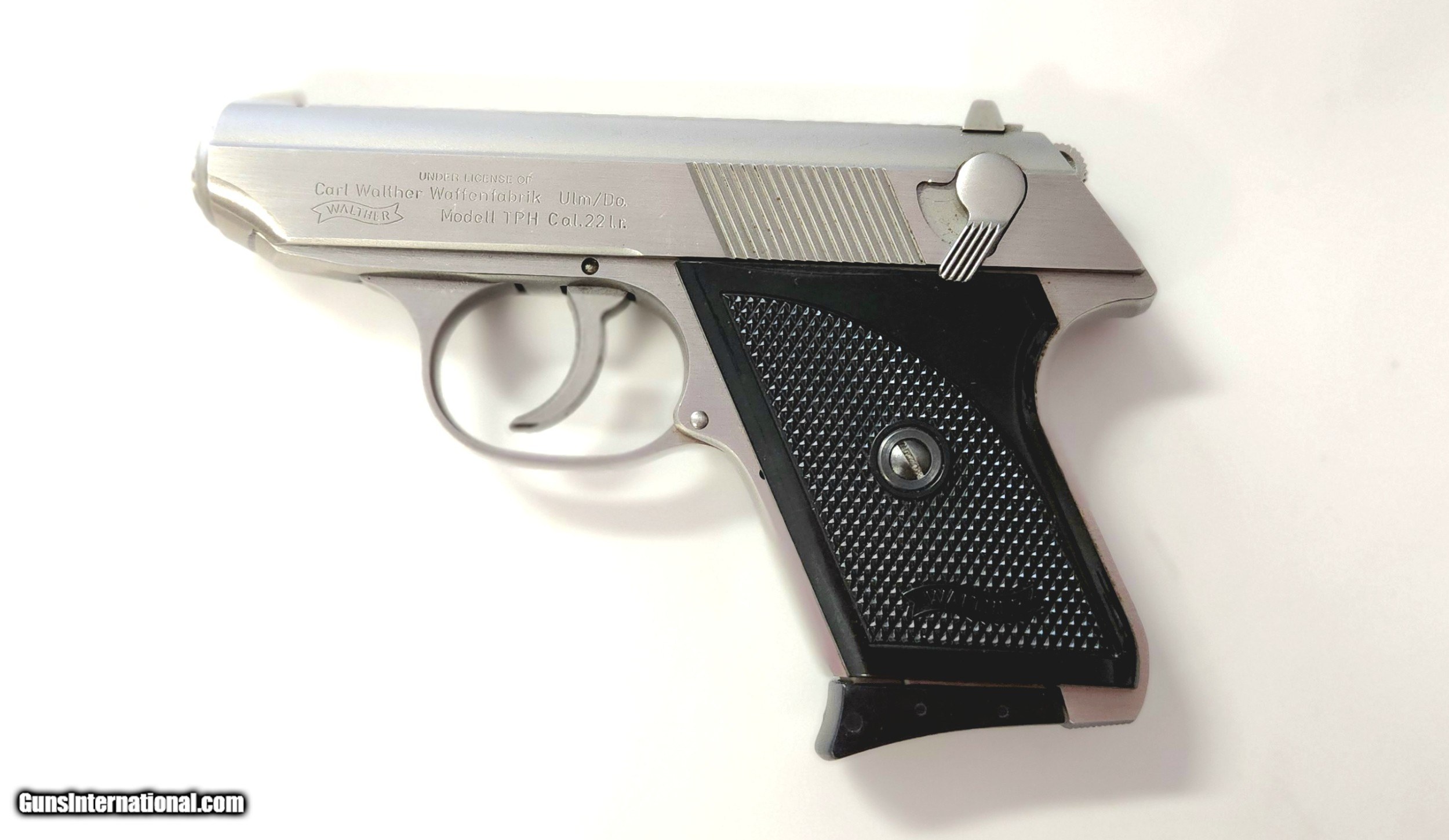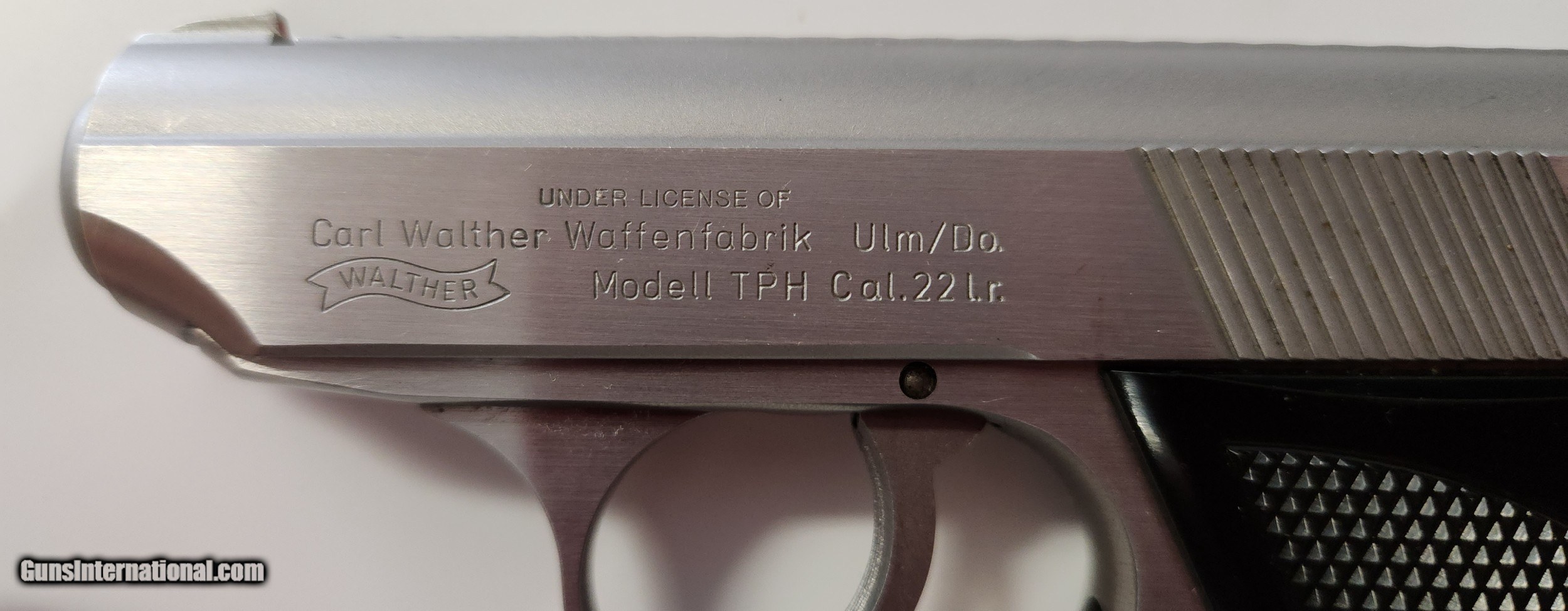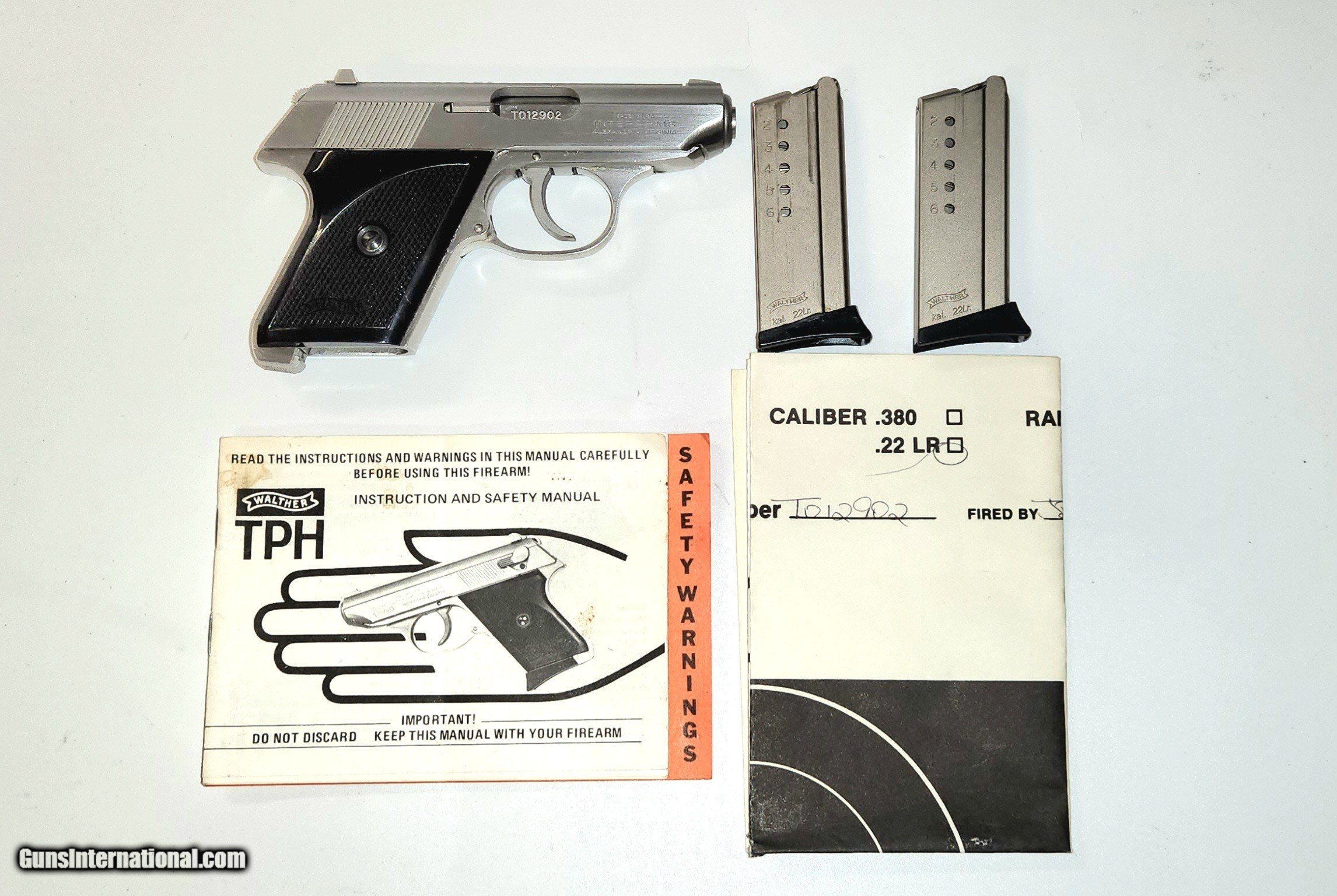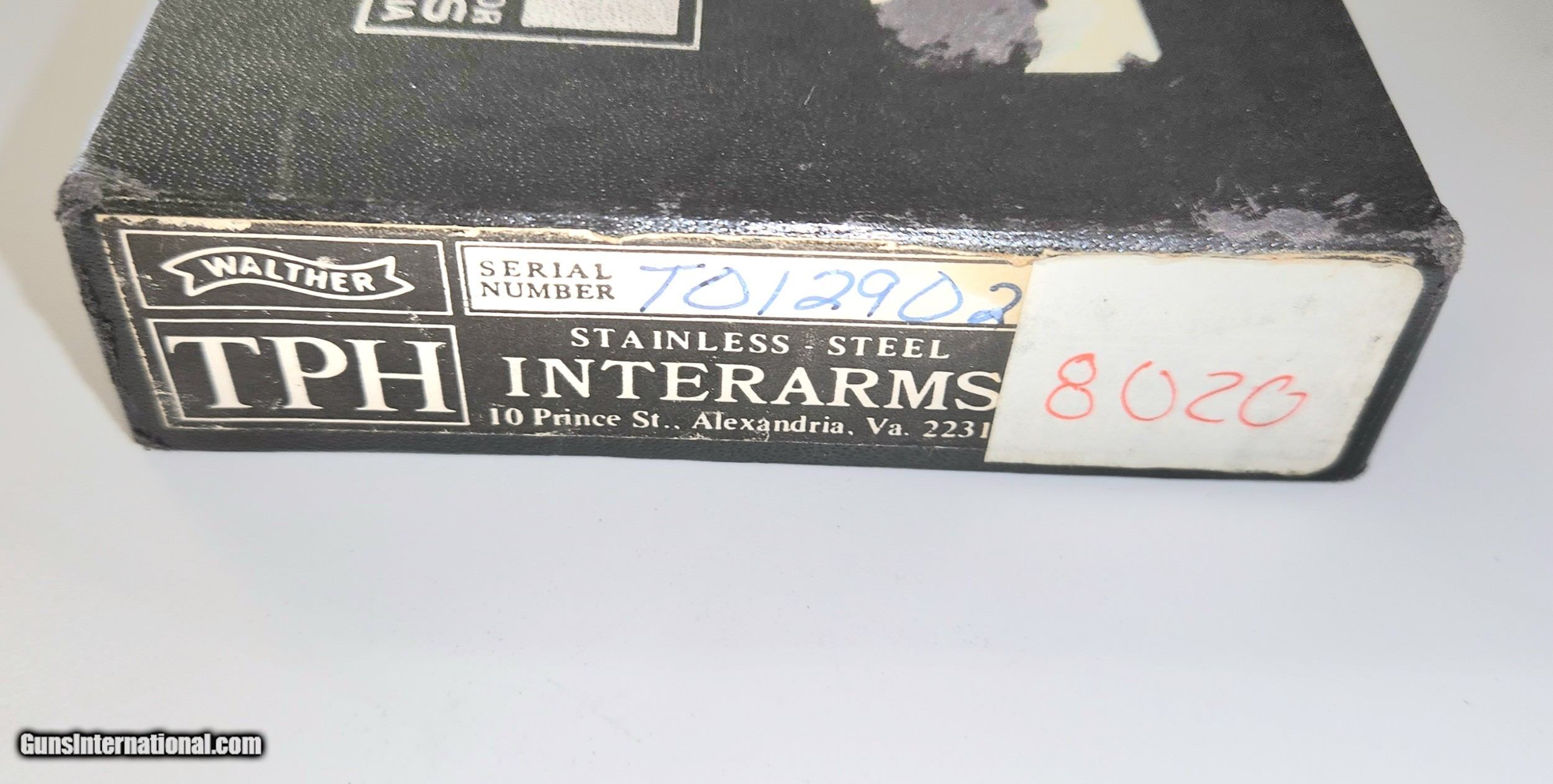 Description: Walther (Interarms) TPH .22LR 2-1/4"bbl SS Pistol w/Box, 6rd Mag Consignment sale. Walther TPH .22LR semi auto, manufactured in the USA by Interarms between 1987 and 2000. Stainless steel frame and slide, DA/SA hammered fired mechanism, slide mounted safety/decocker, and black plastic grip panels. Great working condition, second owner never fired the firearm. Very minor finish scuffs. Comes with TWO 6rd magazine and the factory box. SOLD Handgun Caliber: .22 Long Rifle Manufacturer: Walther Model: TPH Condition: Great working condition Metal Condition: Good, minor scuffs |