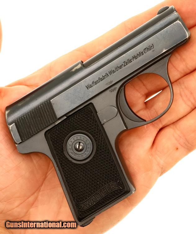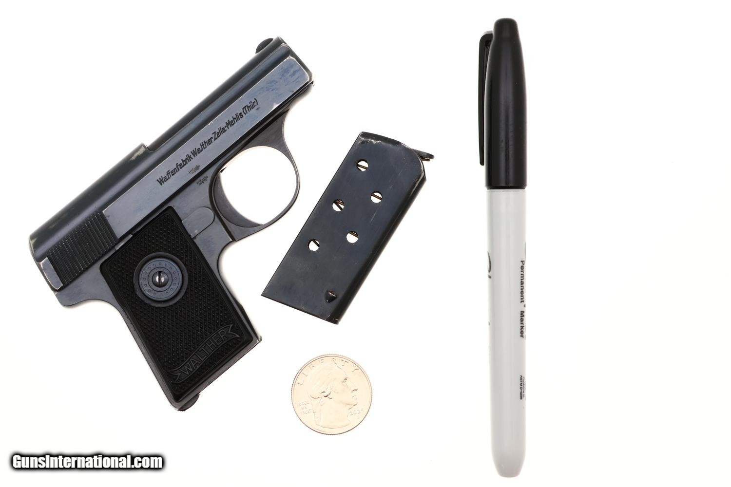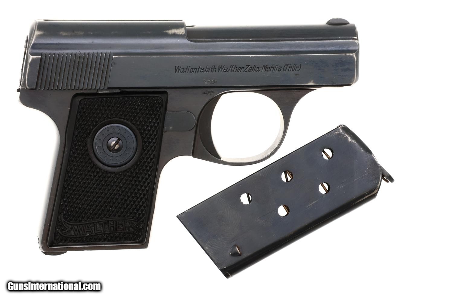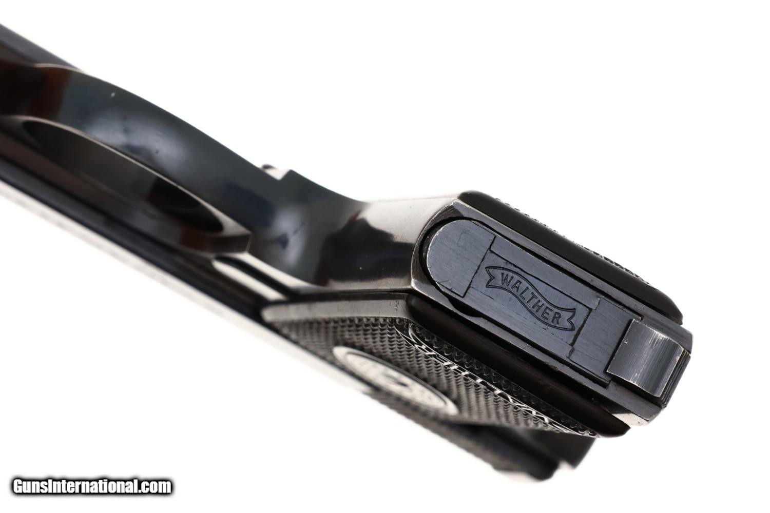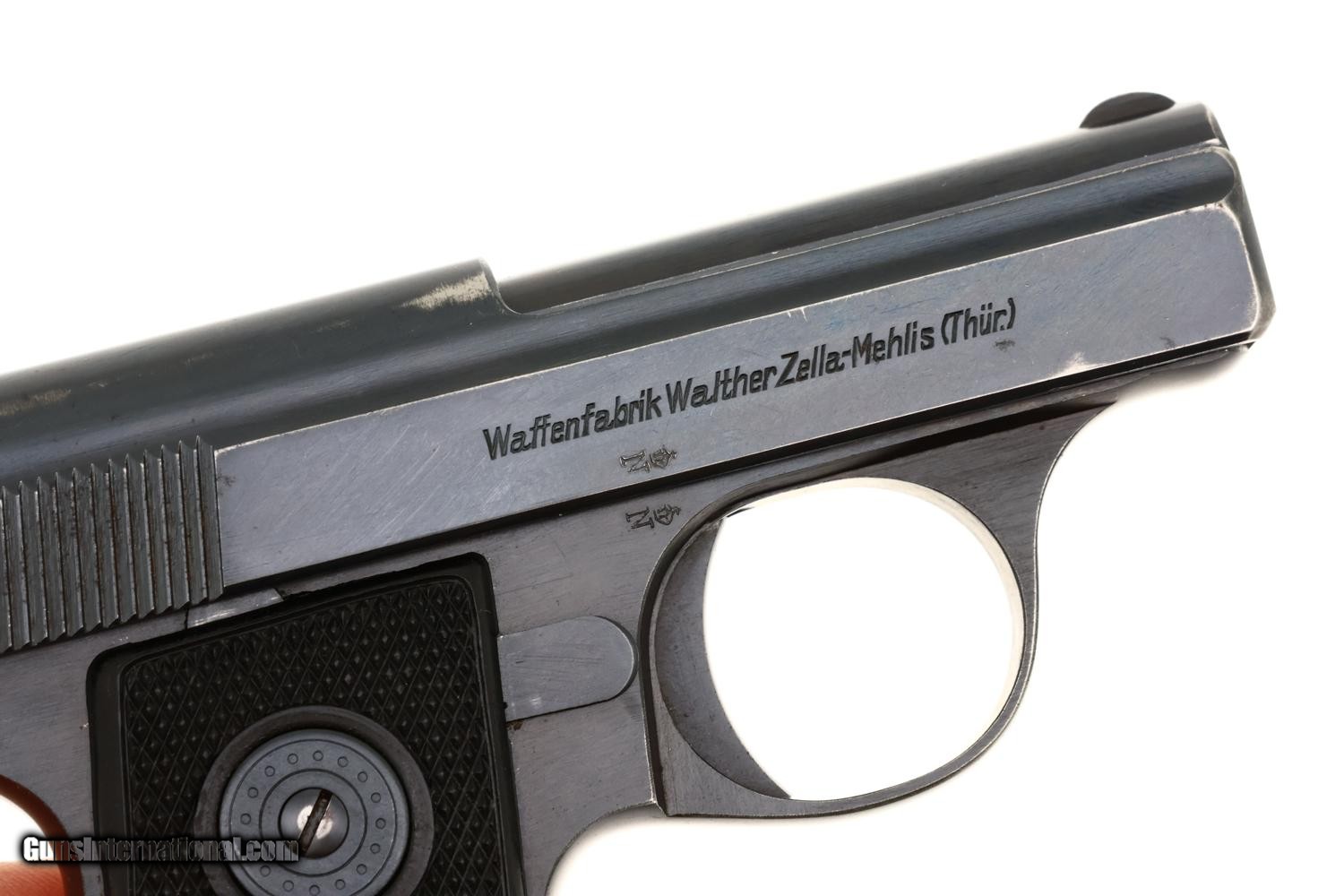 Standard configuration Walther Model 9 Vest Pocket Pistol with 2” barrel, fixed front sight and grooved rear sight. Walther patent, model reference, and banner on left side of the slide. Full SN on the left frame behind the trigger, near the safety lever having S/F detents. . "Waffenfabrik Walther Zella-Mehlis (Thür)" on the right hand side of the slide above the Crown/N inspection marks applied to the slide and adjacent frame. Black plastic grips, molded with the Walther banner and secured by a decorative washer and screw. Complete with six round magazine with five indicator holes and a recessed Walther banner on the bottom. Complete with laminated capture paper dated Sept 26, 1945 in which this pistol was specifically referenced by caliber and serial number