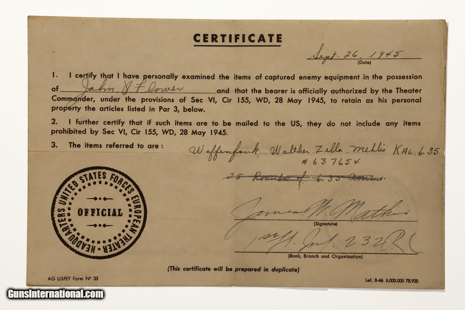 Walther Mod 9 Vest Pocket Pistol, WWII, Capture Papers,