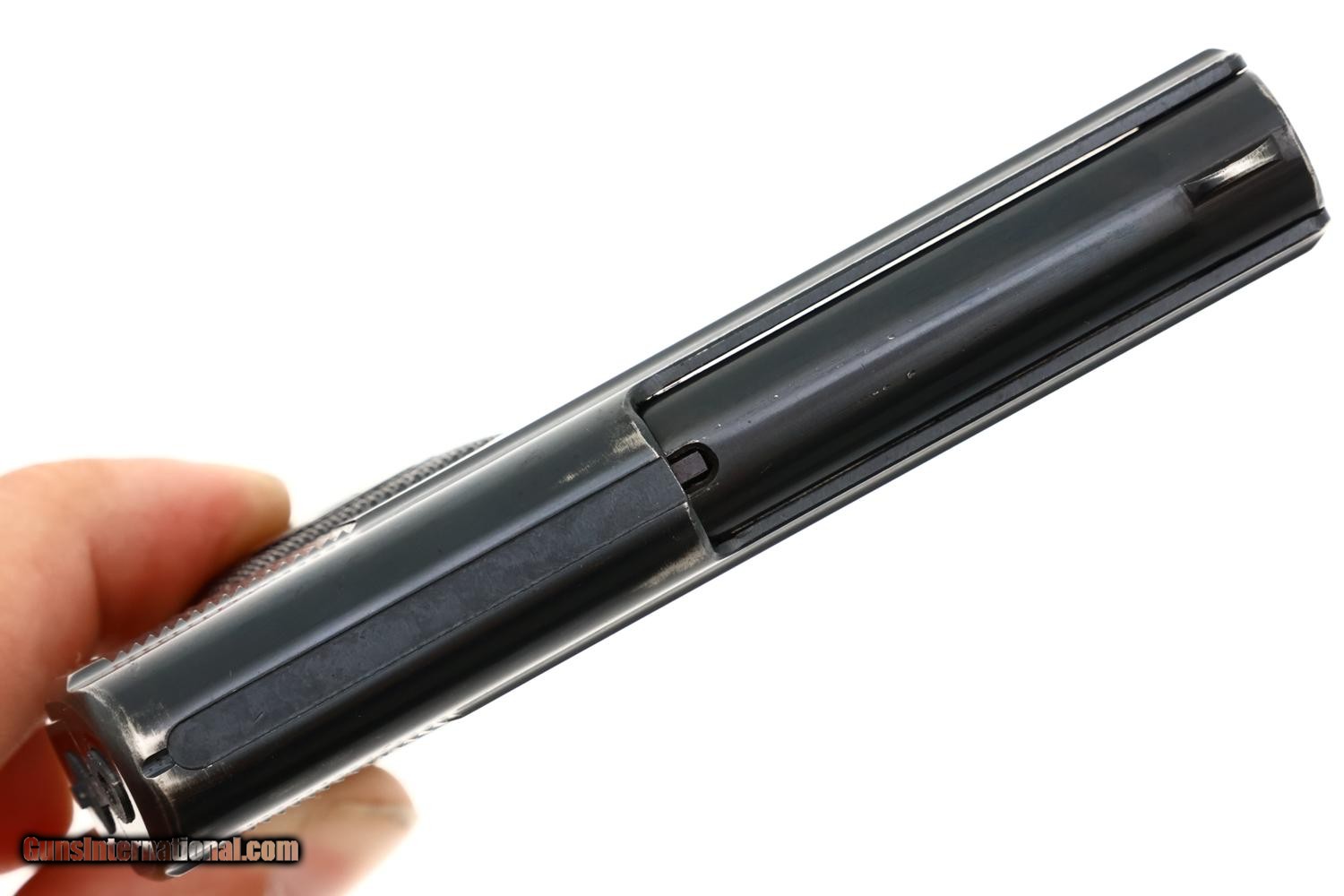 The pistol retains about 95-97&of its bright original salt blue finish with muzzle and sharp edge wear as one might expect from a carried vest pistol. Little thinning/wear of front and back strap. EXC grips with crisp checkering and magazine that shows little insertional wear. Mirror bright bore. Correct manual mechanics. EXC capture paper as laminated.