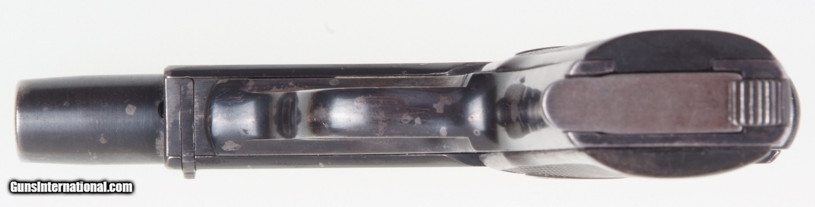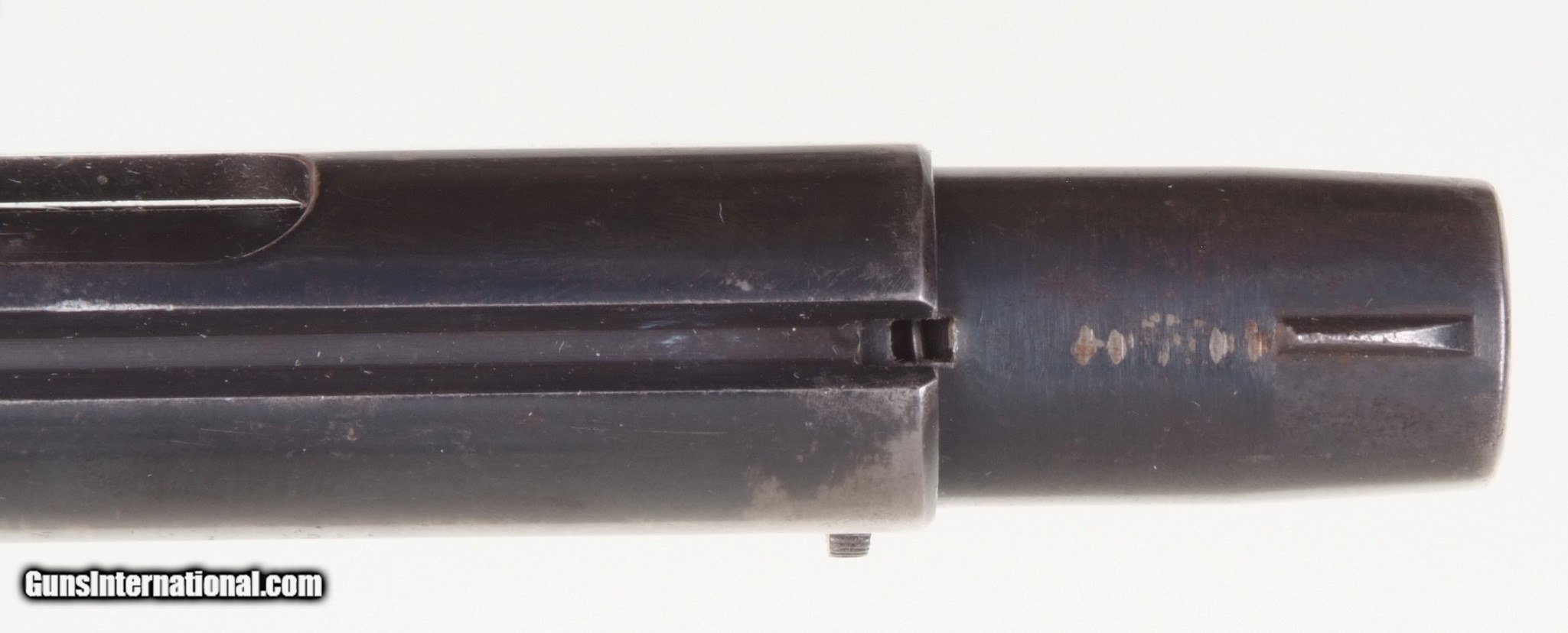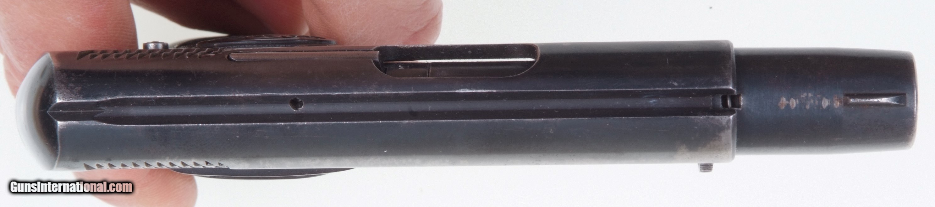Description: This first variation Model 4, made during WWI, has a 3.5” barrel, fixed front sight, and grooved slide to act as rear sight. Barrel bushing has a small rectangular recess that aligns with the slide groove to position the bushing. Left side of slide with single line Walther address over banner. Crown/N proofing on barrel repeated on left side of slide and adjacent frame. Usual S/F safety detents. Full serial number on right frame behind trigger. Hard rubber grips, possibly from a later pistol, each panel with an intertwined “C/W” over a checkered field. Bottom release magazine with right side of body having seven indicator holes. Synopsis: Exceedingly scarce Walther Model 4, usually termed the transitional Model 3/Model 4 by collectors, as its slide has most of the features of the Model 3 including the grooved sighting arrangement and manner of takedown. Condition: Approximately VG original blue with moderate wear and spotting as pictured. Excellent original grips. Comparable condition magazine. Bright bore with sharp rifling. Perfect manual mechanics. The most desirable of all the Model 4s! A HISTORIC INVESTMENT! ~~Insured shipping fee of $55; most packages shipped using FedEx 2nd Day.~~ SOLD Curio/Relic: Yes Manufacturer: Walther Serial Number: 31265 Caliber Info: 7.65 mm |