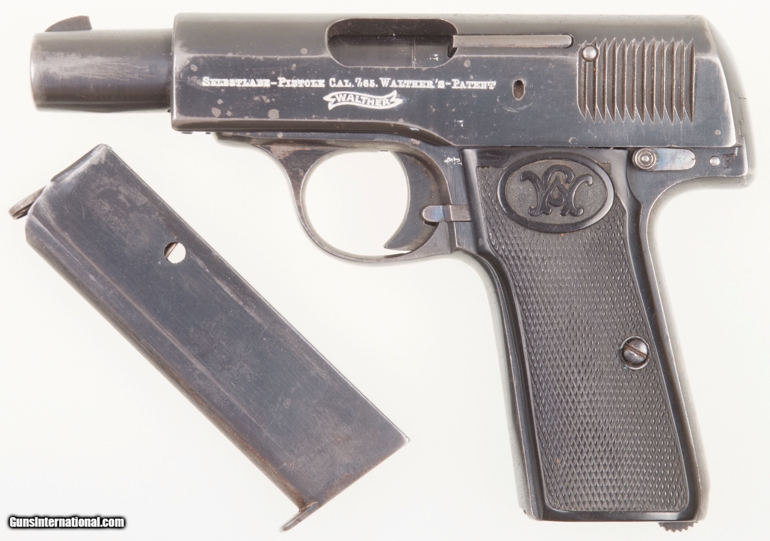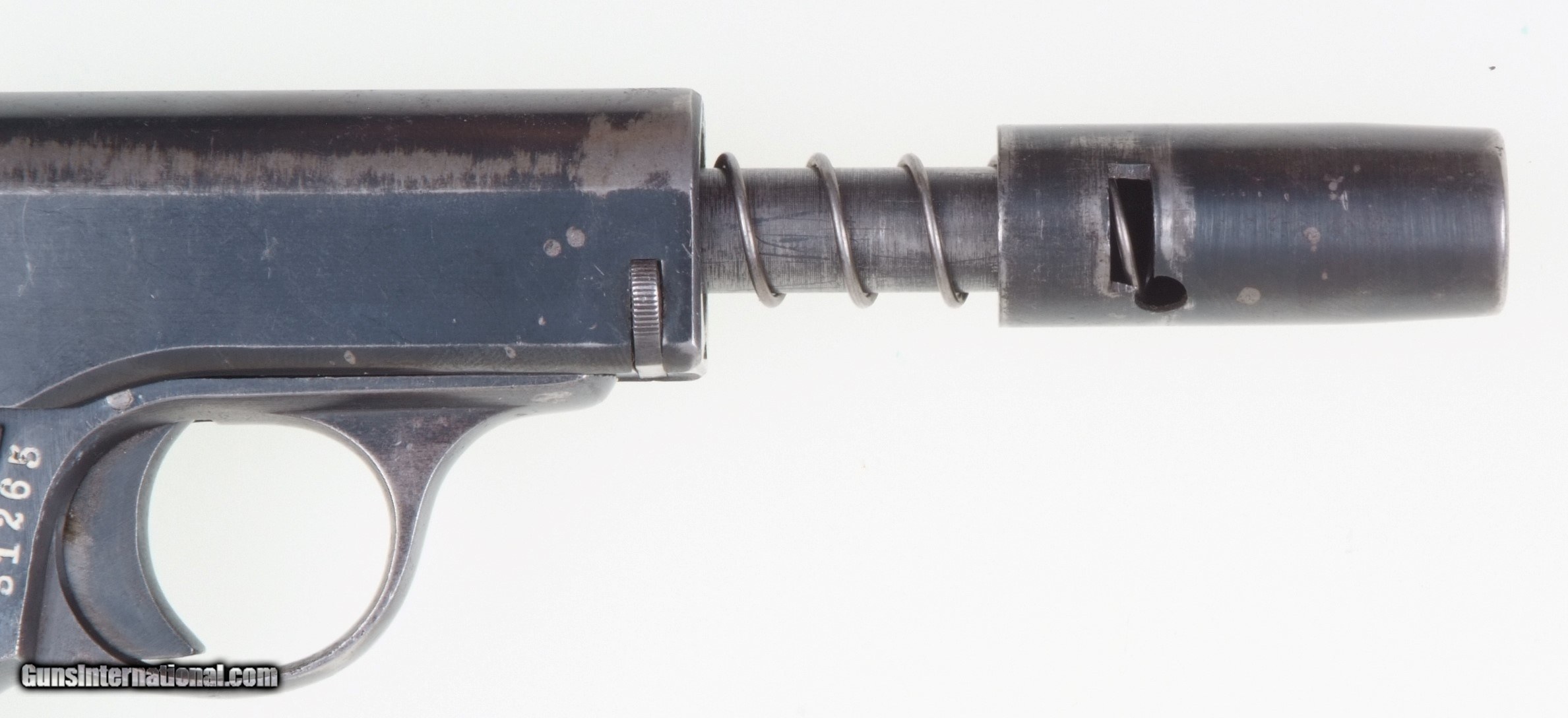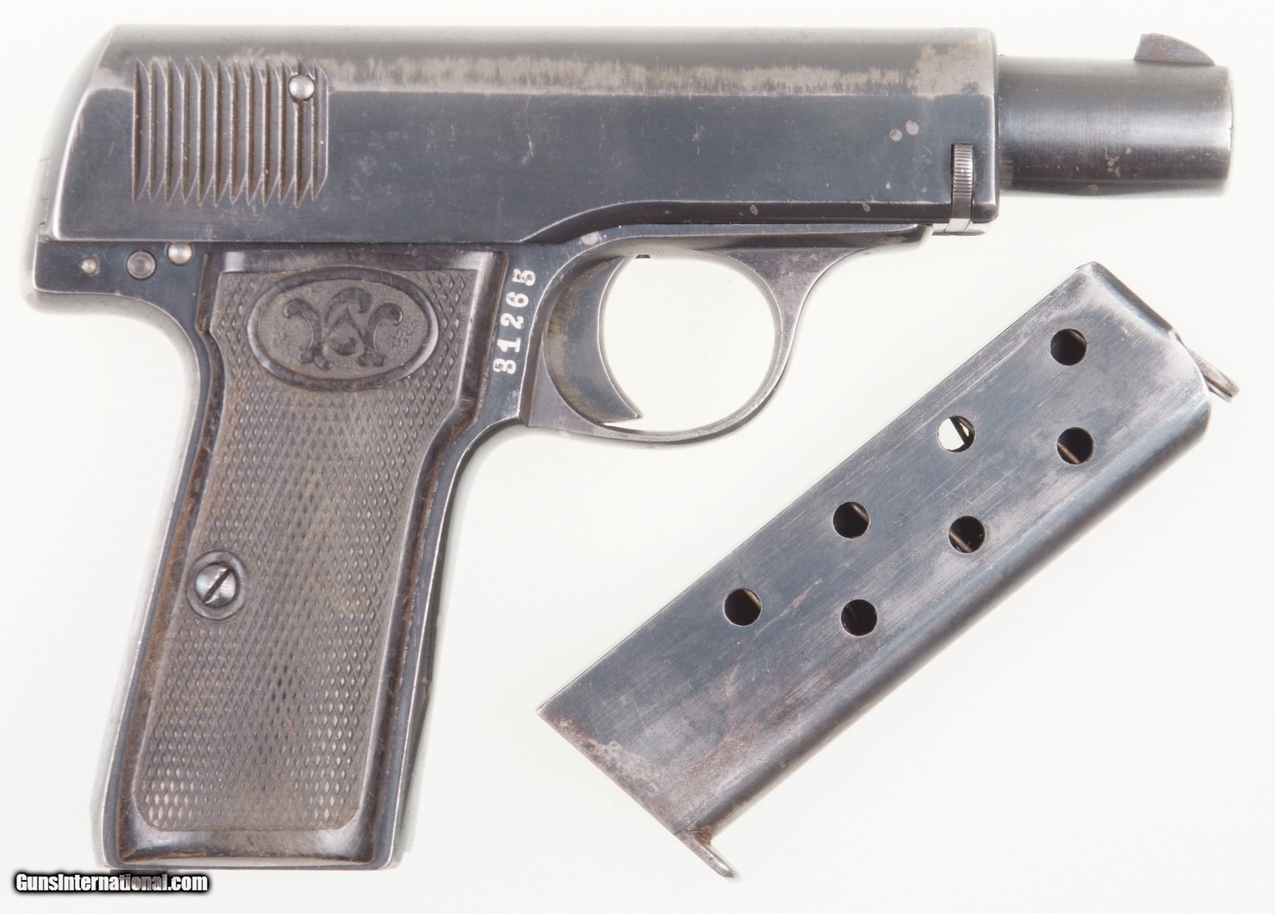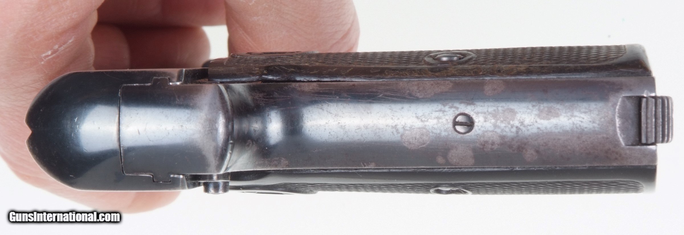 Description: This first variation Model 4, made during WWI, has a 3.5” barrel, fixed front sight, and grooved slide to act as rear sight. Barrel bushing has a small rectangular recess that aligns with the slide groove to position the bushing. Left side of slide with single line Walther address over banner. Crown/N proofing on barrel repeated on left side of slide and adjacent frame. Usual S/F safety detents. Full serial number on right frame behind trigger. Hard rubber grips, possibly from a later pistol, each panel with an intertwined “C/W” over a checkered field. Bottom release magazine with right side of body having seven indicator holes. Synopsis: Exceedingly scarce Walther Model 4, usually termed the transitional Model 3/Model 4 by collectors, as its slide has most of the features of the Model 3 including the grooved sighting arrangement and manner of takedown. Condition: Approximately VG original blue with moderate wear and spotting as pictured. Excellent original grips. Comparable condition magazine. Bright bore with sharp rifling. Perfect manual mechanics. The most desirable of all the Model 4s! A HISTORIC INVESTMENT! ~~Insured shipping fee of $55; most packages shipped using FedEx 2nd Day.~~ SOLD Curio/Relic: Yes Manufacturer: Walther Serial Number: 31265 Caliber Info: 7.65 mm |
