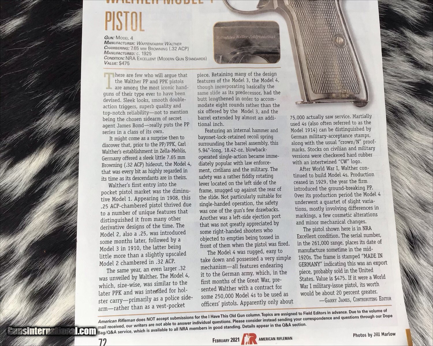 Description: Walther model 4, .32 acp. Used extensively by German military in WWI, and by police and military up into WWII. 8 shot,,blow back operated semi auto pistol, has a safety and ejects to the left! Well built, reliable to collect or put in your holster, a quality Walther sidearm at a great value price. Add 3% if paying with credit card. God Bless America from a proud American, and a Viet Nam Vet , thankful for our freedoms.. paid for by the Blood ,Sweat and Tears of our brave men and women in uniform. Ten Below Firearms is a Veteran owned and operated business. We specialize in out of production models of high quality firearms. We love to ship! If you are out of state or can't make it to our store, just give us a call! Handguns normally ship for $30 and Long guns for $40 to $55 for extra length long guns. That's 2-3 day USPS Priority shipping, Delivery conformation and with tracking number. Optional Postal insurance is additional $1.50 per $100 and highly recommended. SOLD Curio/Relic: Yes Handgun Caliber: .32 ACP (7.65x17mm Browning SR) Manufacturer: Walther Model: Model 4 Serial Number: 486600 Condition: Very good Metal Condition: Very good Bore Condition: Very good Action: Semi auto Finish: Blued |