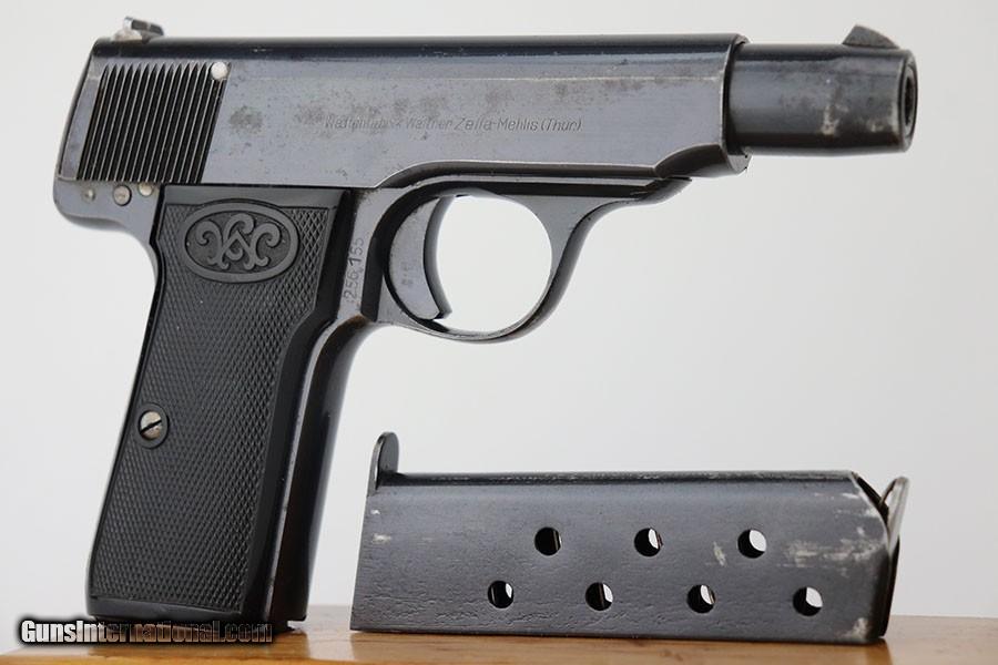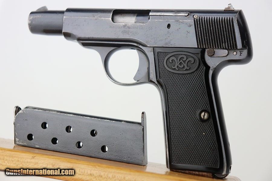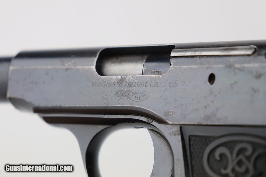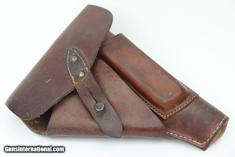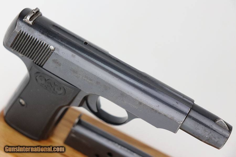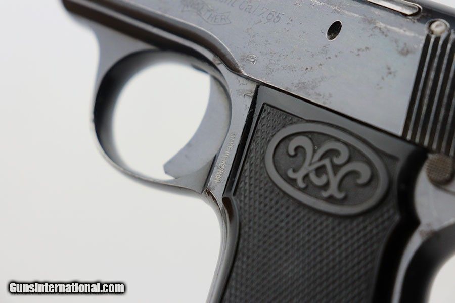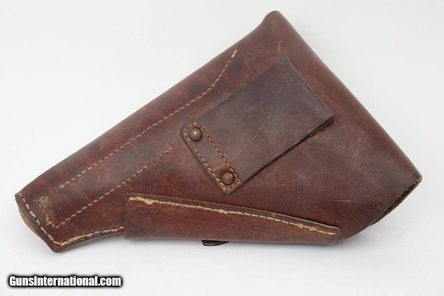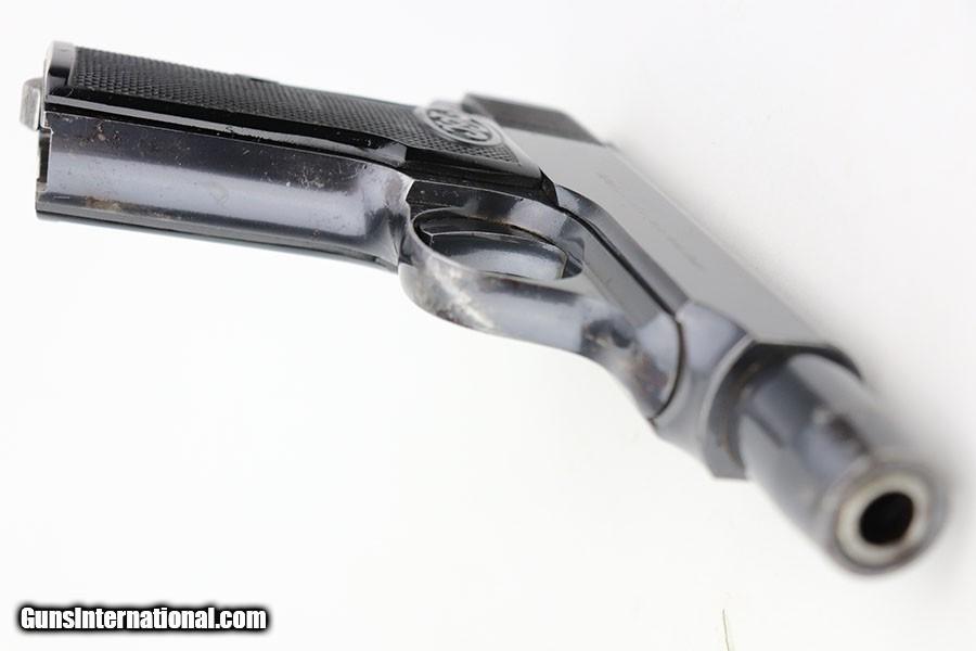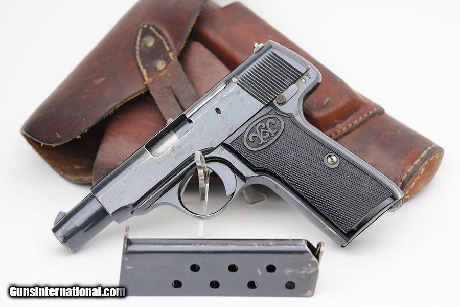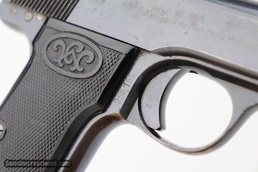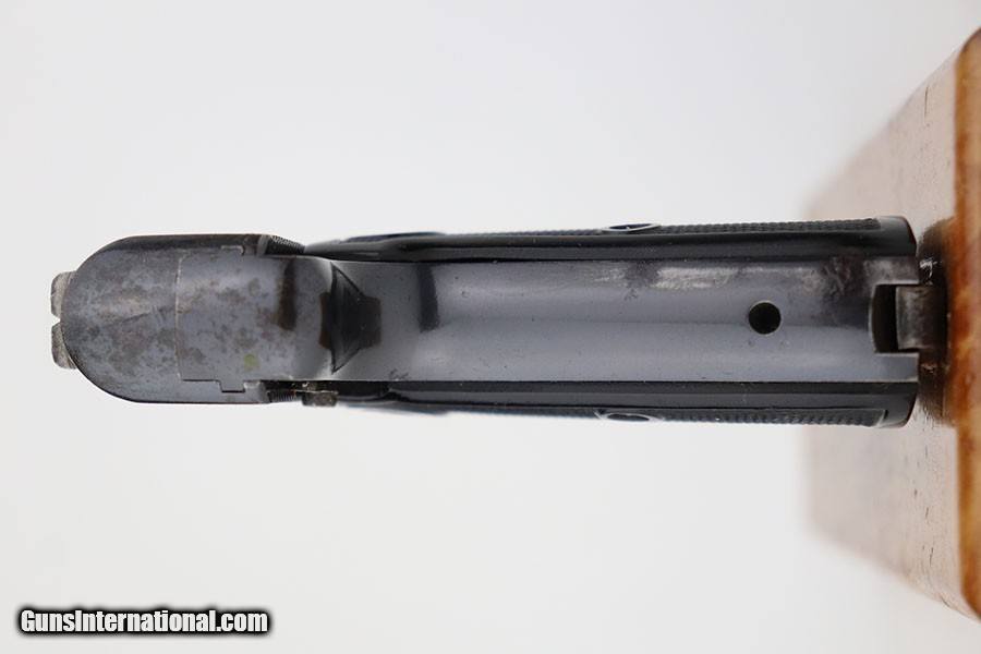 Description: This is a very nice example of a Walther Model 4 rig, manufactured in the 1930's. It is all matching and has the proper "Crown N" proofs. It has a Germany export mark, indicating it was sold in the international commercial market. The gun comes with what looks like a period correct leather holster that fits the gun but doesn't look like it goes with this model. The gun has retained about 91-92% of its original bluing. There is minor wear and pitting along the high edges of the slide and muzzle. Splotchy discoloration on both sides of the slide. Spotty wear and freckling on the straps. Comes with excellent grips and a period-correct magazine. The bore has good rifling but there is minor freckling throughout. SOLD Curio/Relic: Yes Handgun Caliber: .32 ACP (7.65x17mm Browning SR) Manufacturer: Walther Model: Model 4 Bore: 7/10 Condition: 91%-92% Manufacture Date: 1930's |