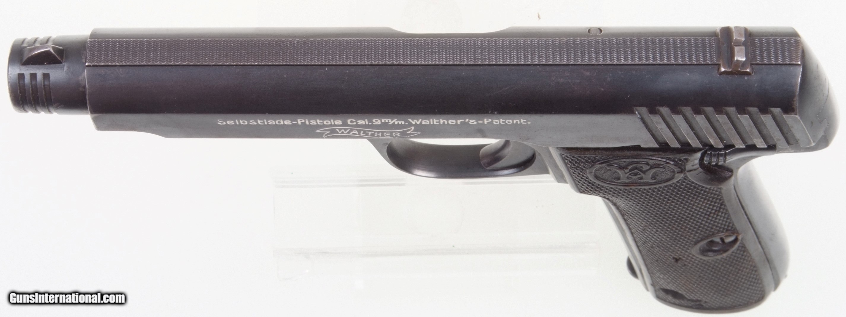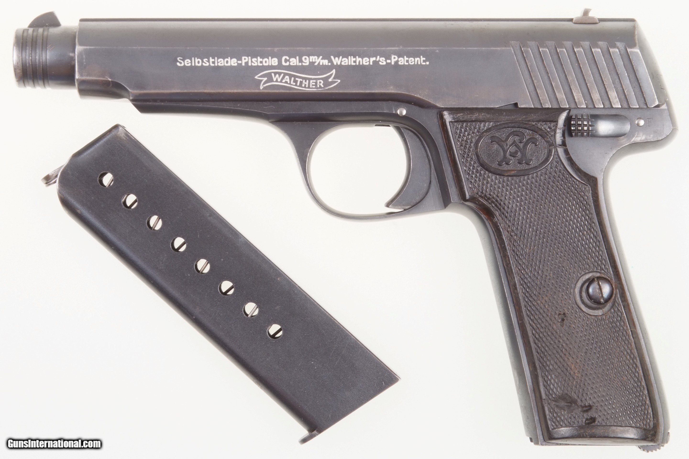 Description: Standard configuration Walther Model 6, single action blowback pistol, with 4.75 bbl, fixed front sight and drift adjustable rear sight. The left side of matching slide is marked with a single line legend “Selbstlade-Pistol Cal 9 m/m. Walther’s-Patent” over Walther banner. Right side of slide marked “Carl Walther, Waffenfabrik, Zella St. Bl.”. C/N proofing over the exposed chamber and immediately below on the slide and frame. SN “785” on the right upper trigger guard. Hard rubber grip panels each with an encircled C/W at the upper portion. Elsewhere checkered with a generous border and secured with a single screw. Unmarked magazine with eight indicator holes. Original rust blue finish that has been applied to all major and most minor parts except the fire-blued extractor (old replacement) and the grip screws. The most desirable and largest of the numbered Walthers whose production was limited to about 1,000 pistols. Synopsis: Large, impressive, and super desirable Walther Model 6 with original grips and magazine. Condition: Approximately 90-95% original rust blue with fading at sharp edges, back of slide, and front strap in areas of holster contact. Scattered defects in the left grip panel. Mirror bright bore and perfect manual mechanics. Sure to please any collector of Walther or rare automatic pistols. A HISTORIC INVESTMENT! ~~Insured shipping fee of $155; most packages shipped using FedEx 2nd Day.~~ SOLD Curio/Relic: Yes Manufacturer: Walther Serial Number: 785 Caliber Info: 9 mmP |