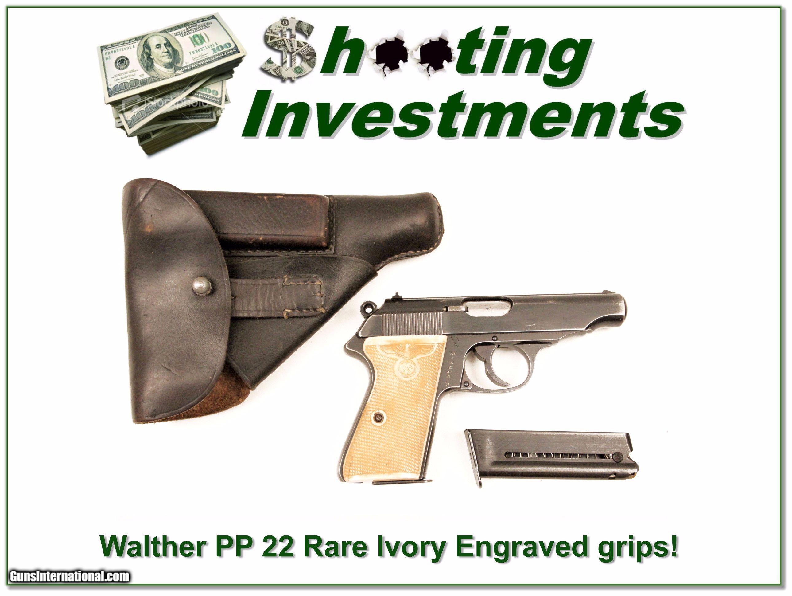 Description: Collectors, this is a very RARE Walther PP 22 auto with factory carved Ivory Grips. This is an Eagle N proofed wartime model with matching numbers and Party Leader Grips with eagle swastika on each side. It comes with original black holster and 2 magazines. It is in very good condition and will make a prized addition to any collection. I am selling this one on consignment and as such, lay-a-way can’t be used. It does of course have the standard 3-day inspection. Shipping and insurance is $65. Please email me with any questions or larger pictures. (Consign your quality firearms with Shooting Investments for only 10%! Let me know if you have any you would like to sell!) 16-0433 Payment: Payment is by Money Order, Cashiers Check or Personal Check. I can now also accept MasterCard and Visa with a 3% convenience fee. PayPal can be used for some items but never firearms. Please let us know if you would like to pay via PayPal. Shipping: The shipping charge will be listed in each description. It is $35 for most guns. Some heavy guns or those insured for over $2000 will be higher. Shipments to Alaska and Hawaii are higher because air shipment is required. Most firearms are shipped within 5 days of receipt of payment. We prefer shipping at the beginning of the week to avoid firearms in transit over weekends. We package all shipments carefully and insure them for the full purchase price, rounded up to the next $100. In the unlikely event that damage occurs, it is important that you save all packaging material for the claims process. Optics are shipped Priority Mail and most other non-firearm shipments are shipped First Class. Returns: Our return policy is simple. If for any reason you are not pleased with your purchase, you may return your item for a refund. The only exception is ammunition, it cannot be returned. It is important to us that you are happy. Guns cannot be fired or dissembled before returning them and must be returned in the same condition as received. Notification of a return must occur with-in 3 days of receipt at your dealer. Shipping, convenience and dealer fees are not refundable and are the responsibility of the buyer. Lay-a-way: If needed, we offer a 60 day lay-a-way option on most firearms. It is 1/3 now, 1/3 in 30 days and 1/3 in 60 days. Lay-a-way firearm sales are final. Consigning your firearms with Shooting Investments: We will help you get top dollar for your firearms. While most local guns shops charge 20% or more, our fee is only 10% with a minimum of $50. At your local gun shop it might take months to sell. Selling on-line provides instant access to thousands of interested buyers. You won’t find any other on-line dealer willing to sell your firearms for only 10% or listing every gun on 4 separate s. Selling through an House typically costs the seller 15% and the buyer an addition 15% (so 30%) and you have to wait several months to sell and longer to receive funds. If properly priced, we will sell your firearms in a week or two. Send us an email or give us a call and we’ll explain how easy it is for you to get top dollar. Trading: We collect guns and usually just trade for guns we want to add to our collections. We often sell guns for others wanting to purchase one of ours. We find this the most fair to both of us. Our Commission is only 10% and we hold the gun you want until yours sells. Please contact us if you want to sell one of yours to buy one of ours. Help for California Buyers: We are happy to ship to California. It is the buyer’s responsibility to make sure any item you buy is legal in your state. We are also happy to help with your purchase of a firearm from someone other than us. If you see a gun you would like to buy but the seller can’t or won’t ship to California we can help. You buy the gun and have it shipped to us. We’ll then ship it to your California dealer. The cost for this service is only $30 + shipping. Let me know if we can help! SOLD |