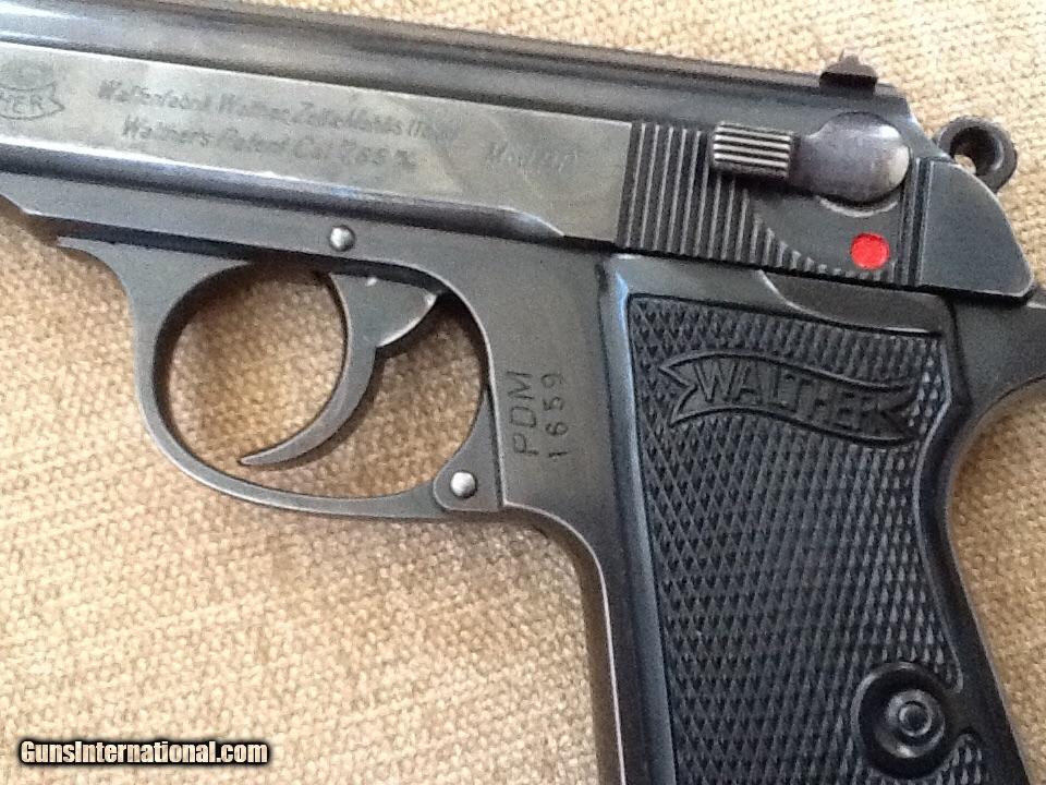 Description: Walther model PP .32 auto with original holster and two magazines. This rare piece has PDM 1659 marked behind the trigger on the left side of the frame indicating Police Department of Munich. It is all original, and not a recent import marked gun. The gun is tight, and sound with original perfect grips, and only light bluing edge wear. Both magazines are Walther stamped, and not chipped or damaged. The originally black holster has been brushed to a brown suede finish. Please examine the photos to determine actual condition. Certified checks or USPS money orders only accepted. Shipping at actual cost dependent on buyer location. Sorry, cannot ship to Calif., NYC, and N.J. will not recognize C & Rs. Please use email or leave phone message for questions, or to purchase. SOLD Manufacturer: Walther Model: PP Serial Number: 941722 Caliber Info: .32 Metal Condition: 85% Bore Condition: fine |