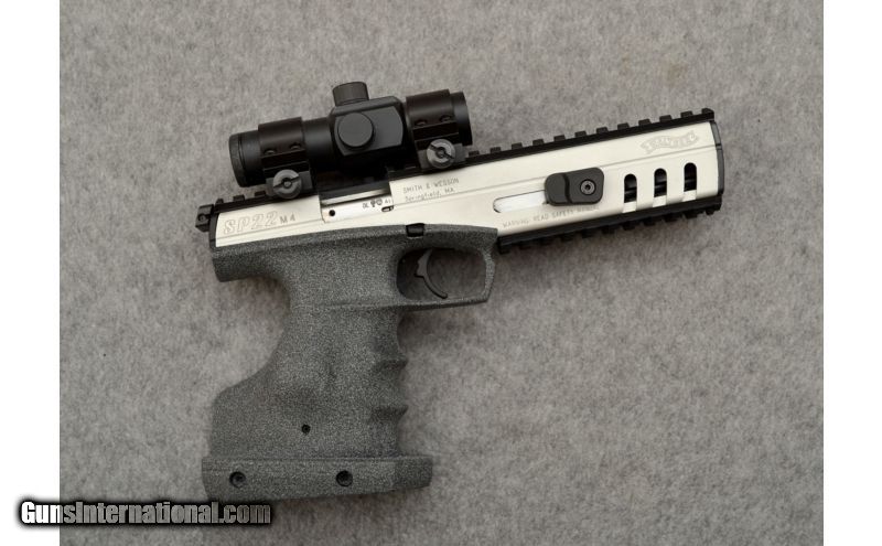 Description: Walther Model SP22m4 Target Pistol .22 LR. 6" barrel, Picattiny rail top and bottom, target grip with finger grooves and adjustable for height and a Walther optic, a non-magnifcation electronic red dot sight, adjustable for brilliance. Includes the original Walther plastic case and two magazines (2 total). Manufactured by Walther in Germany and marketed and sold by Smith & Wesson here in the states. See bullet points for additional information. SOLD Caliber Info: .22 Long Rifle. Metal Condition: Exellent condition. Wood Condition: Exellent condition. Bore Condition: Exellent condition. Barrels: 6" Barrel. Triggers: Adjustable for let off. Stock: Grey composite, finger grooves with adjustable height hand rest. Should fit men's medium to large hand size. Weight: 2.25 Lbs. with optic. Sights: Walther optic, a non-magnification red dot sight. Uses a standard nickel size Lithium 3 volt battery #CR2032. Item Location: Boise, ID |