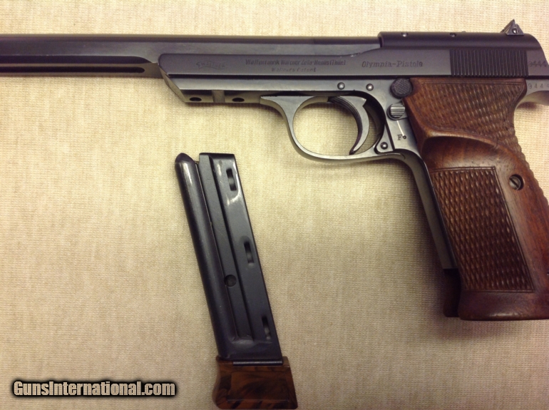 Description: This is an extremely high-condition Walther Olympia 1936 Schnellfeuer (Rapidfire) pistol! Single action with internal hammer. It features a 7.4 inch flat-sided barrel, a 6-shot magazine with synthetic wood-colored base, and the later version matte black slide. Grooved and tapped holes for weights. Left side frame markings include the Walther banner, "Waffenfabrik Walther Zella-Mehlis (Thür.)" above "Walther's Patent" and "Olympia Pistole". Right side reads "CAL.22 kurz". It is marked with the very late serial number 9444O. This is the latest serial number I've encountered. The "O" suffix is presumed to mean it was for the Olympic team. This particular gun obviously wasn't used as it remains in nearly AS NEW condition! As it is such a late gun, it's likely the arrival of WW2 figured in it remaining in such high, original condition. This gun cannot be improved upon! I'll also soon be listing a very nice 1925 Walther Olympia, so check my other s. SOLD Curio/Relic: Yes |