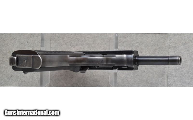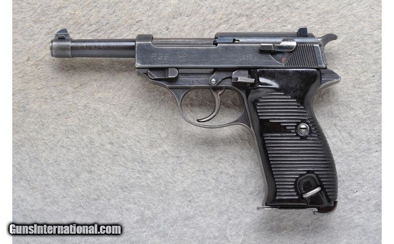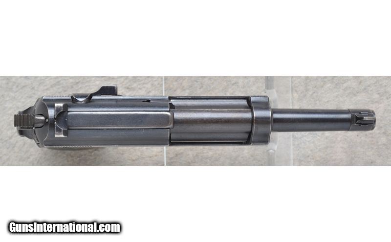 Description: This Walther Model P.38 is a right hand double action semi-auto pistol in 9mm Cal. It has a 5 inch barrel with a rear serrated slide. A blade front and notch rear sight. The grip is a ribbed black Bakelite. It has a serrated hammer spur. Serial Number 1918B. The left side of the frame is stamped P.38, ac42 and 1918b. The right side of the frame is stamped with 3 German eagle symbols. The number on the magazine bottom matches the gun serial number. 9mm Luger SOLD Chambers: Semi-Auto 9 round magazine. Metal Condition: Good with light blue wear. Bore Condition: Very good. Barrels: 5 inch barrel with a rear serrated slide. Triggers: Single Action / Double Action Weight: 34 oz. Sights: Blade front. Notch rear. Item Location: Richfield, WI |
