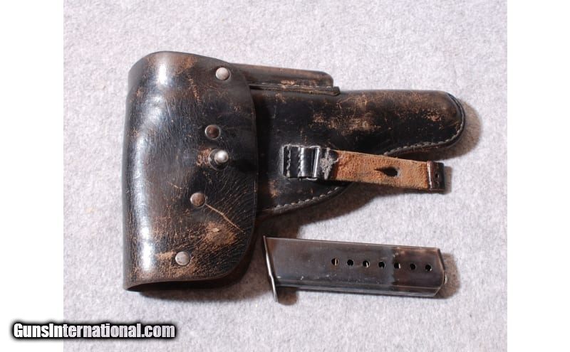 Description: This post-war production P-38 provides the ergonomics of the original with the advantage of an alloy frame. The slide is marked 5/63, the holster shows wear from use. 9mm Luger SOLD Chambers: 9MM Metal Condition: Bluing worn on the high points Wood Condition: Some wear Bore Condition: "Shiny, rifling sharp Barrels: 5 Triggers: Double Action / Single Action Weight: 29 oz Sights: "Factory, Fixed Item Location: Rapid City, SD |