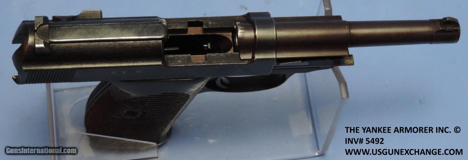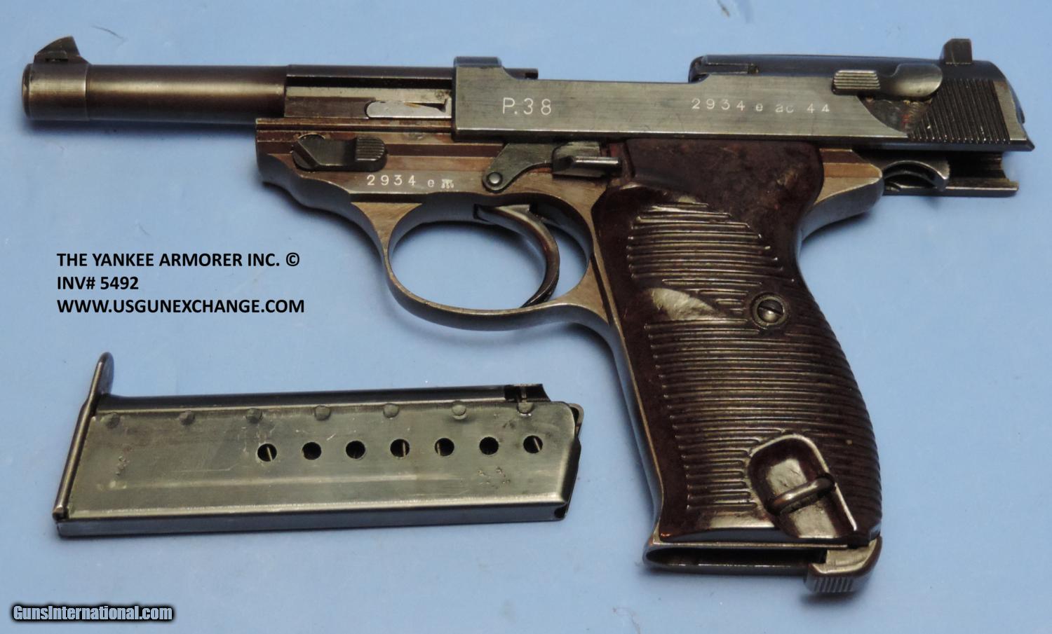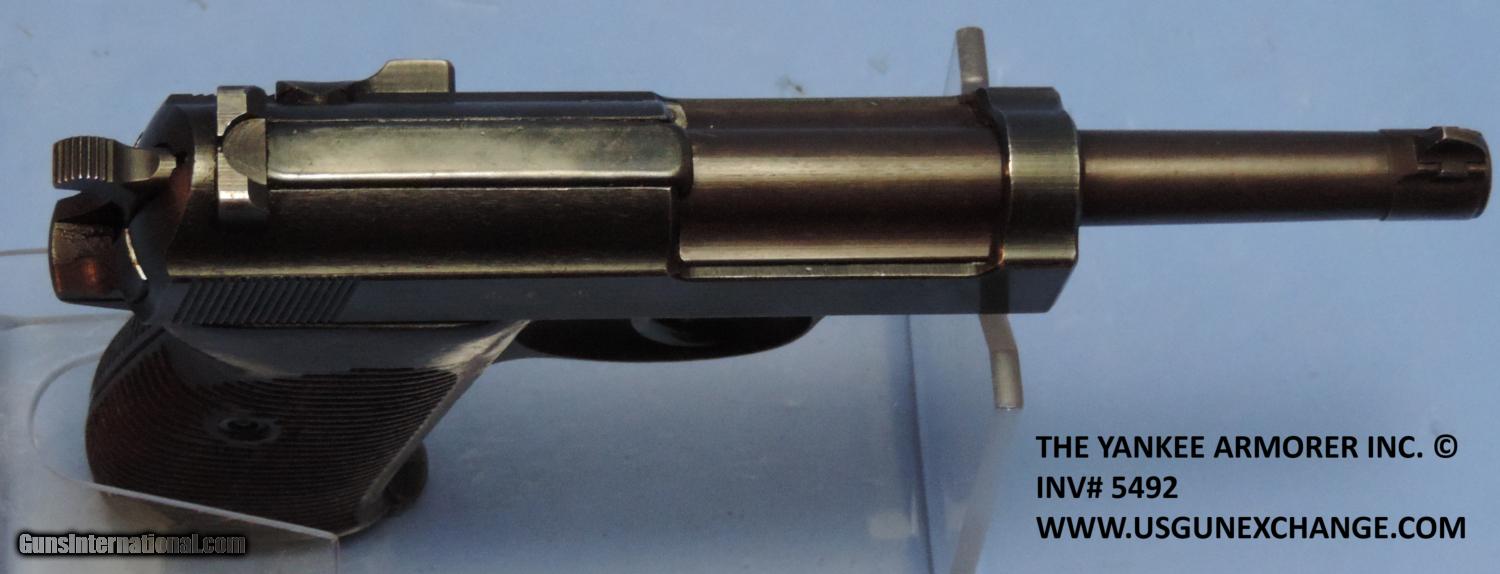 Description: Inv. 5492 Walther P-38, Caliber 9 mm, Serial Number 29XX e. Stamped AC 44. Remarkable, just remarkable. The bluing is an honest 98% with just some edge silvering, no pits or rust anywhere. The barrel assembly and frame slightly plum color that Walther’s of this period are known for. The plum looks slightly thinner than the blued surface and this too is normal. The grip strap shows just the slightest hint of thing. All numbers match. The slide is stamped Eagle/356, Eagle/Swastika, Eagle/356.The frame Eagle/356. The brown mottled grips are flawless, no chips or splits. The bolt face and feed ramp show no use. The bore like rest gun is super. The bore like the rest of the gun is outstanding. The rifling is sharp, crisp, and bright without a trace of graying. Just Minty. This is a winner either in a collection or on the range. $1195. To purchase this firearm or if you want to request more information contact us at: Email ckgunsymail Phone 201-512-0002 Cell 201-575-6838 FAX 201-215-4759 We accept most major credit cards. Prices shown are Discounted 3% for Cash or Check. The buyer must be familiar with all the laws governing the purchase and the ownership of firearms in their own city and state. The Yankee Armorer, Inc is not responsible for any failure to comply with or observe these laws. The Yankee Armorer, Inc will only ship after full payment and receipt of all required documents. Shipping: Add $35.00 for handguns, $45.00 for long guns. New Jersey buyers are subject to a 7% sales tax. The Yankee Armorer, Inc offers a 3 day inspection period with full refund upon return of intact firearm and in the original condition. The Yankee Armorer, Inc offers a no interest lay away program - 25% down; 25% in 30 days; 25% in 60 days; and full payment in 90 days. Any violation of this policy is subject to restocking and forfeiture of all payments. Any variation from this policy must be agreed to in advance. Unshipped Cancelled sales are subject to a 20% restocking fee. Be advised that all firearms sold by The Yankee Armorer, Inc. or the Gun Exchange, LLC (SELLER) are sold as collector’s items. They have not been fired or tested for safety and must be examined by a license gunsmith prior to use. By purchasing any item from the (SELLER), you are agreeing to hold the (SELLER) free from any damages or lawsuits of any nature. Any item left for transfer or storage will be charged to $25.00 per month, per item from the day of its receipt. Any variation from this policy must be agreed to in advance. Store hours 10:00 am to 5:00 pm Tuesday -Saturday. It's always best to call for appointment. Store 201-512-0002, cell 201-575-6838. SOLD Curio/Relic: Yes Manufacturer: Walther Model: P-38 Serial Number: 29XX e Caliber Info: 9 mm |