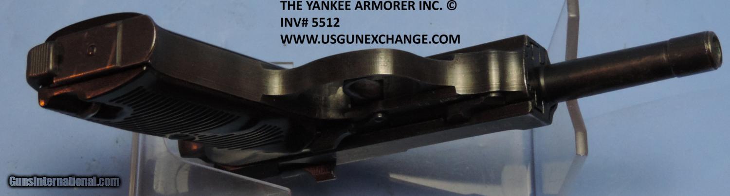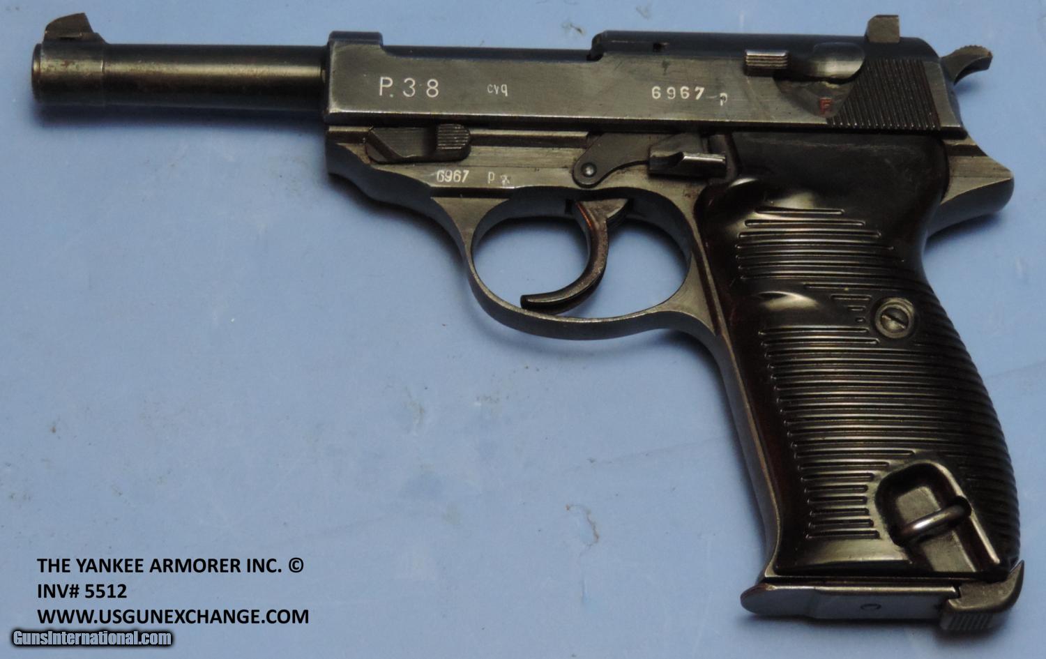 Description: Inv. 5512 Walther P-38 (cyq Code), Ser69XX p. Mr. Minty does it again. Another 98-99% original factory finish blue/ gun. A very slight bit of muzzle wear, just a touch of sharp edge silvering, an occasional pin prick and that's it. The grip strap show no toning. This gun is late war production so there are a couple of pinpoint casting flaws which is common on the late war guns, however is doesn't have the crude machining marks usually found on the "cyq". All numbered parts match. The slide is stamped Eagle/88, Eagle/ Swastika, Eagle/88. The frame Eagle/88. The black Bakelite grips are flawless reflecting the general condition of the gun. The bolt face and feed ramp show no evidence of use. The bore,likewise is bright with razor sharp grooves and lands and really no signs of graying. The gun comes with one correct magazine stamped Eagle?88. Just a really lovely package particularly with the holster offered below. It doesn't get much better..... $895. The holster is stamped, "jin", dated 1942, Eagle/WaA145 and in large letters P-38. The holster appears to be well worn on the front edge of the flap and cover strap. There are no wear holes and all stitching is intact. I believe the wear is from someone who may have been in a tank of some sort of vehicle. The original bring back tag attached to the holster .It shows it was brought back by Sgt. Michael Polese his service number XXXXXXXX. and that the gun is a "German Pistol, P-38, 9mm". The pair were purchased from the owner's estate exactly as they came from his duffel bag. What a lovely story they hold...$150. if purchased with the gun. If purchased separately. $185 To purchase this firearm or if you want to request more information contact us at: Email ckgunsymail Phone 201-512-0002 Cell 201-575-6838 FAX 201-215-4759 We accept most major credit cards. Prices shown are Discounted 3% for Cash or Check. The buyer must be familiar with all the laws governing the purchase and the ownership of firearms in their own city and state. The Yankee Armorer, Inc is not responsible for any failure to comply with or observe these laws. The Yankee Armorer, Inc will only ship after full payment and receipt of all required documents. Shipping: Add $35.00 for handguns, $45.00 for long guns. New Jersey buyers are subject to a 7% sales tax. The Yankee Armorer, Inc offers a 3 day inspection period with full refund upon return of intact firearm and in the original condition. The Yankee Armorer, Inc offers a no interest lay away program - 25% down; 25% in 30 days; 25% in 60 days; and full payment in 90 days. Any violation of this policy is subject to restocking and forfeiture of all payments. Any variation from this policy must be agreed to in advance. Unshipped Cancelled sales are subject to a 20% restocking fee. Be advised that all firearms sold by The Yankee Armorer, Inc. or the Gun Exchange, LLC (SELLER) are sold as collector’s items. They have not been fired or tested for safety and must be examined by a license gunsmith prior to use. By purchasing any item from the (SELLER), you are agreeing to hold the (SELLER) free from any damages or lawsuits of any nature. Any item left for transfer or storage will be charged to $25.00 per month, per item from the day of its receipt. Any variation from this policy must be agreed to in advance. Store hours 10:00 am to 5:00 pm Tuesday -Saturday. It's always best to call for appointment. Store 201-512-0002, cell 201-575-6838. SOLD Curio/Relic: Yes |