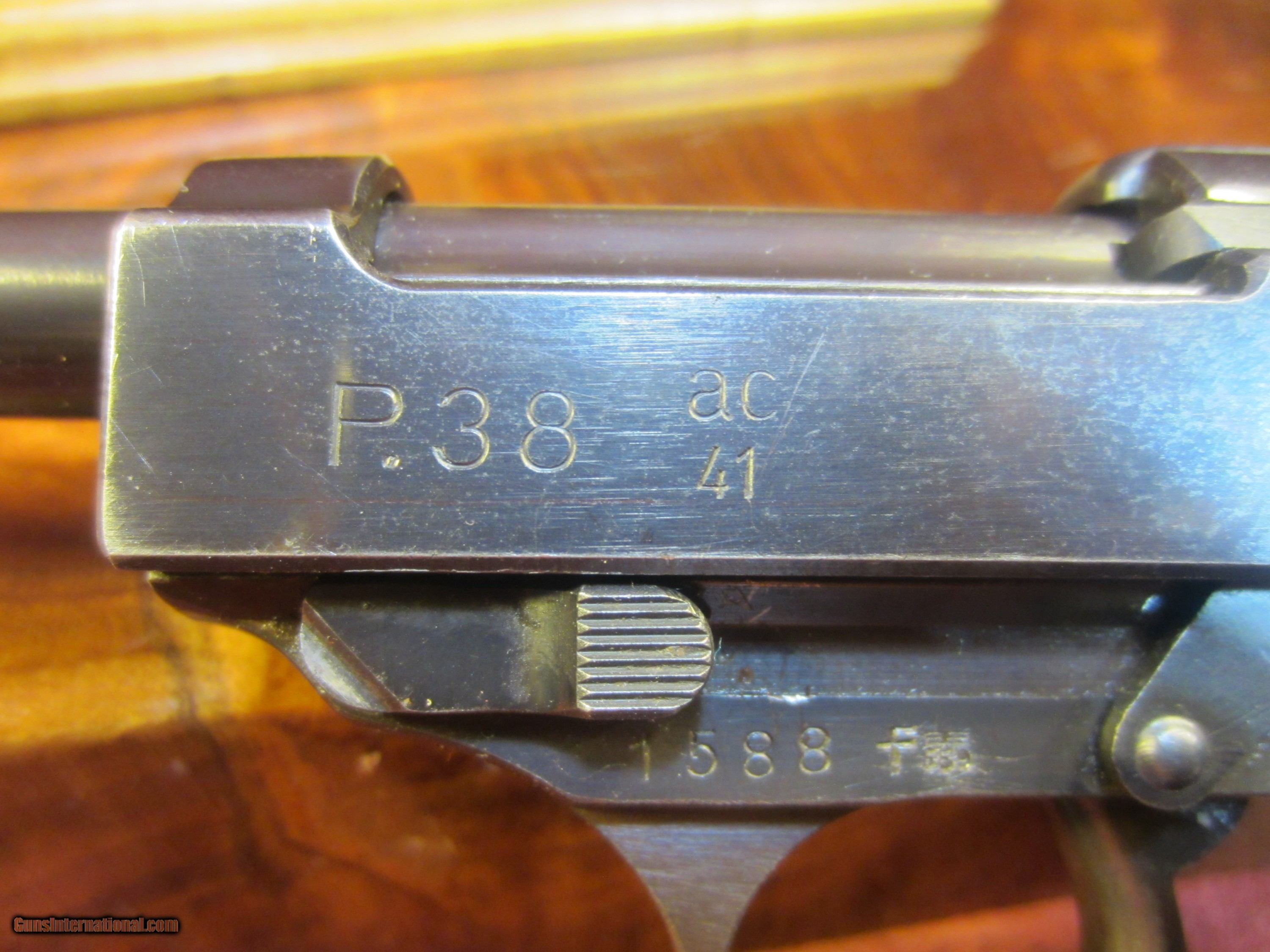 Description: Walther P-38 MFG 1941 9mm Cal All matching serial number. Serial Number #1588F Condition 85% Original blue. SOLD |