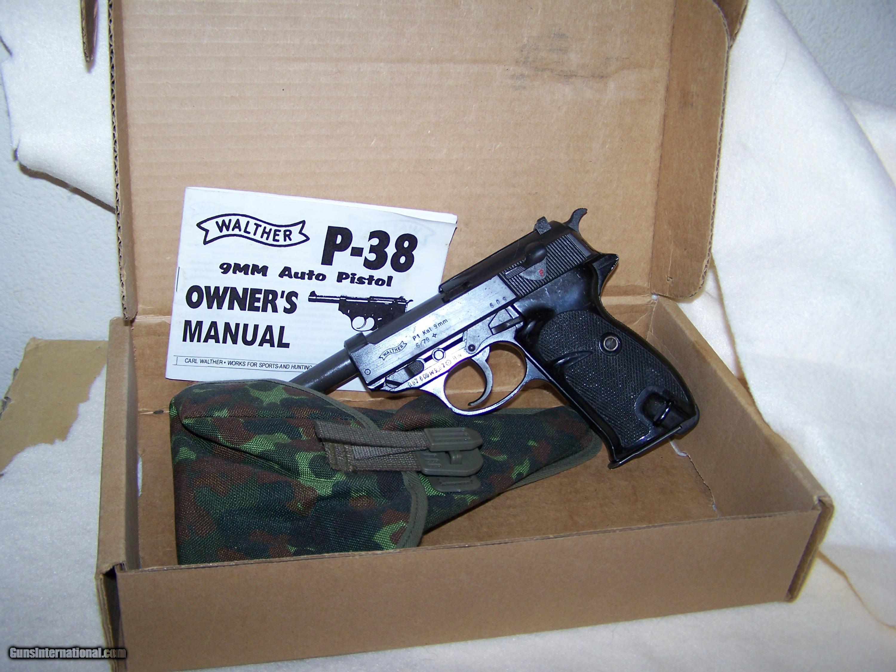 Description: Walther P-38 / P-1.Cal. 9mm. Pistole is unissued / unfired ?. Complete with origional shipping box, manual, and holster. manufactured in 1979. Has re enforced slide. SOLD Manufacturer: Walther Model: P-38 / P-1 Caliber Info: 9mm Bore: mint Condition: unissued Finish: parkarized Manufacture Date: 1979 Extras: Shipping box, manual, holster |